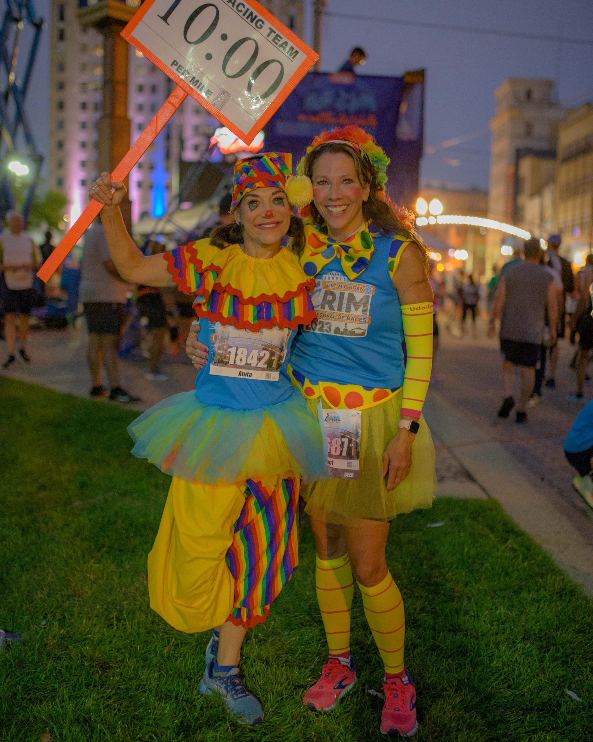 Runners warm up for the 46th annual HAP Crim Festival of Races in downtown Flint, Mich. on Saturday, Aug. 26, 2023. (Michael Indriolo | Flint Beat)Traci Montpas and Anita Harless pose for a photo during the 46th annual HAP Crim Festival of Races in downtown Flint, Mich. on Saturday, Aug. 26, 2023. “We’re clowning around at the Crim,” Harless said. (Michael Indriolo | Flint Beat)