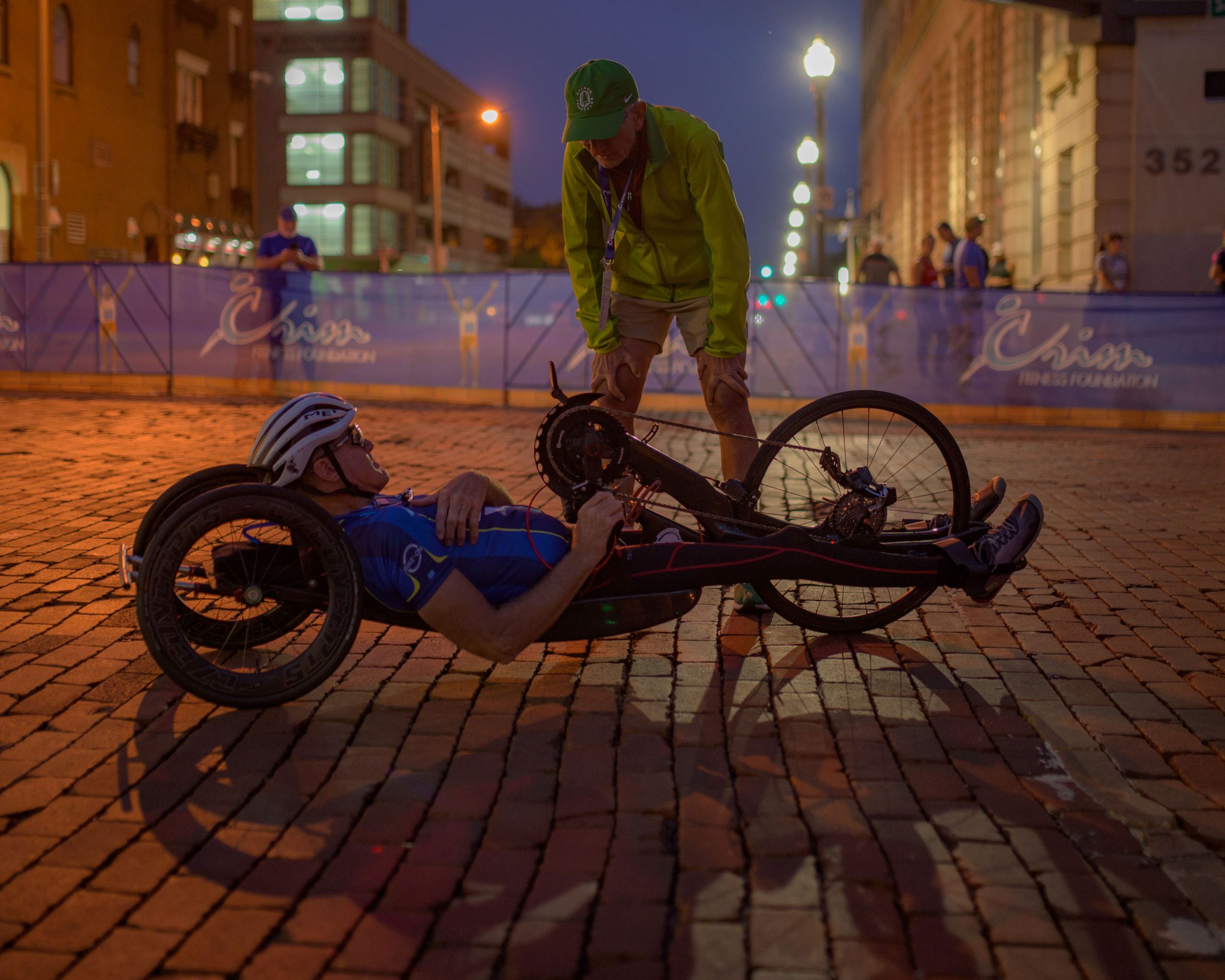 Finish line announcer Scott Hubbard talks with hand cyclist Steve Chapman during the 46th annual HAP Crim Festival of Races in downtown Flint, Mich. on Saturday, Aug. 26, 2023. (Michael Indriolo | Flint Beat)