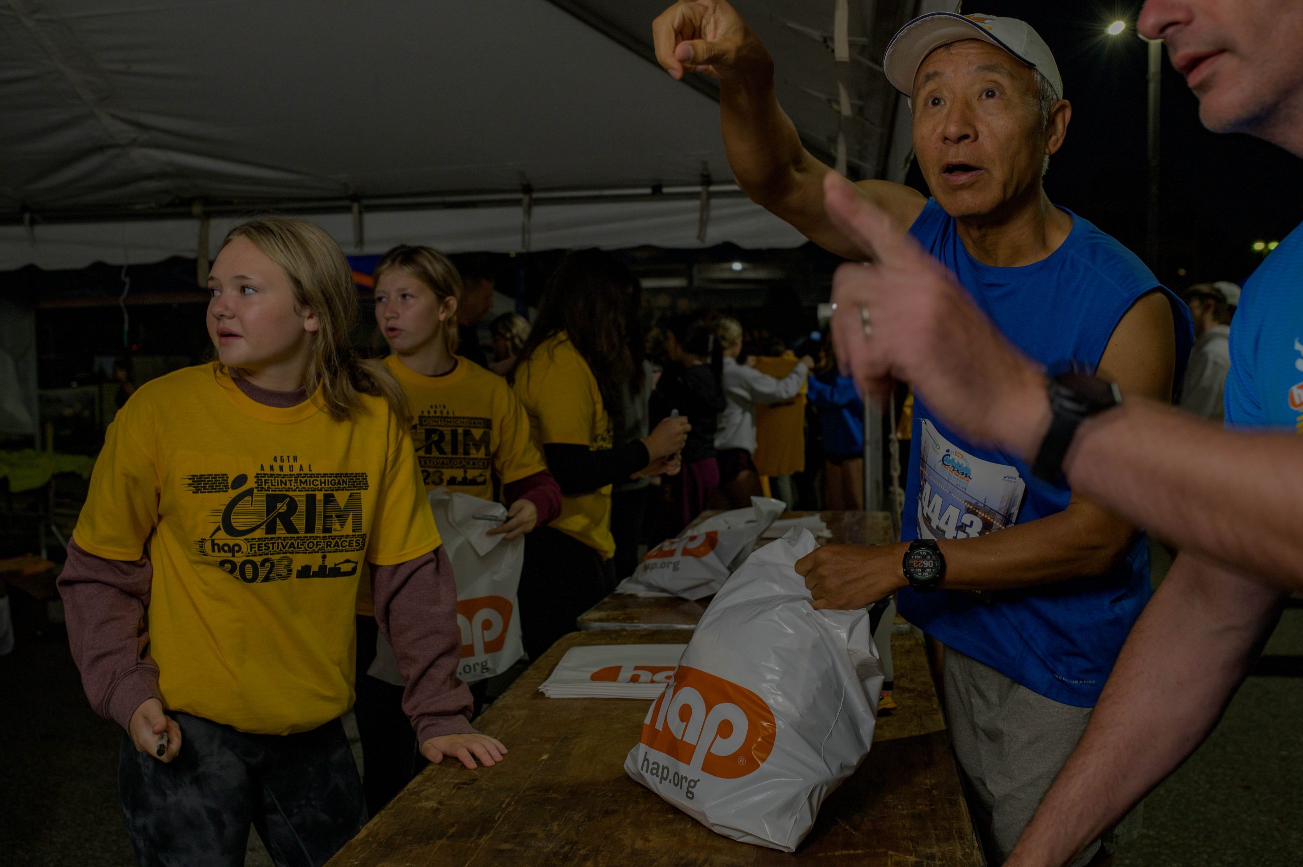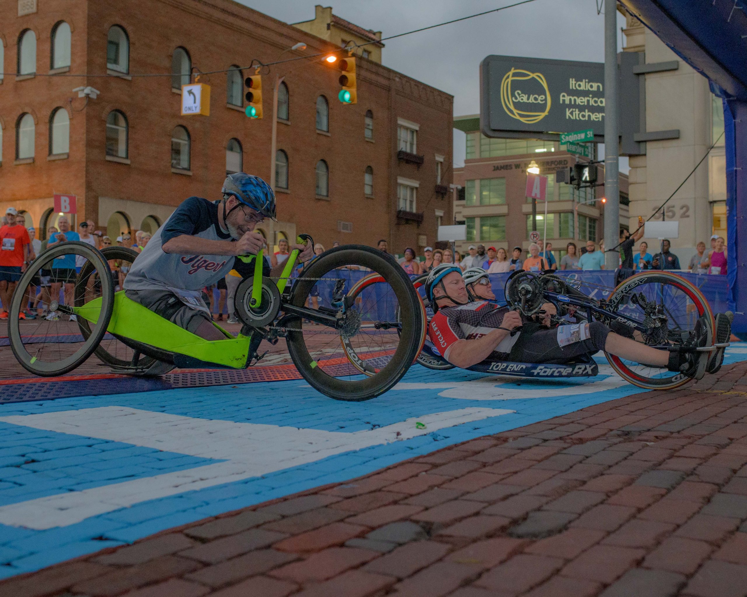 Runners check in for the 46th annual HAP Crim Festival of Races in downtown Flint, Mich. on Saturday, Aug. 26, 2023. (Michael Indriolo | Flint Beat)Dan Howe and Tim Potter pose for a photo during the 46th annual HAP Crim Festival of Races in downtown Flint, Mich. on Saturday, Aug. 26, 2023. (Michael Indriolo | Flint Beat)Hand cyclists Steve Chapman and Travis Peruski talk at the start line ahead of their race during the 46th annual HAP Crim Festival of Races in downtown Flint, Mich. on Saturday, Aug. 26, 2023. (Michael Indriolo | Flint Beat)Powers Cathlic High School students sing the National Anthem during the 46th annual HAP Crim Festival of Races in downtown Flint, Mich. on Saturday, Aug. 26, 2023. (Michael Indriolo | Flint Beat)Hand cyclists take off from the start line during the 46th annual HAP Crim Festival of Races in downtown Flint, Mich. on Saturday, Aug. 26, 2023. (Michael Indriolo | Flint Beat)