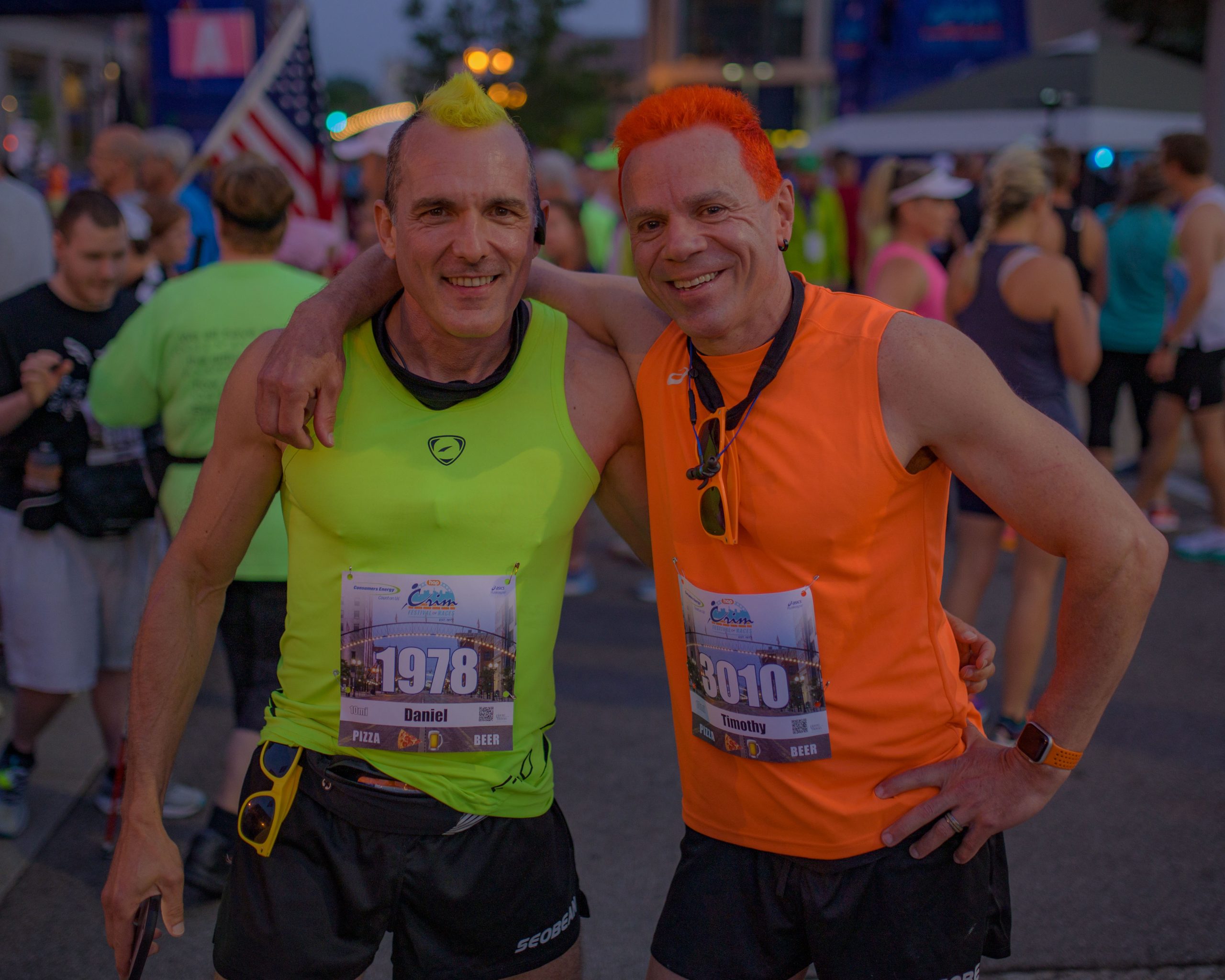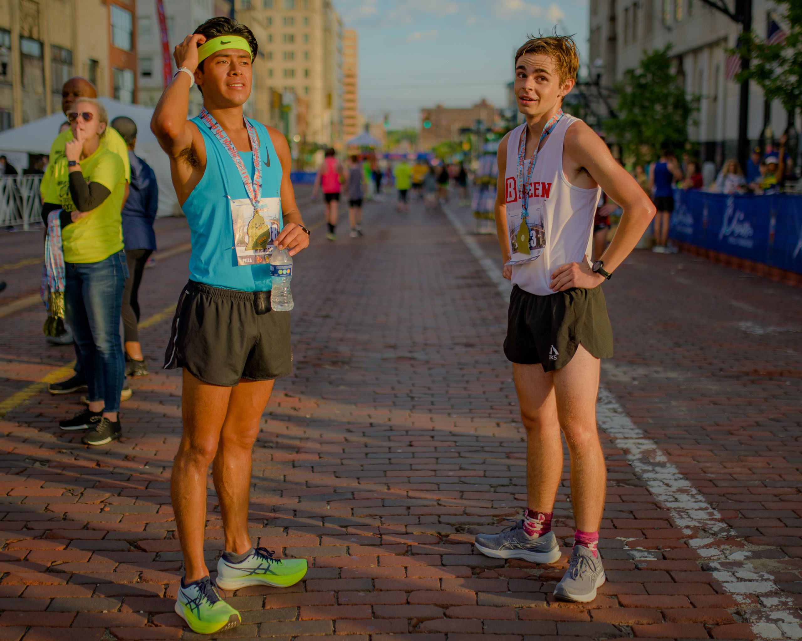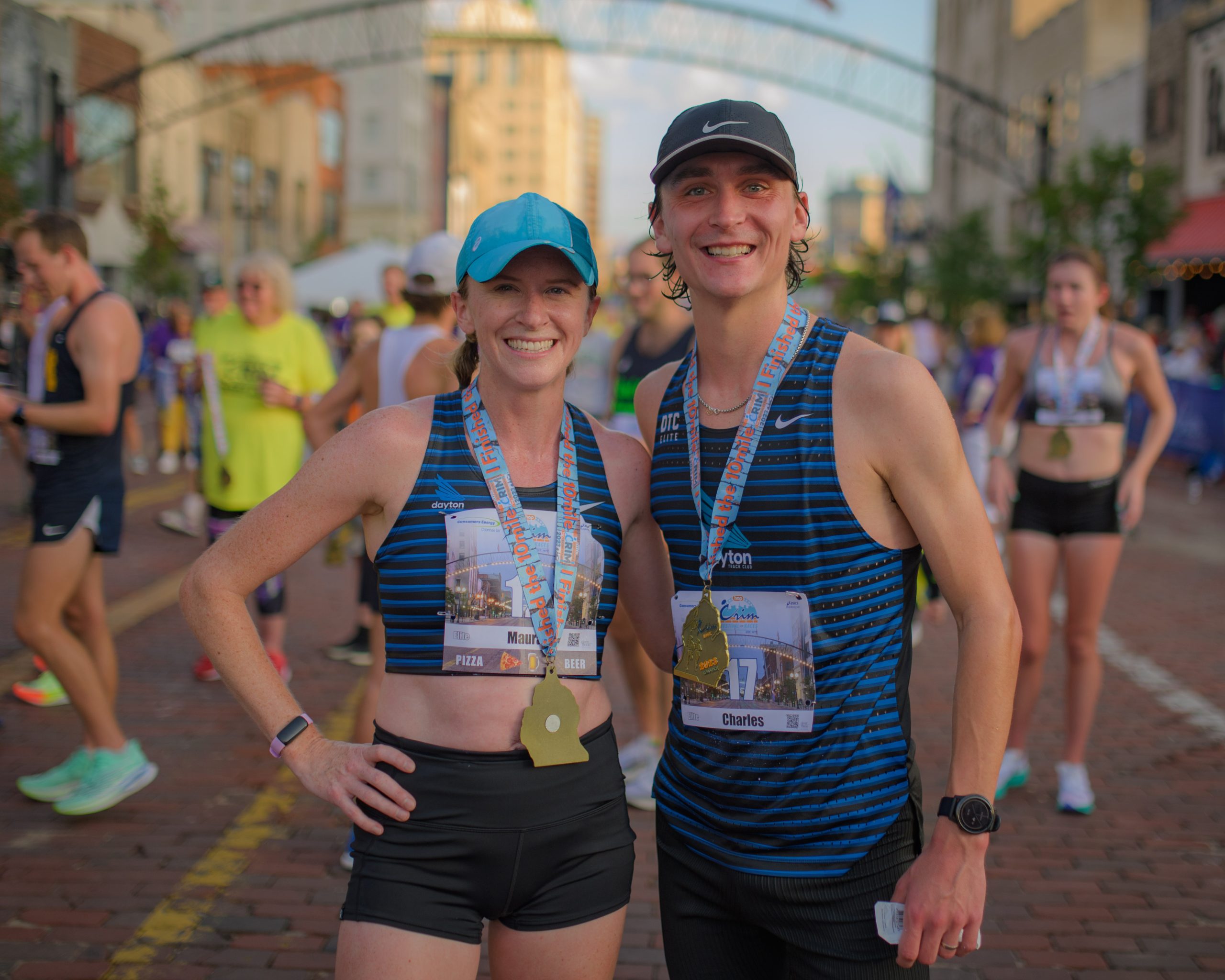 Charles Rodeheffer and Maura Lemon pose for a photo after finishing the 10-mile race during the 46th annual HAP Crim Festival of Races in downtown Flint, Mich. on Saturday, Aug. 26, 2023. (Michael Indriolo | Flint Beat)
