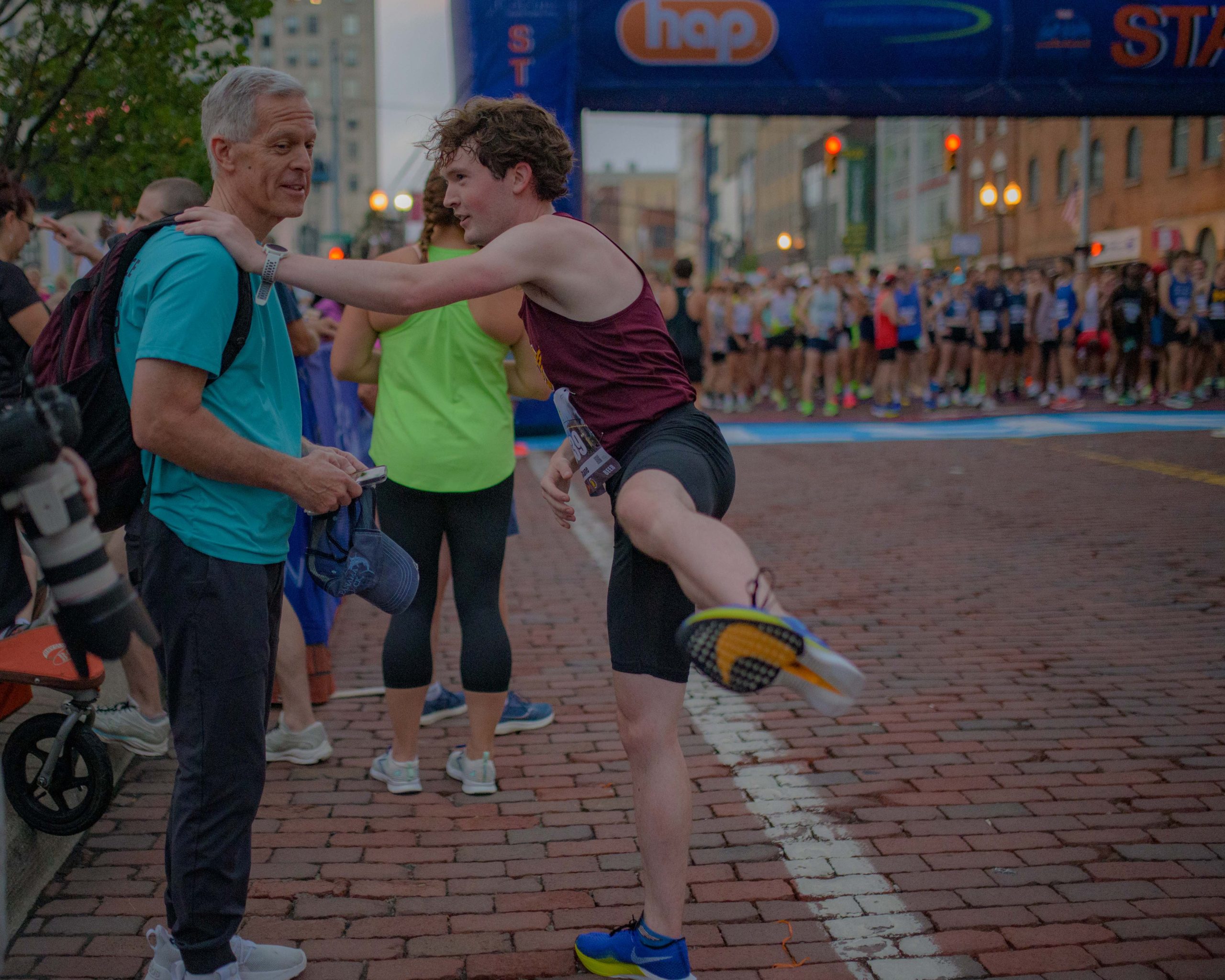 Shane Fitzpatrick rests on his father Walter Fitzpatrick as he stretches in preperation for the 10-mile race during the 46th annual HAP Crim Festival of Races in downtown Flint, Mich. on Saturday, Aug. 26, 2023. Shane’s goal was to beat his father’s time of 1:14, he said. (Michael Indriolo | Flint Beat)