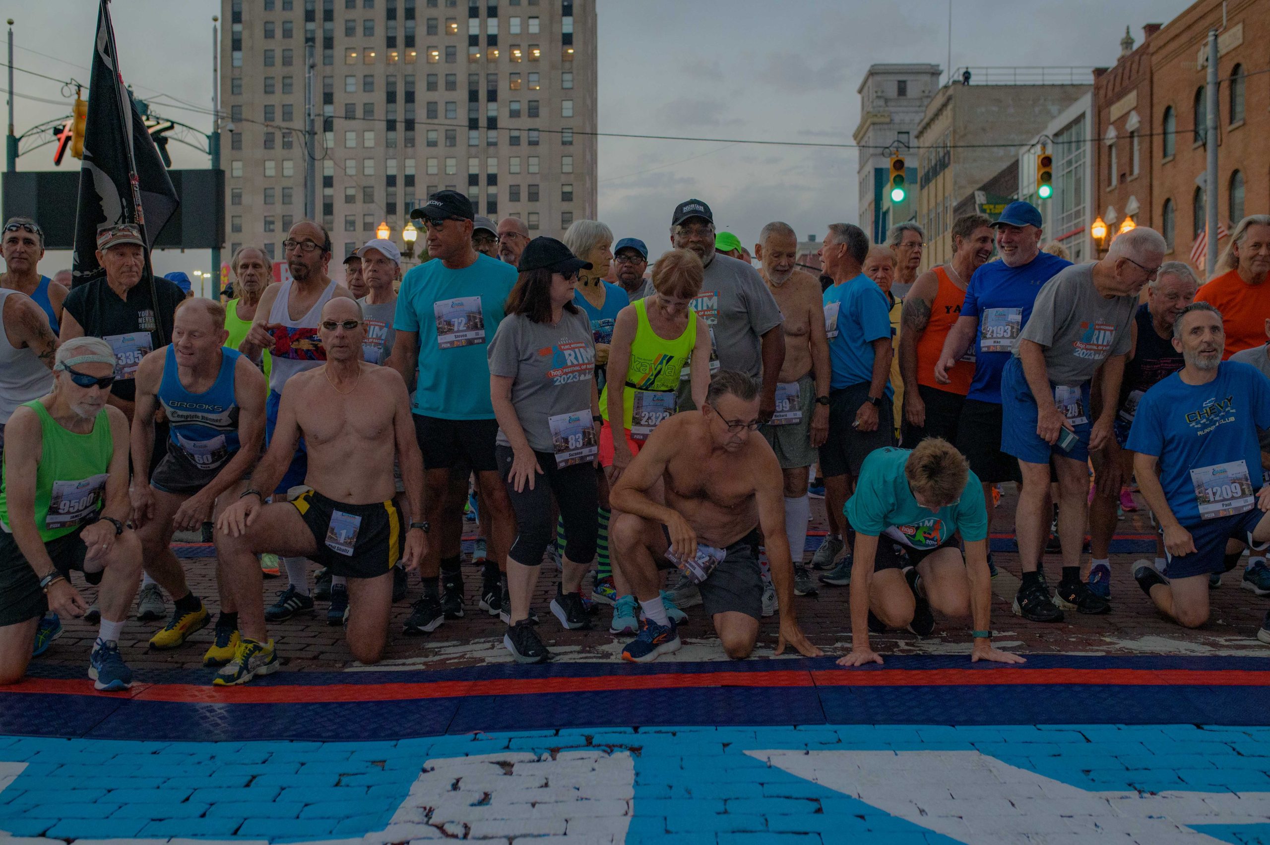 30-year racers line up at the start line ahead of their race during the 46th annual HAP Crim Festival of Races in downtown Flint, Mich. on Saturday, Aug. 26, 2023. (Michael Indriolo | Flint Beat)