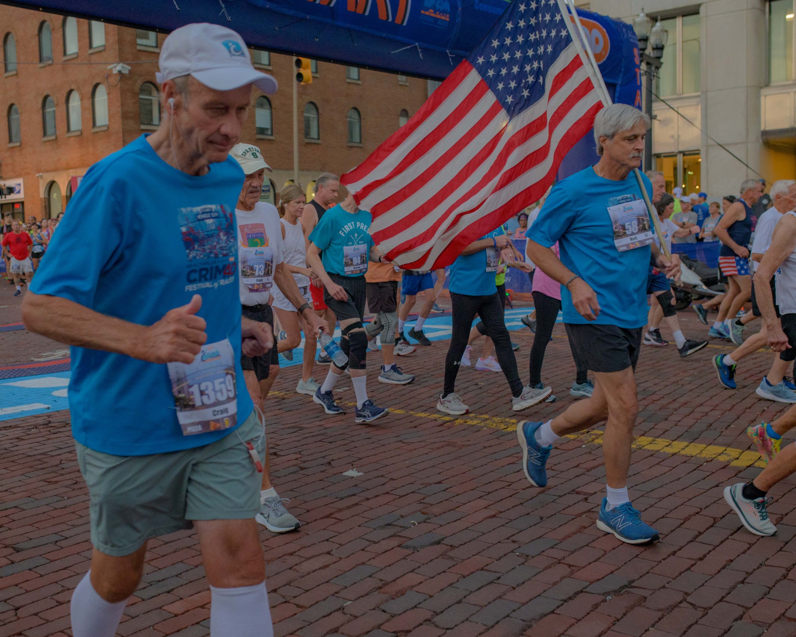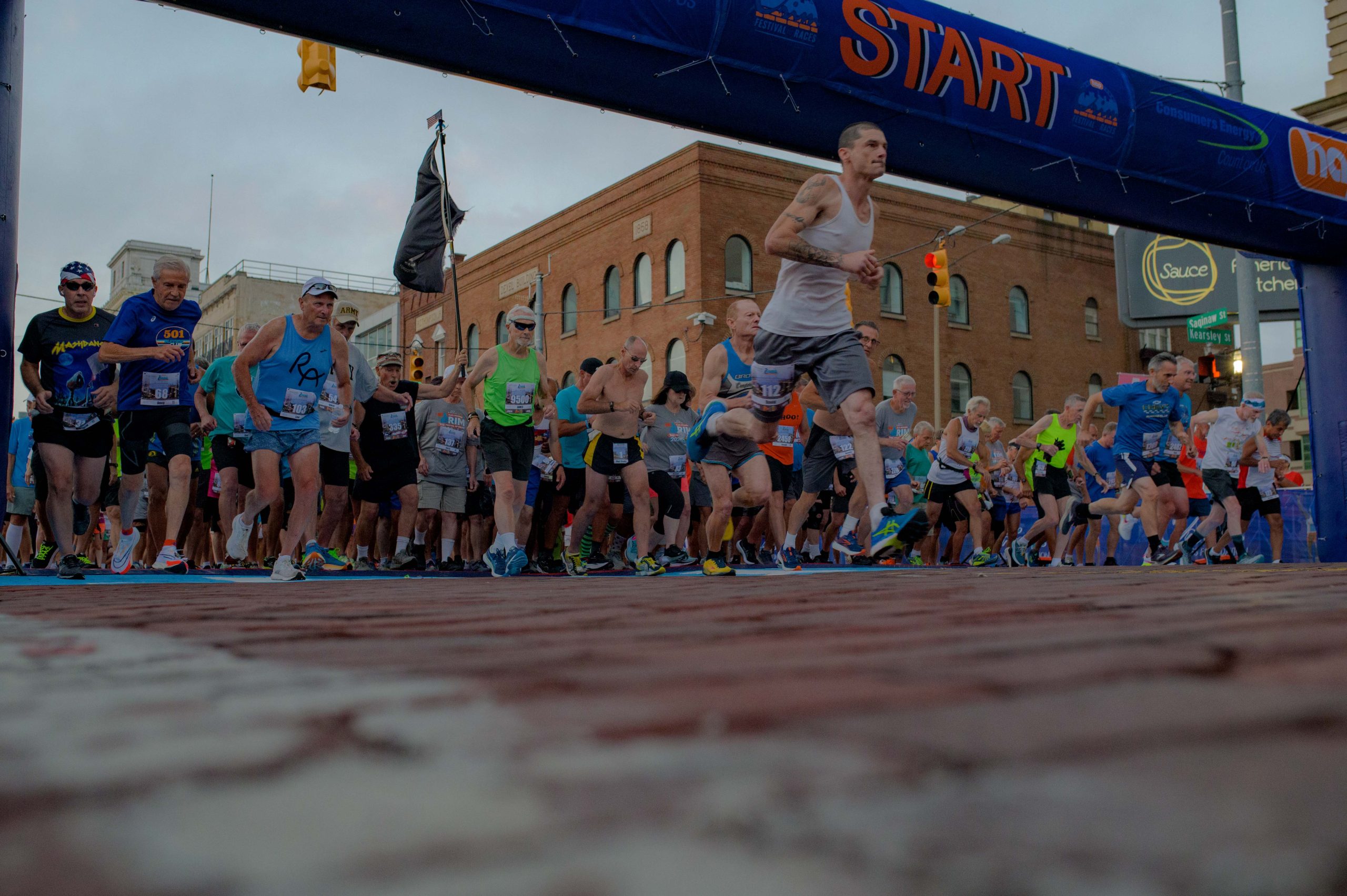 30-year racers line up at the start line ahead of their race during the 46th annual HAP Crim Festival of Races in downtown Flint, Mich. on Saturday, Aug. 26, 2023. (Michael Indriolo | Flint Beat)30-year racers take off from the start line during the 46th annual HAP Crim Festival of Races in downtown Flint, Mich. on Saturday, Aug. 26, 2023. (Michael Indriolo | Flint Beat)