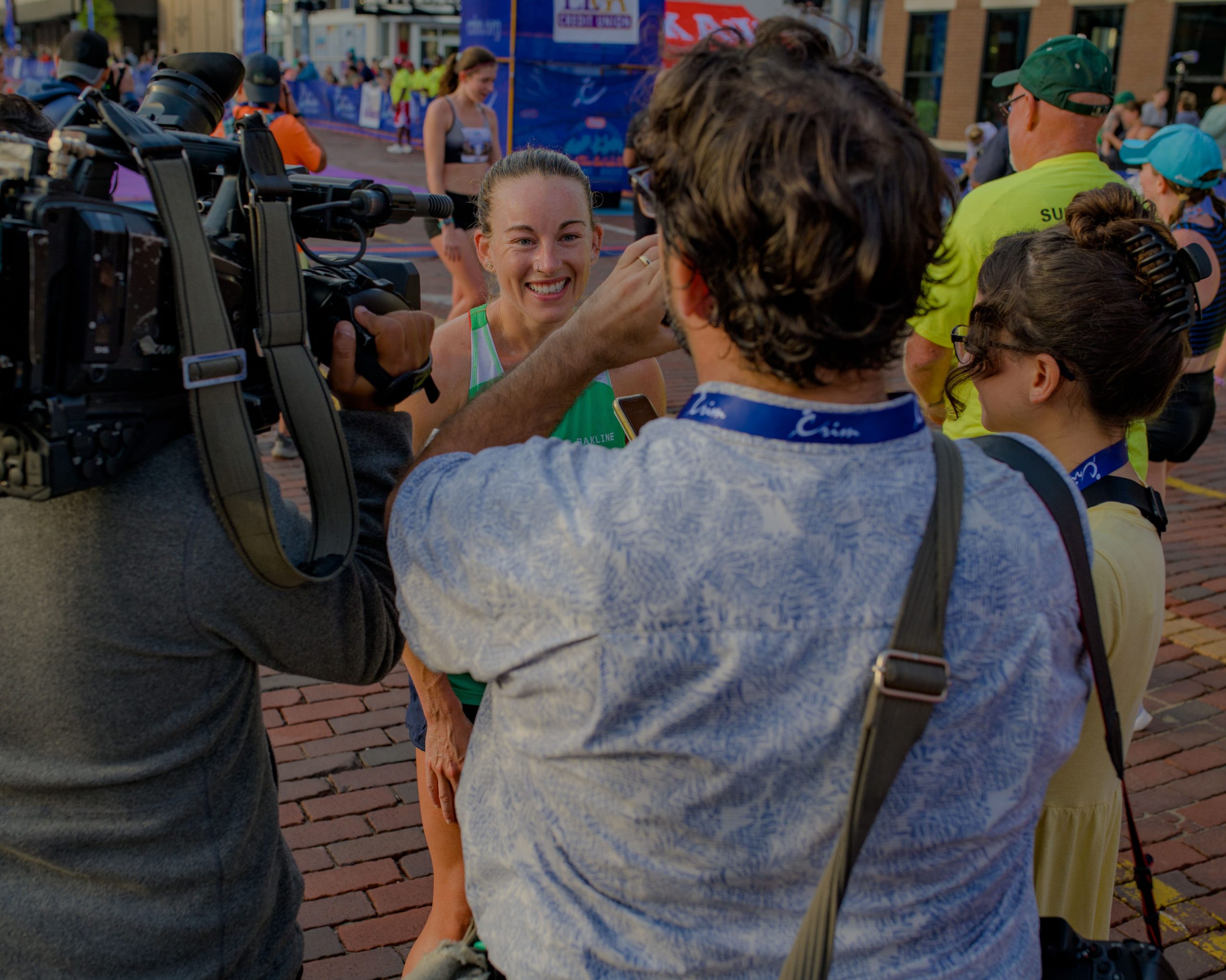 Sydney Devore talks with reporters after finishing first for women in the 10-mile during the 46th annual HAP Crim Festival of Races in downtown Flint, Mich. on Saturday, Aug. 26, 2023. (Michael Indriolo | Flint Beat)