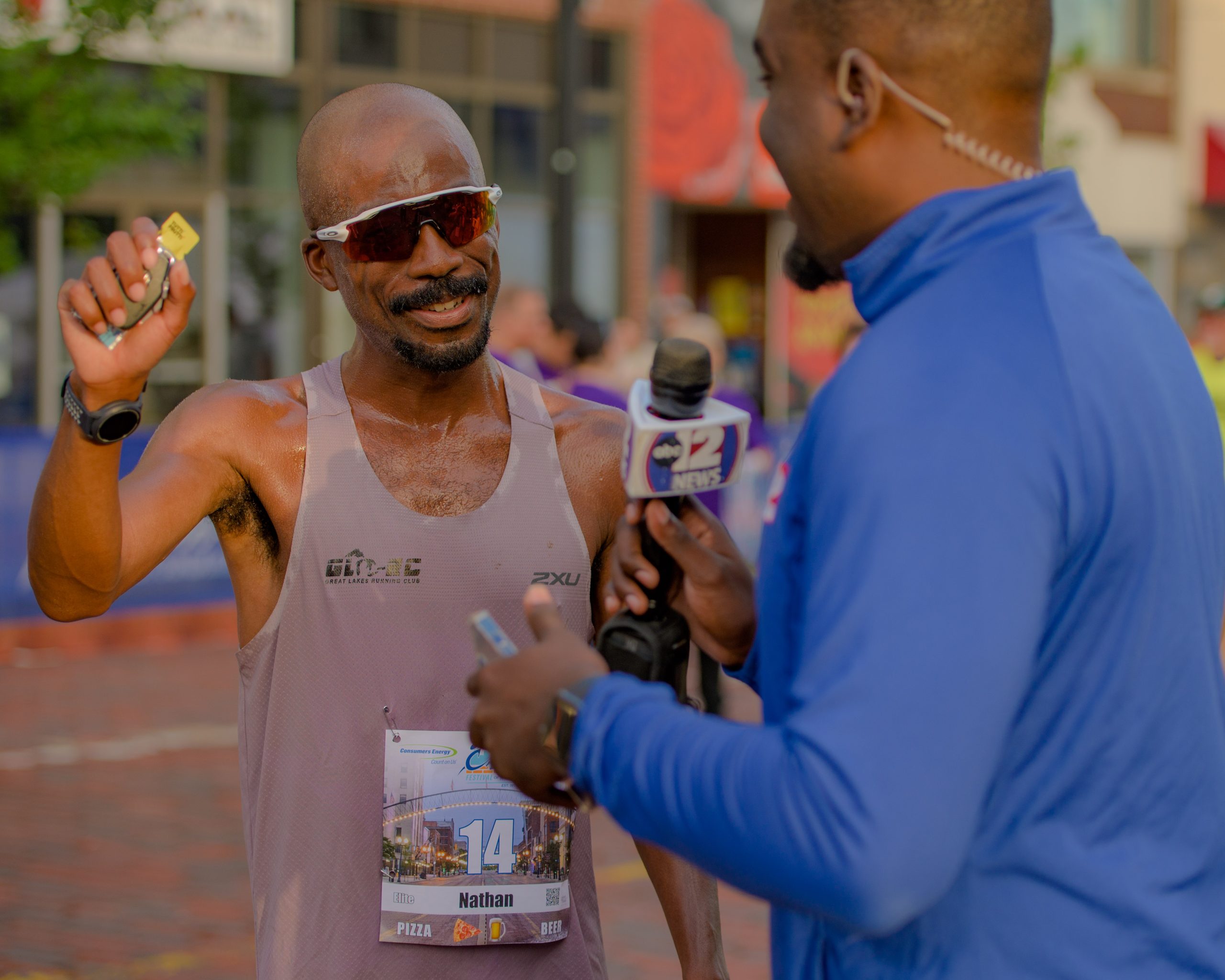 Nathan Martin talks with reporters after finishing first overall in the 10-mile during the 46th annual HAP Crim Festival of Races in downtown Flint, Mich. on Saturday, Aug. 26, 2023. (Michael Indriolo | Flint Beat)