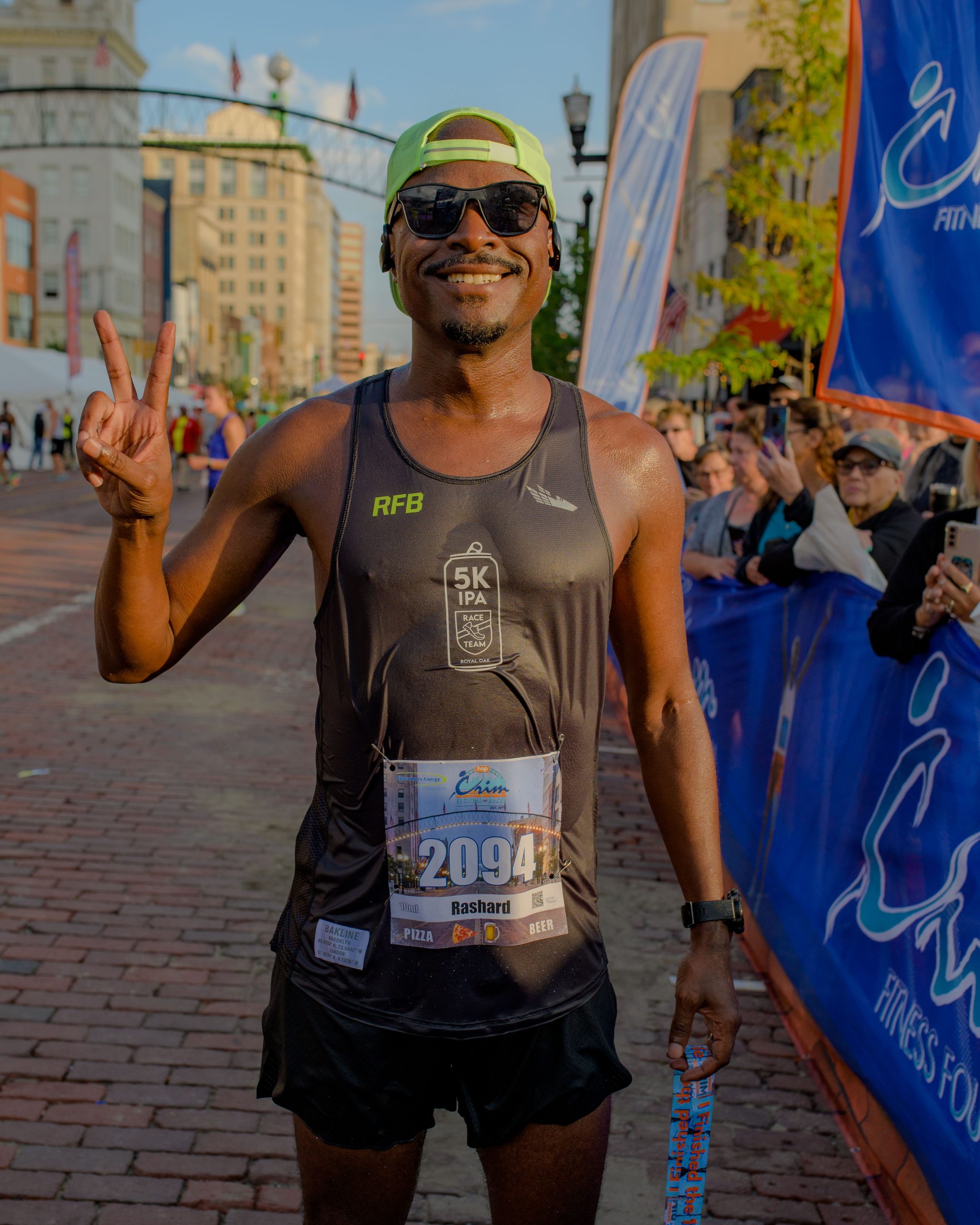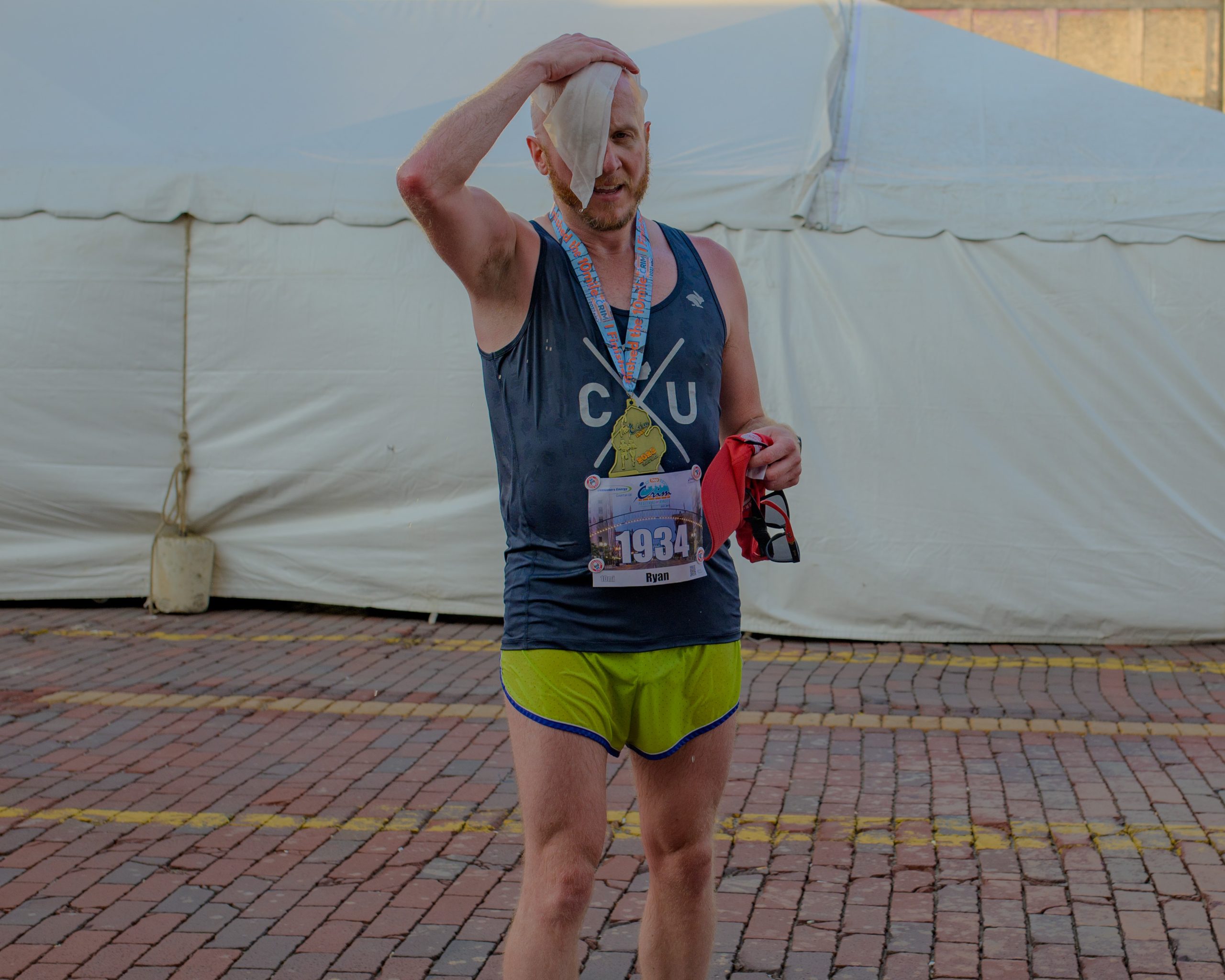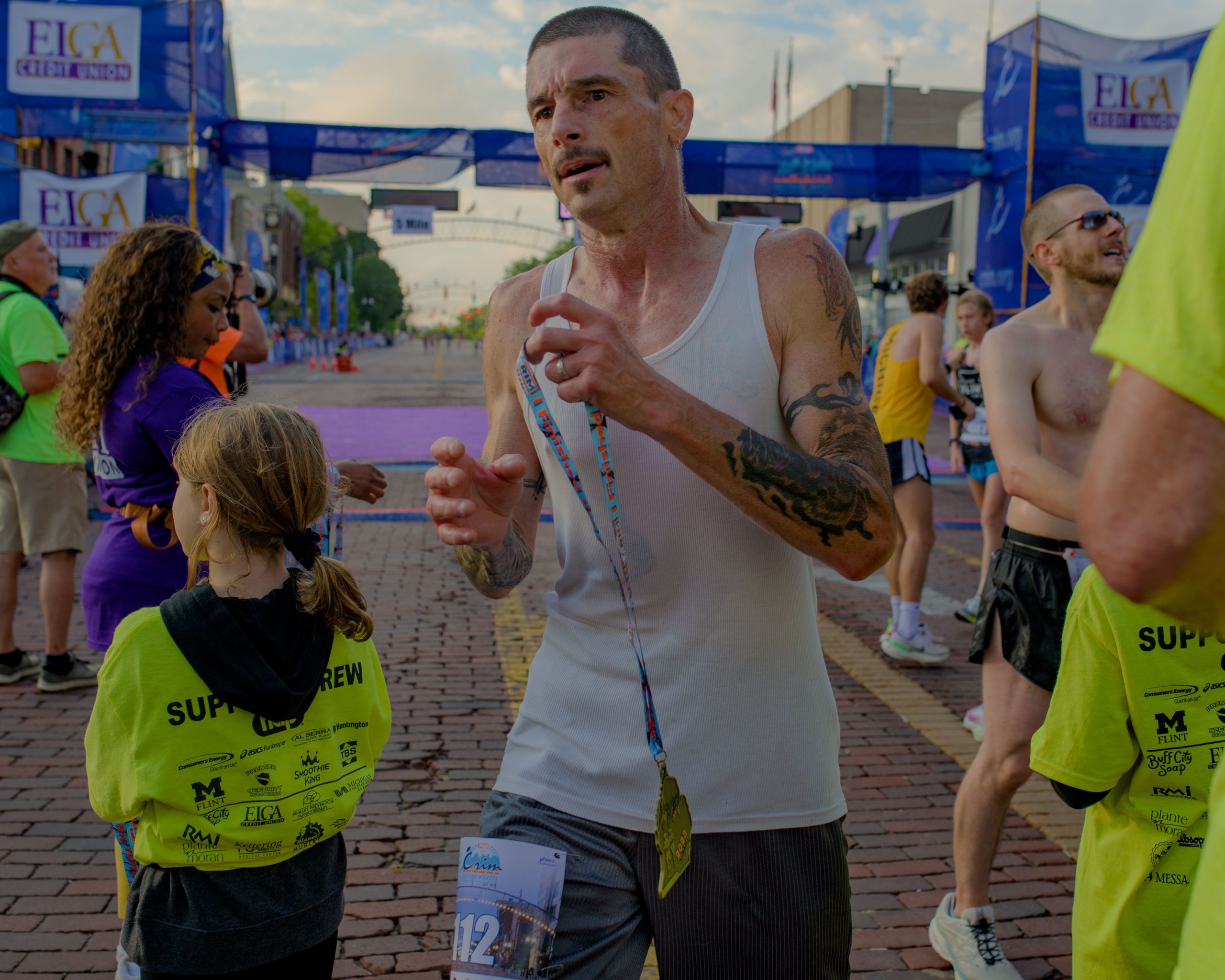 Ryan Hladik throws a wet towel over his face after finishing the 10-mile race during the 46th annual HAP Crim Festival of Races in downtown Flint, Mich. on Saturday, Aug. 26, 2023. (Michael Indriolo | Flint Beat)Runners catch up after finishing the 10-mile race during the 46th annual HAP Crim Festival of Races in downtown Flint, Mich. on Saturday, Aug. 26, 2023. (Michael Indriolo | Flint Beat)Rashard Jones poses for a photo after finishing the 10-mile race during the 46th annual HAP Crim Festival of Races in downtown Flint, Mich. on Saturday, Aug. 26, 2023. (Michael Indriolo | Flint Beat)