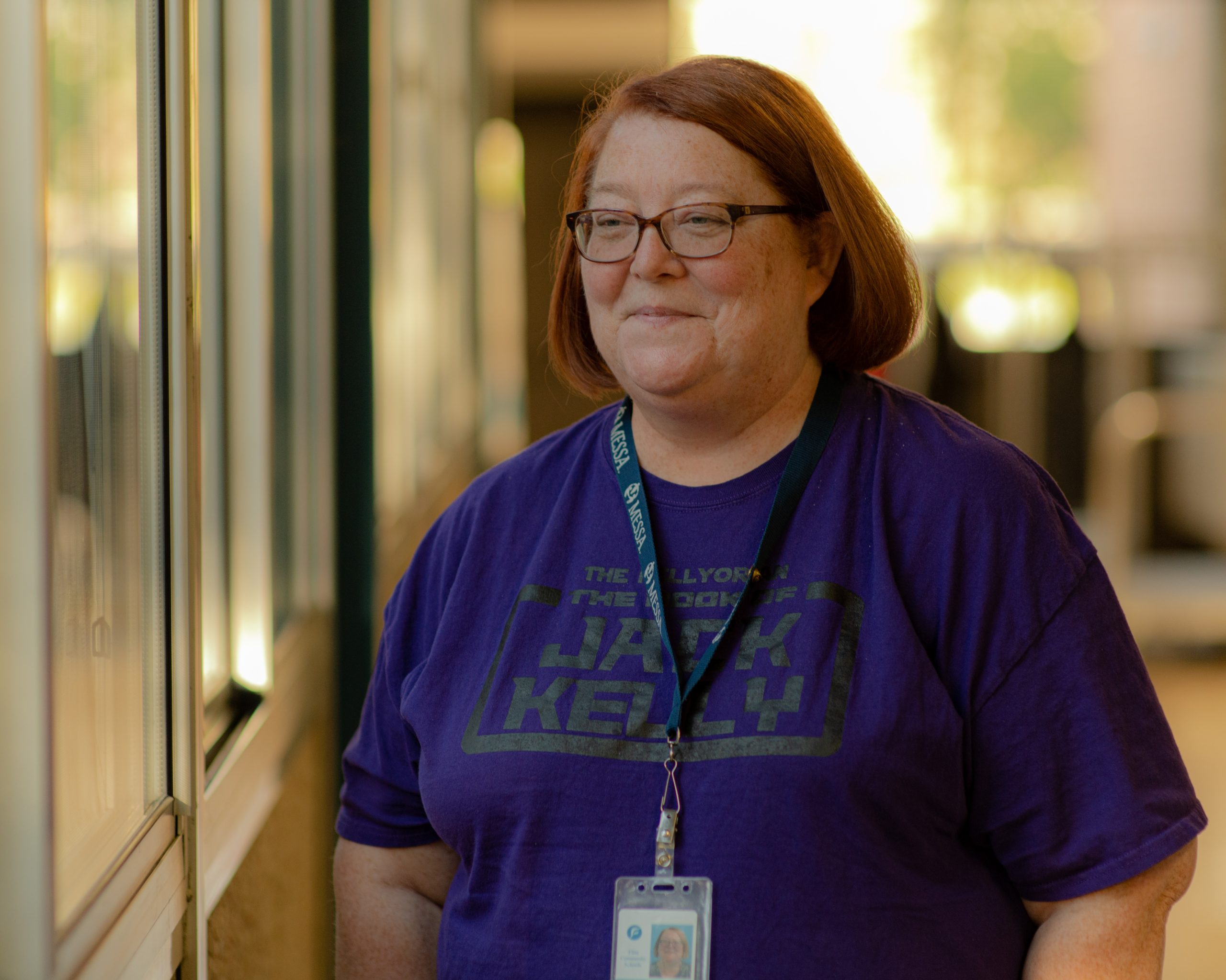 Karen Christian, a teacher at Potter Elementary School who serves as the president of the United Teachers of Flint, poses for a portrait outside the Flint Community Schools Board of Education meeting at Accelerated Learning Academy in Flint, Mich. on Wednesday, May 10, 2023. (Michael Indriolo | Flint Beat)