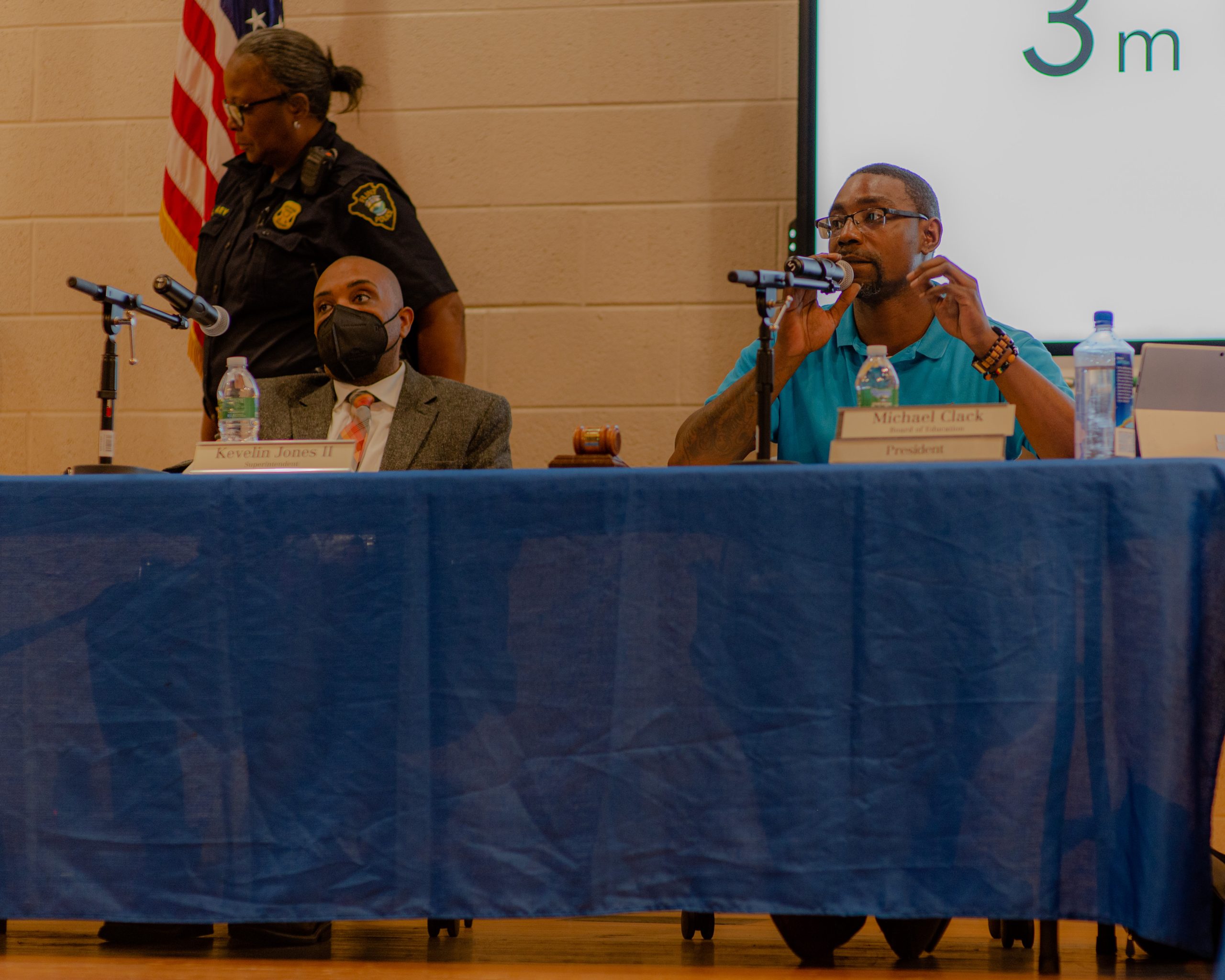 Michael Clack (right), president of the Flint Community Schools Board of Education, asks a Flint police officer to enforce the speaking time limit after Sue Clegg, a teacher at Potter Elementary School, continued to speak beyond her allotted time during the Board’s meeting at Accelerated Learning Academy in Flint, Mich. on Wednesday, May 10, 2023. The next speaker in line, a teacher at Southwestern Classical Academy, gave up some of her time so Clegg could continue her speech. (Michael Indriolo | Flint Beat)