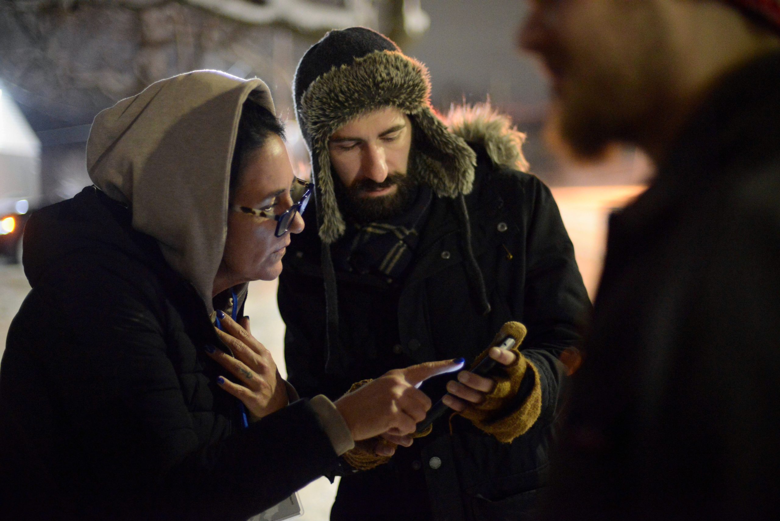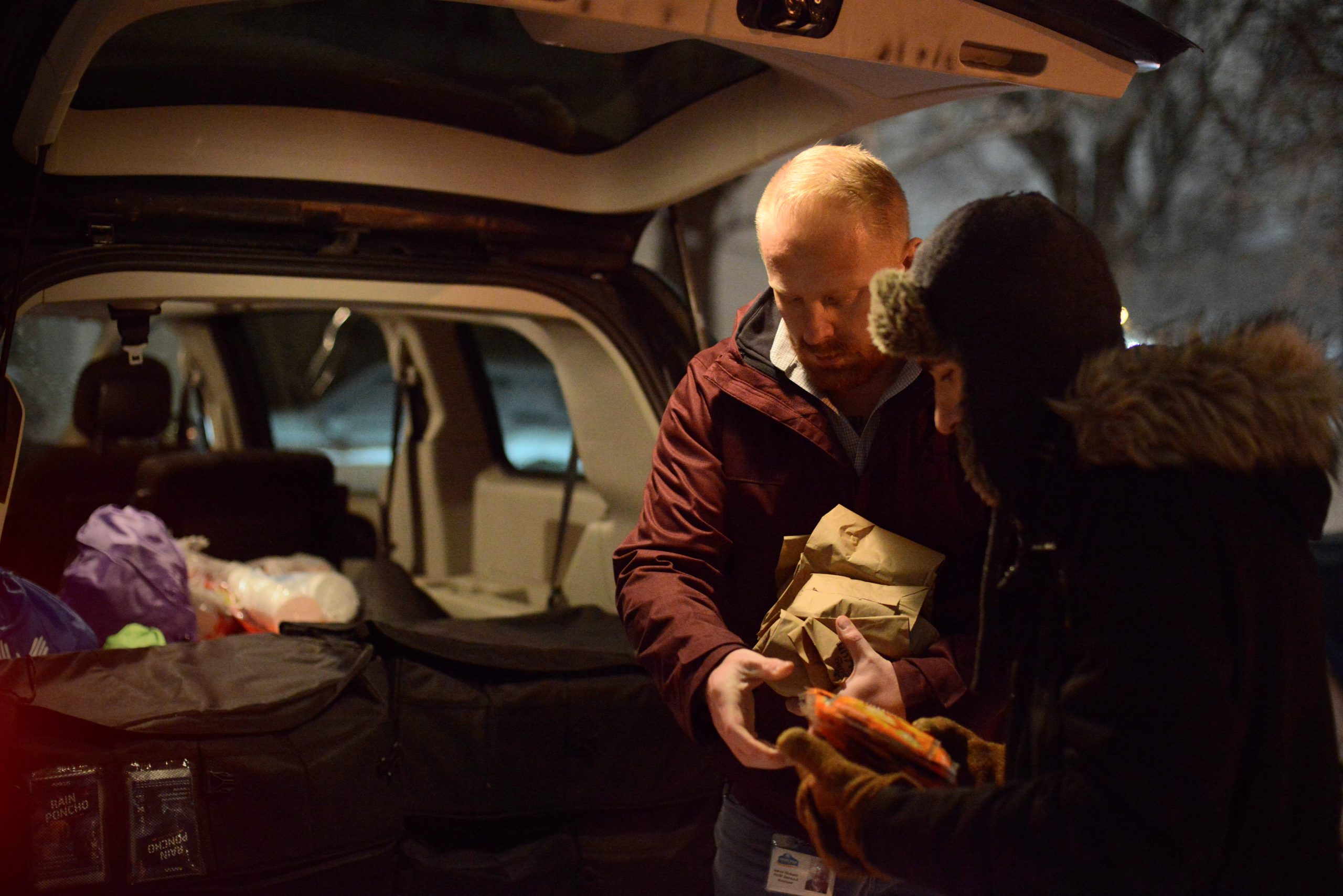 While Humphrey stayed behind to support surveyors on the ground, the teams headed into the cold winter night—a winter weather advisory was in effect—loading community donations such as food, clothing, blankets, hand and foot warmers into their cars.