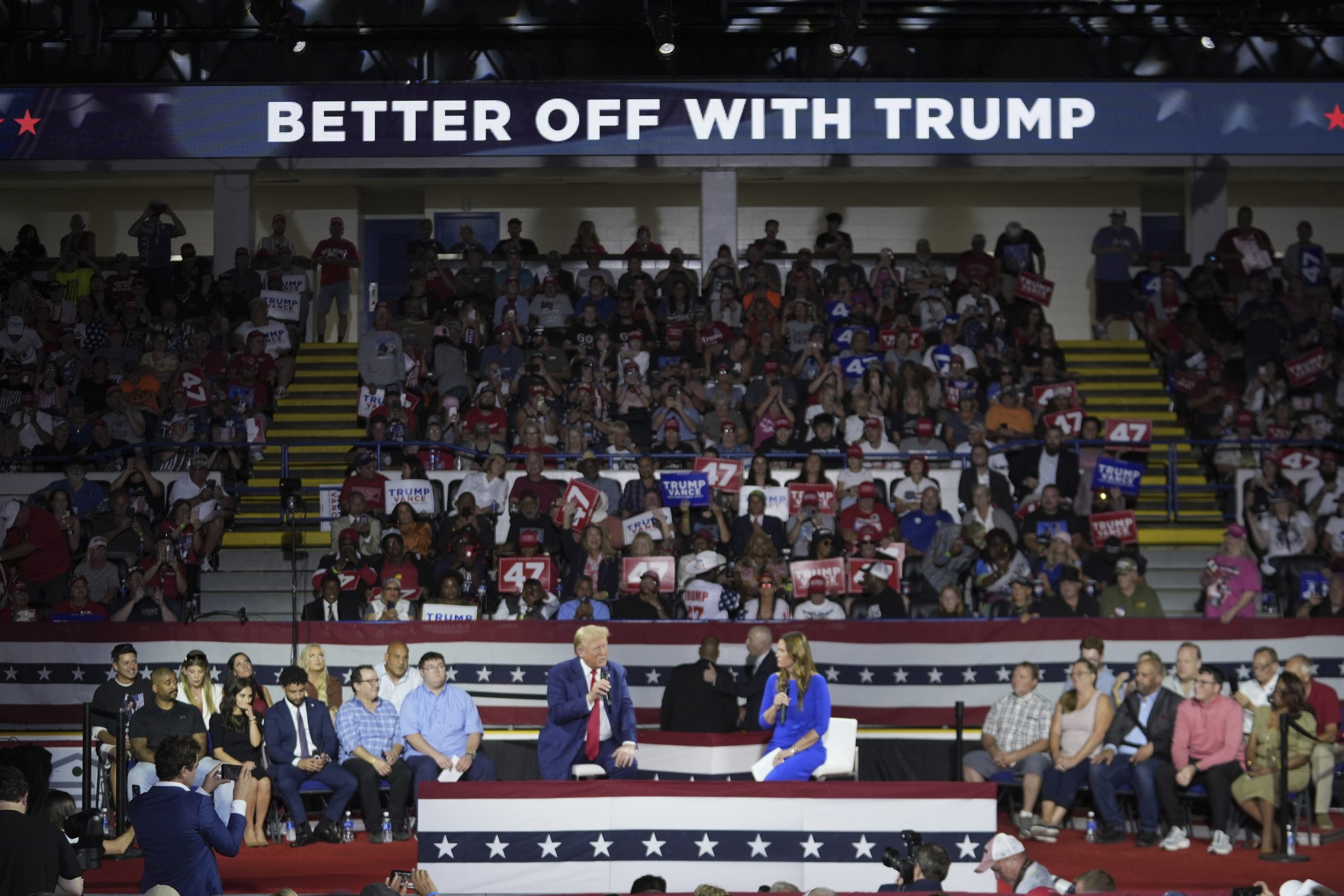 The Michigan town hall was billed as focusing on the auto industry, a pillar of the battleground state. Trump alleged Democrats would undercut American car manufacturing by pushing for the adoption of electric vehicles and repeated false claims that Chinese automakers are building large factories across the border in Mexico to flood the U.S. with vehicles.
