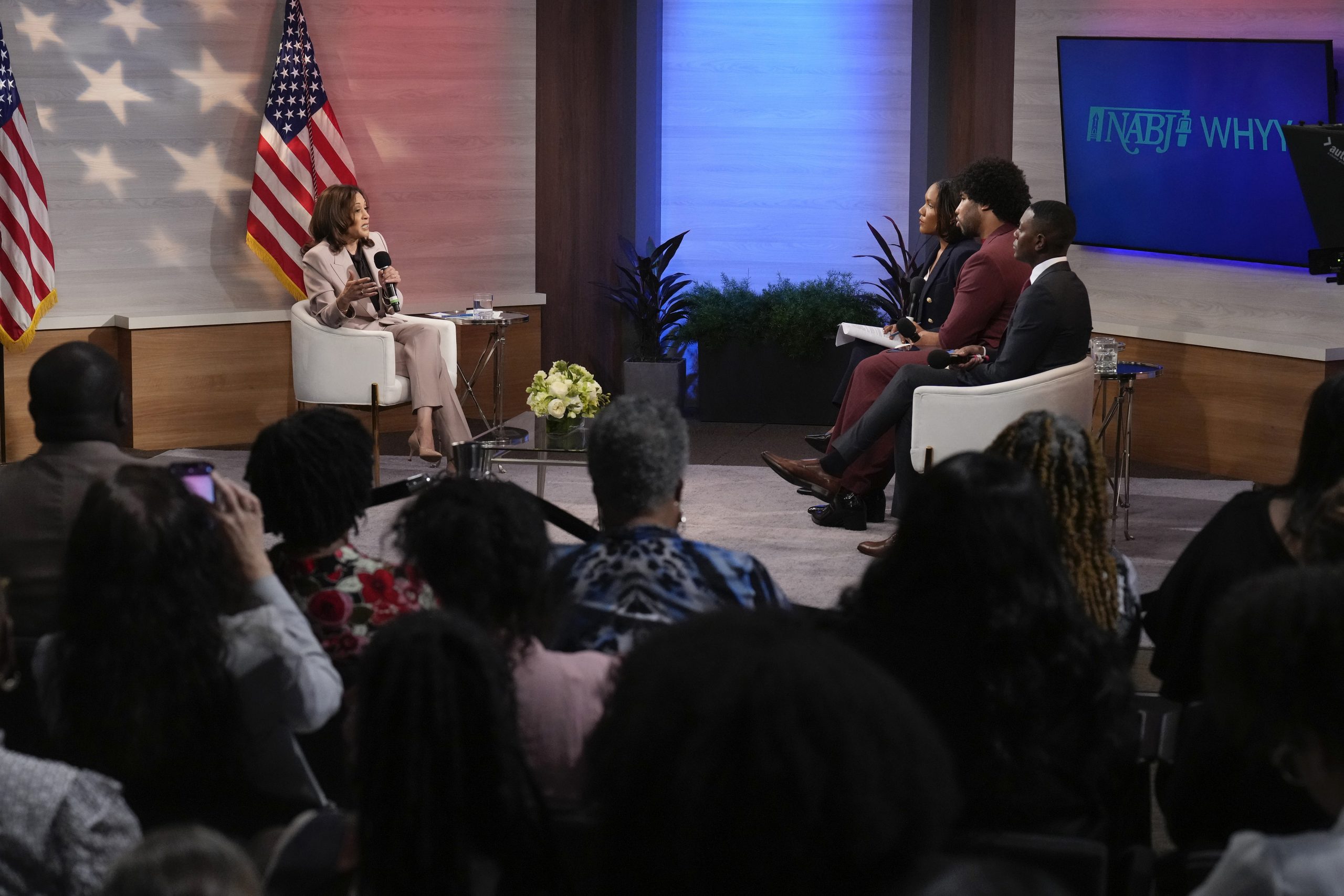 Harris answered questions from three association journalists at a small, relatively quiet venue at the Philadelphia studios of public radio station WHYY. That was very different from Trump’s addressing the NABJ conference in Chicago in July, when he was antagonistic to the moderators and sparked an uproar by questioning the vice president’s racial identity.
