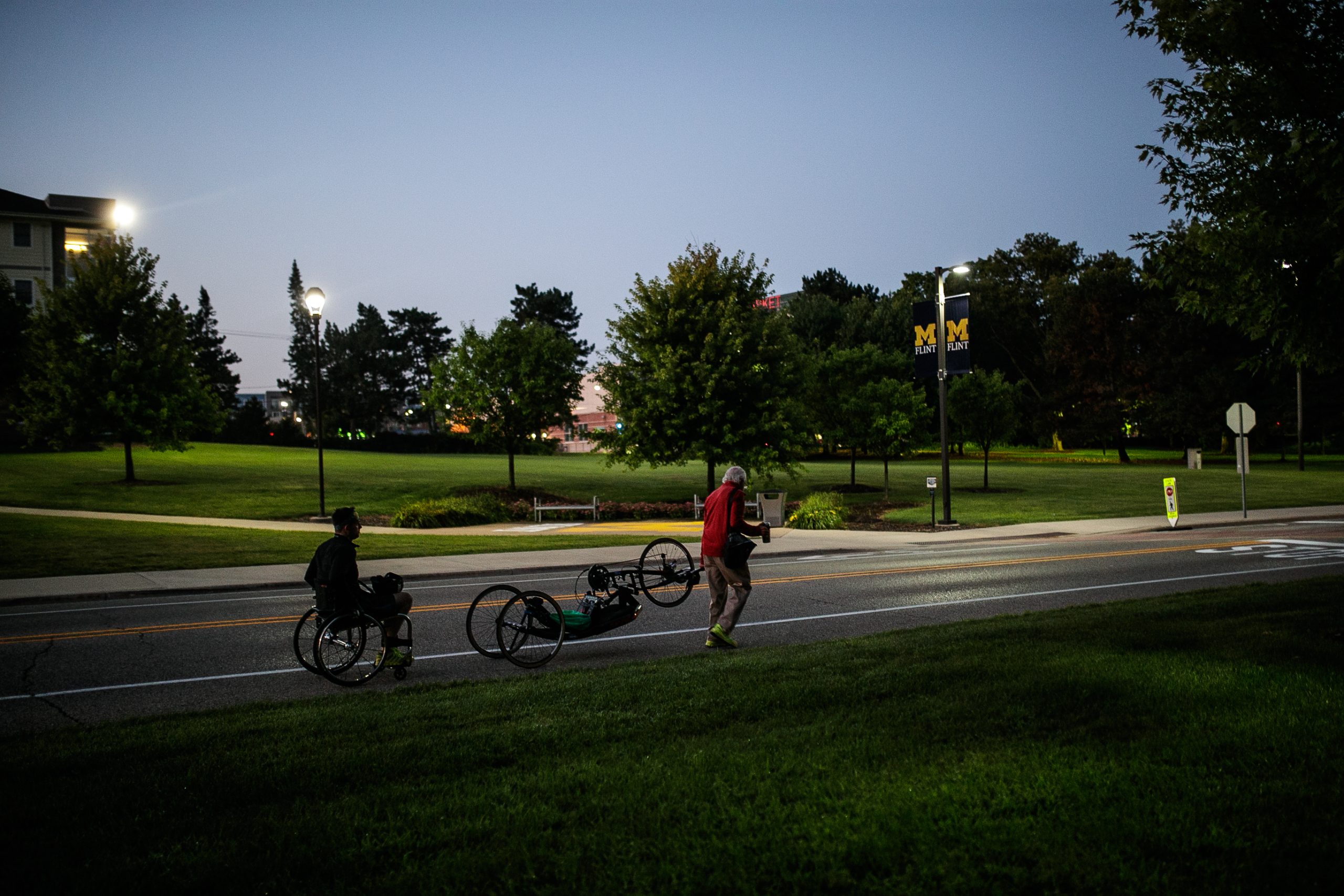 Douglas Edmonson and his grandfather Bernie Mueslik make their way through University of Michigan – Flint’s campus to reach the starting line during the 45th annual Crim Festival of Races on Saturday, Aug. 27, 2022 in downtown Flint. (Jenifer Veloso | Flint Beat)