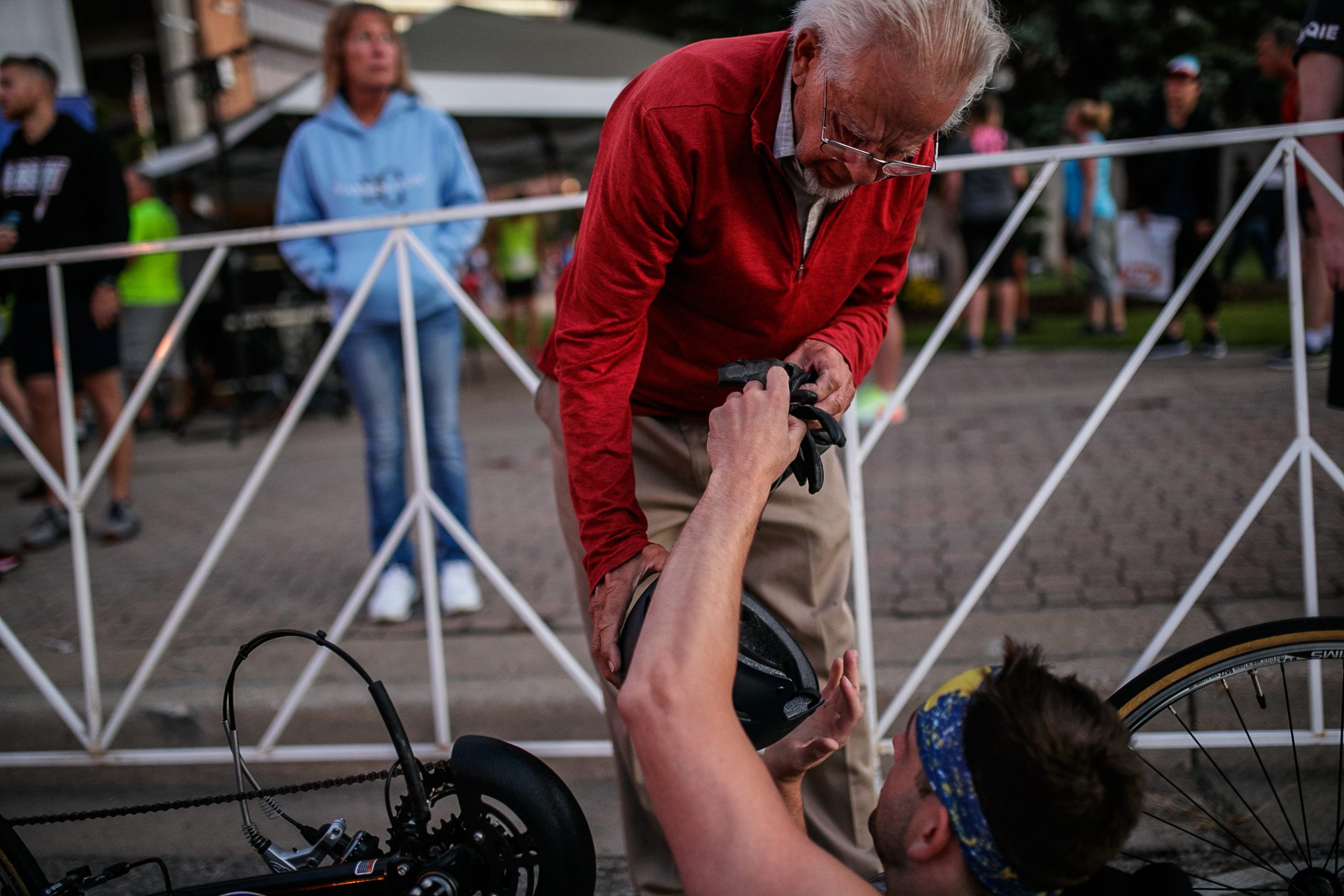 Bernie Mieslike hands a helmet and gloves to his grandson Douglas Edmonson, a hand cycle competitor, during the 45th annual Crim Festival of Races on Saturday, Aug. 27, 2022 in downtown Flint. (Jenifer Veloso | Flint Beat)