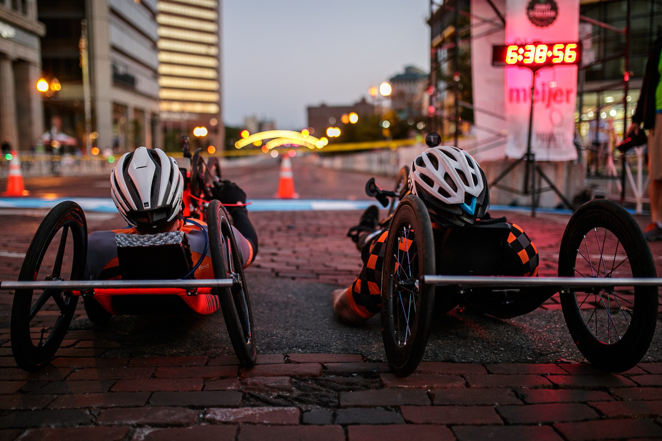 Hand cyclists line up at the starting line during the 45th annual Crim Festival of Races on Saturday, Aug. 27, 2022 in downtown Flint. (Jenifer Veloso | Flint Beat)