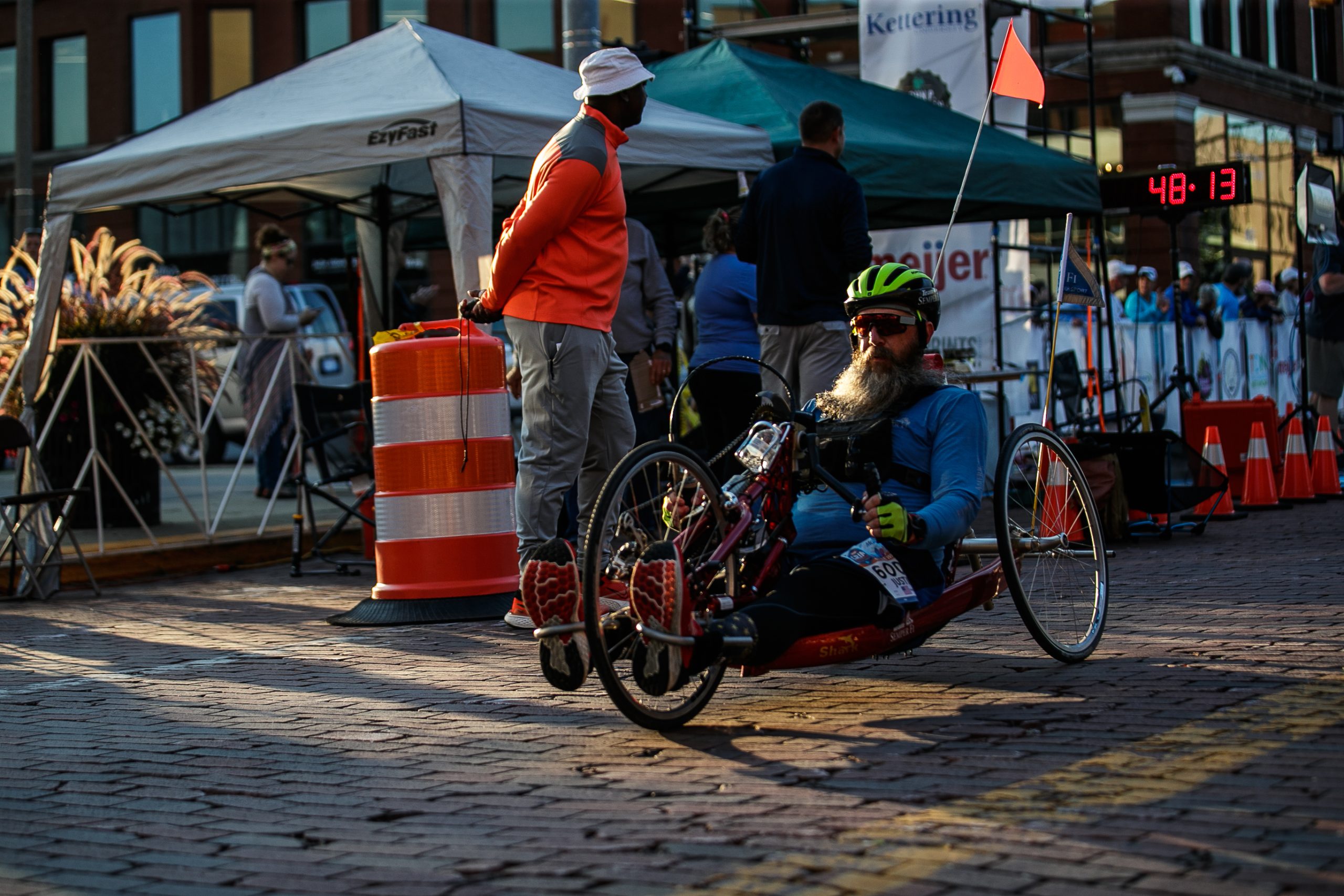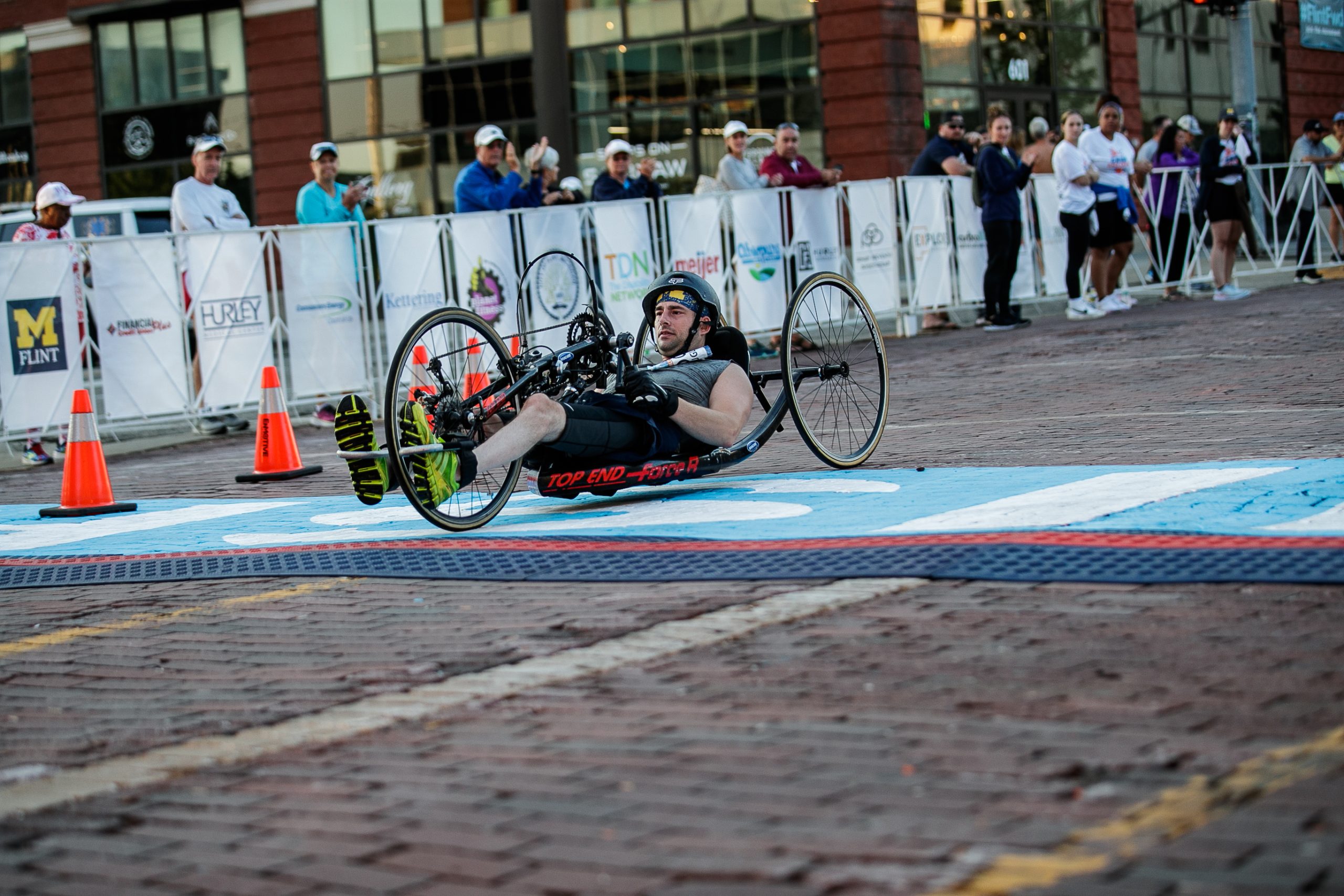 A hand cyclist crosses the finish line during the 45th annual Crim Festival of Races on Saturday, Aug. 27, 2022 in downtown Flint. (Jenifer Veloso | Flint Beat)