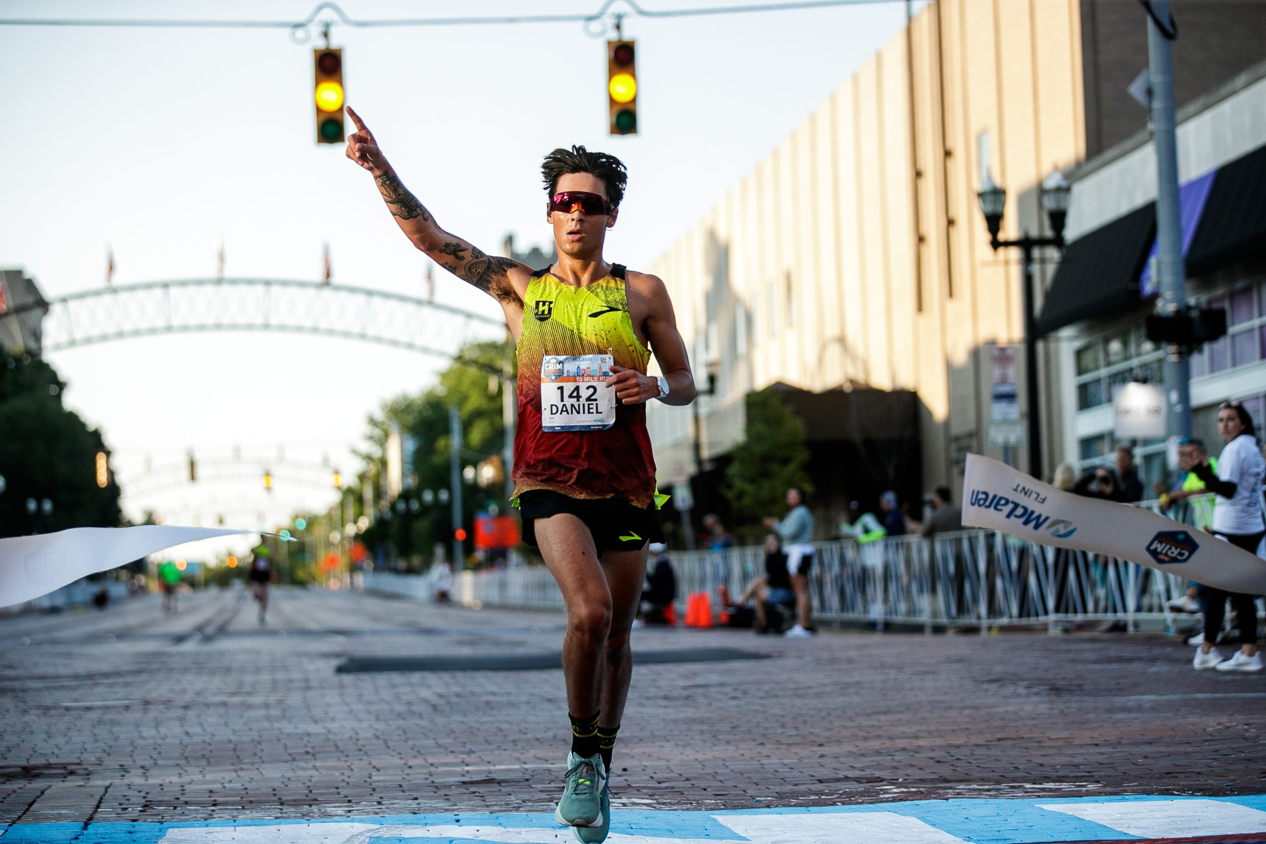 Daniel Soto wins first place overall, crossing the finish line at 48:40, during the 45th annual Crim Festival of Races on Saturday, Aug. 27, 2022 in downtown Flint. (Jenifer Veloso | Flint Beat)