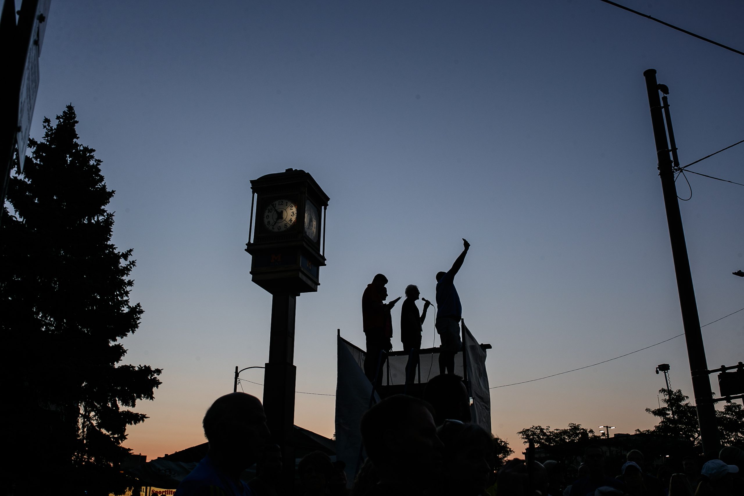 In the early hours of the morning, the National Anthem is sang before the start of the 45th annual Crim Festival of Races on Saturday, Aug. 27, 2022 in downtown Flint. (Jenifer Veloso | Flint Beat)