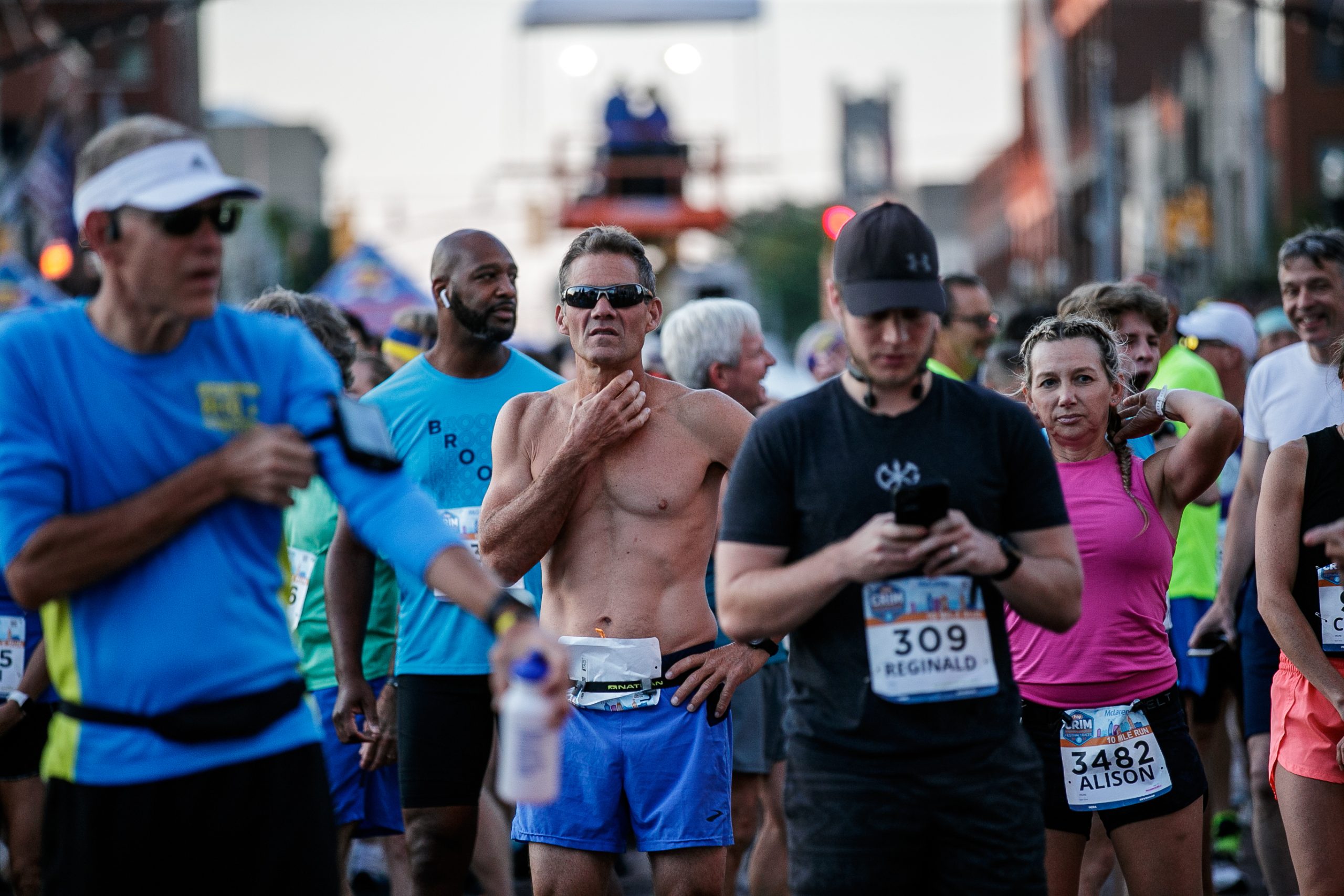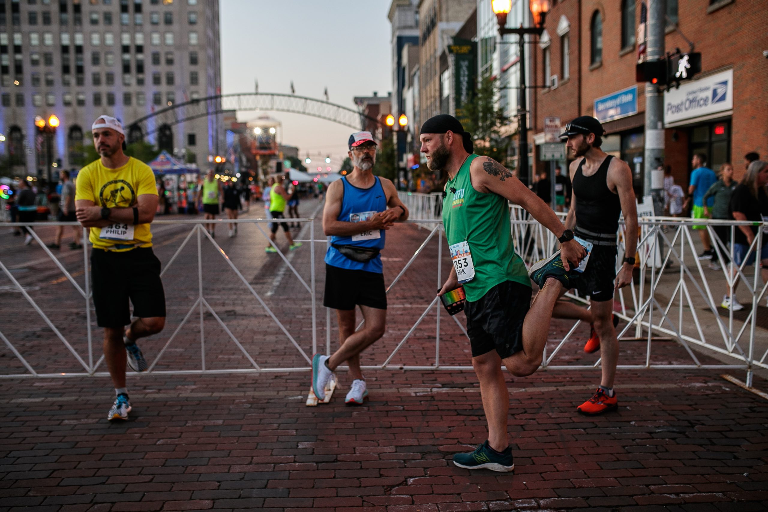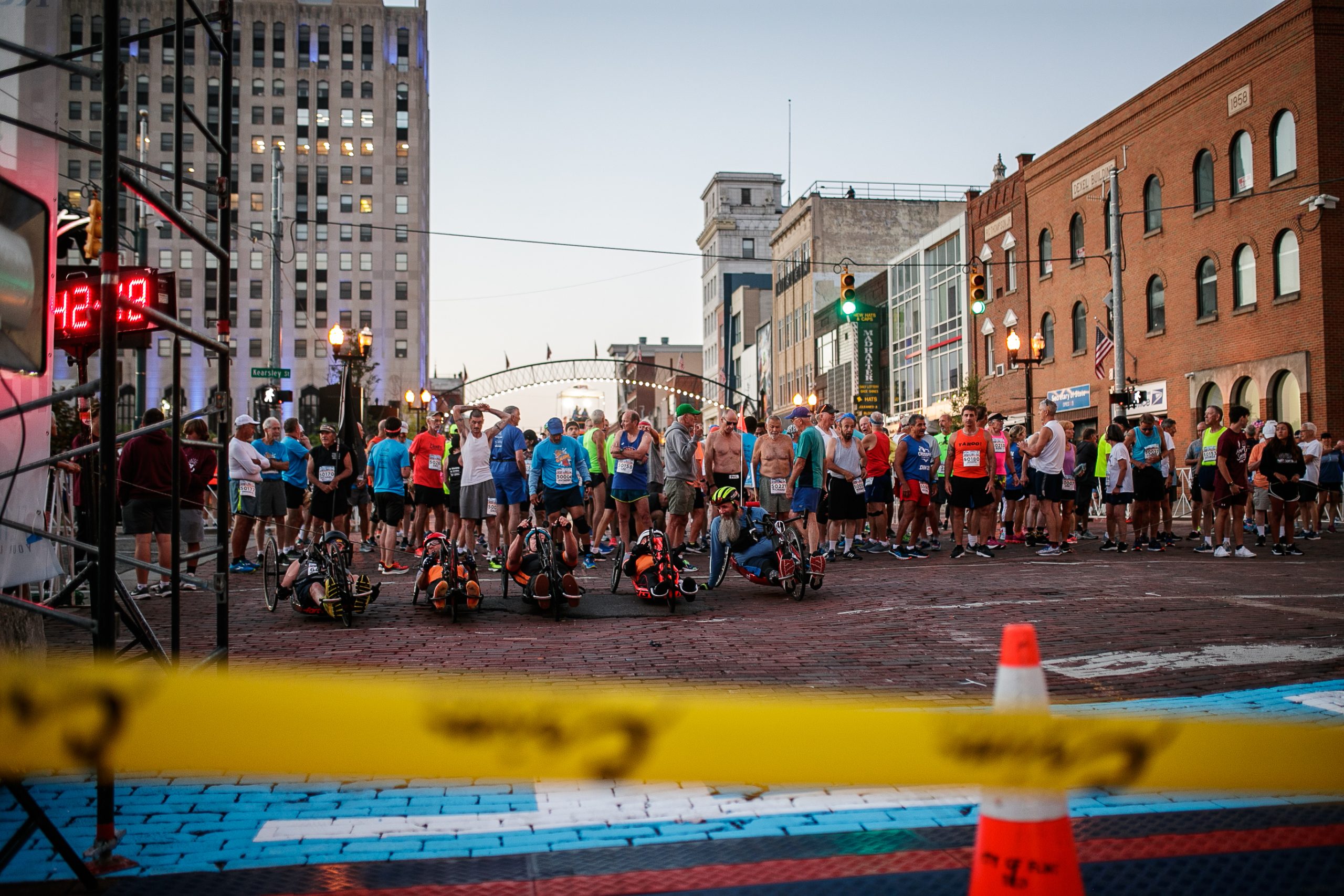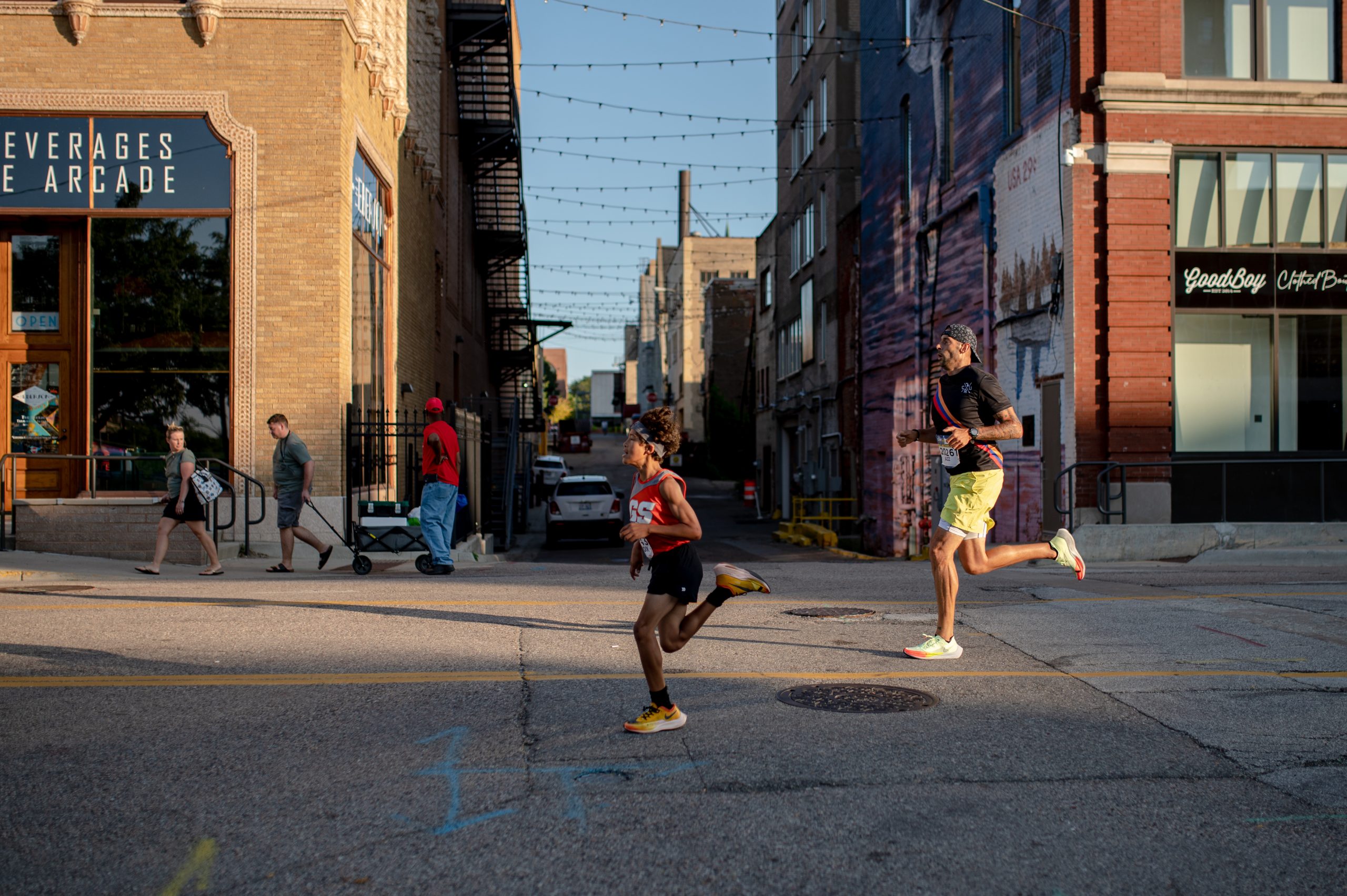 Racers head to the start line on Saginaw Street ahead of the Lois Craig Invitational race, the first race in the Crim Festival of Races, in Downtown Flint, Mich. on Friday, Aug. 26, 2022. (Michael Indriolo | Flint Beat)