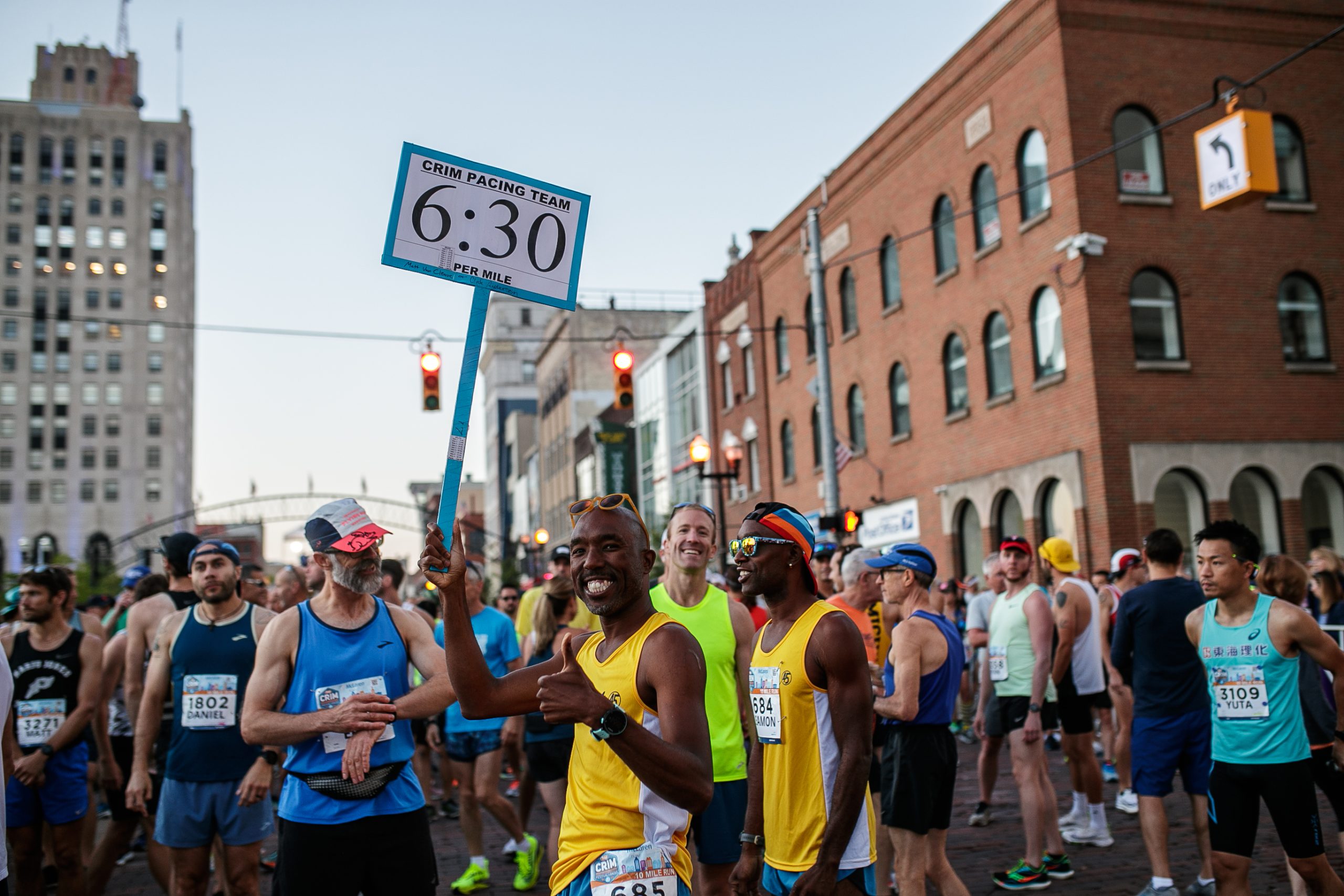Runners line up at the starting line during the 45th annual Crim Festival of Races on Saturday, Aug. 27, 2022 in downtown Flint. (Jenifer Veloso | Flint Beat)Returning Crim runners of 30 years take off during an early starting time for the 45th annual Crim Festival of Races on Saturday, Aug. 27, 2022 in downtown Flint. (Jenifer Veloso | Flint Beat)A Crim participant holds up a mileage time marker during the 45th annual Crim Festival of Races on Saturday, Aug. 27, 2022 in downtown Flint. (Jenifer Veloso | Flint Beat)