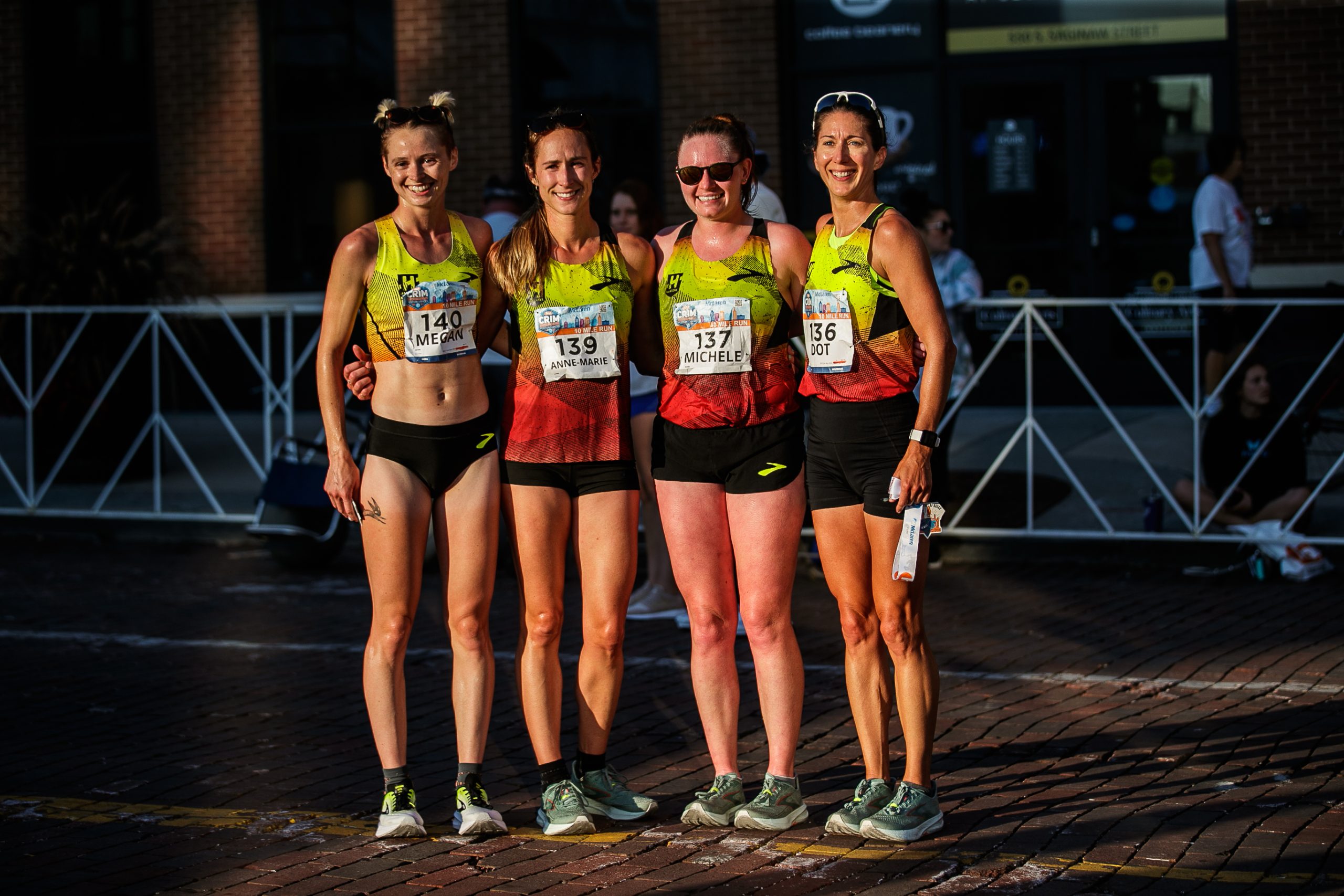 A team of runners poses for a photo after completing the 10 mile run during the 45th annual Crim Festival of Races on Saturday, Aug. 27, 2022 in downtown Flint. (Jenifer Veloso | Flint Beat)