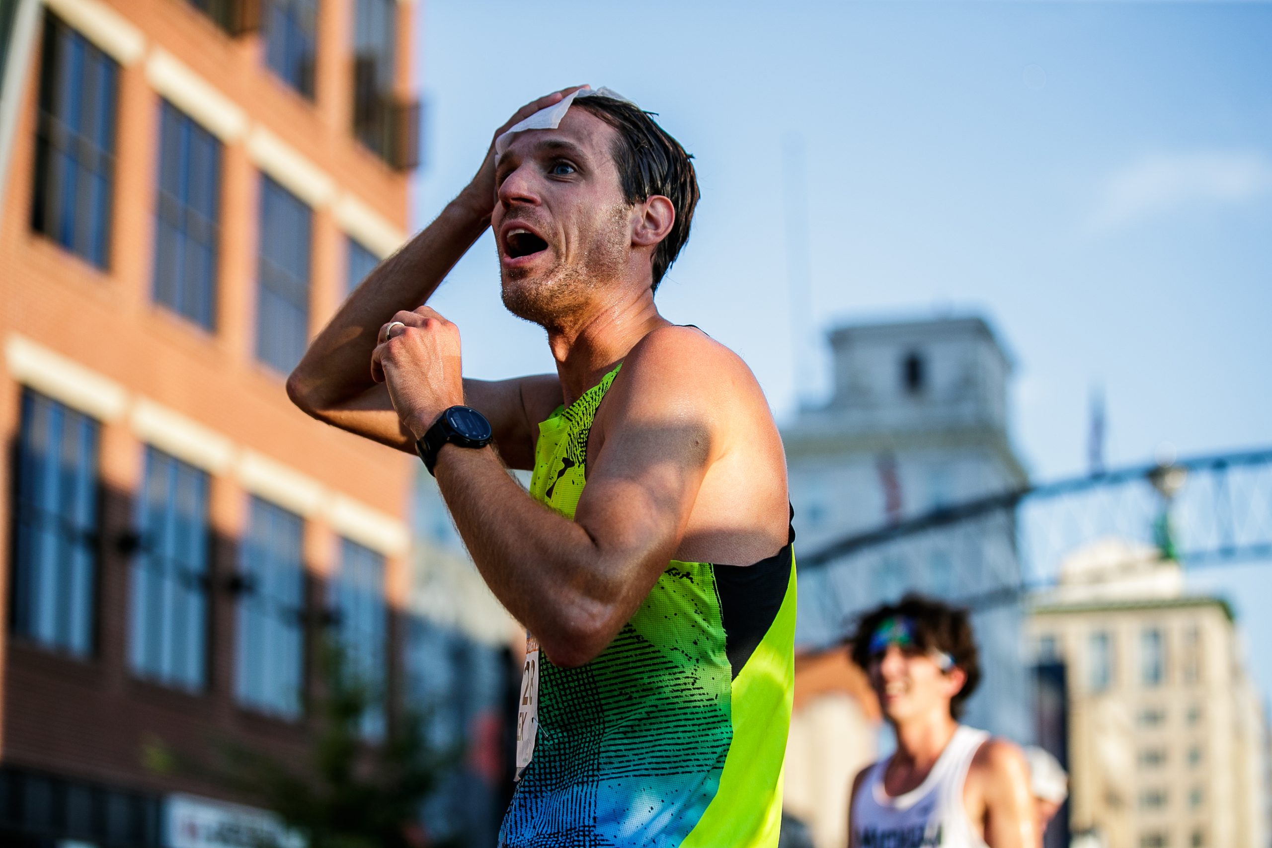Anders Christensen competes in the Lois Craig Invitational race, the first race in the Crim Festival of Races, in Downtown Flint, Mich. on Friday, Aug. 26, 2022. (Michael Indriolo | Flint Beat)
