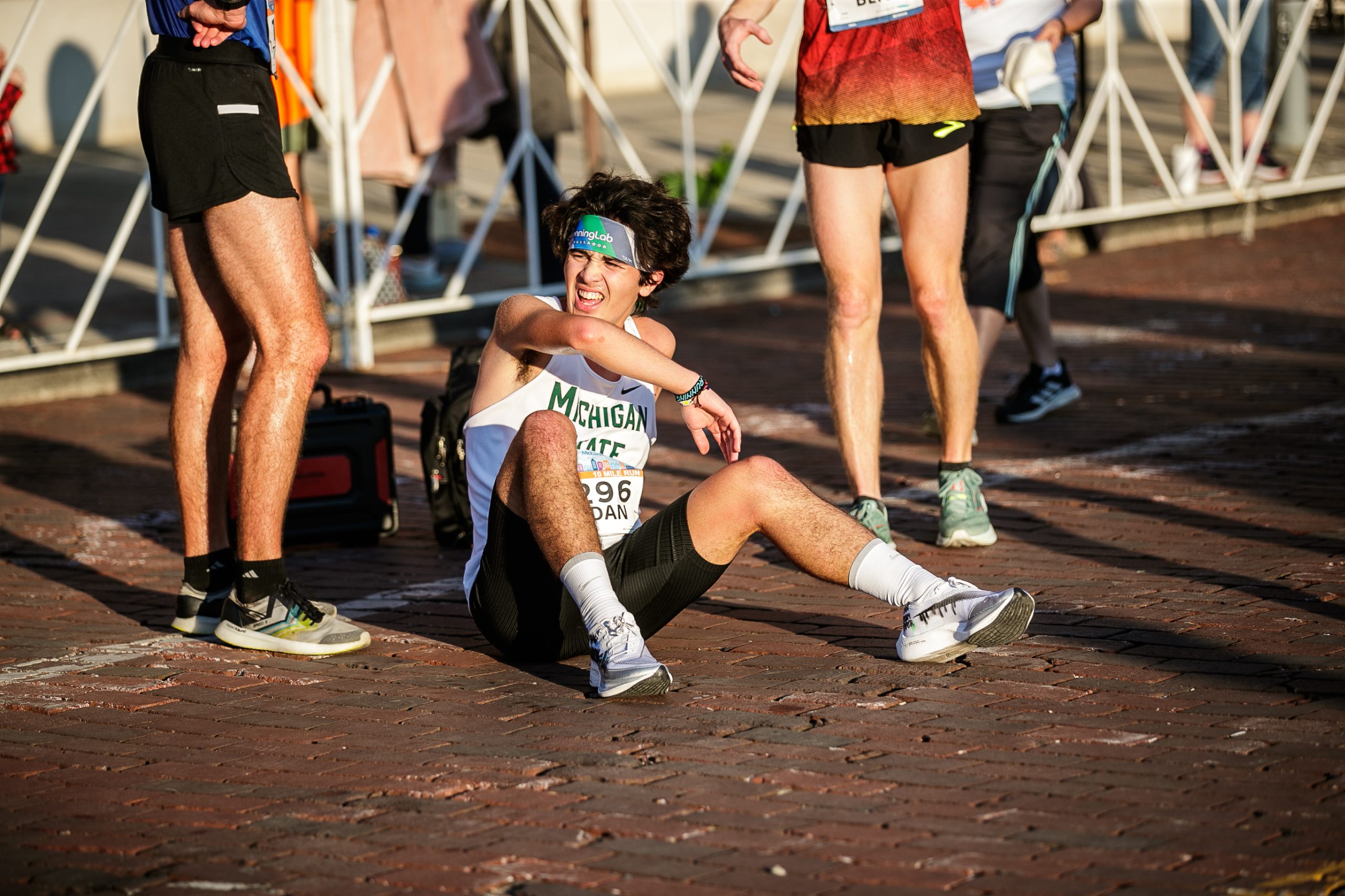 A runner catches his breath after completing the 10 mile run during the 45th annual Crim Festival of Races on Saturday, Aug. 27, 2022 in downtown Flint. (Jenifer Veloso | Flint Beat)A runner sits on the bricks after completing the 10 mile run during the 45th annual Crim Festival of Races on Saturday, Aug. 27, 2022 in downtown Flint. (Jenifer Veloso | Flint Beat)