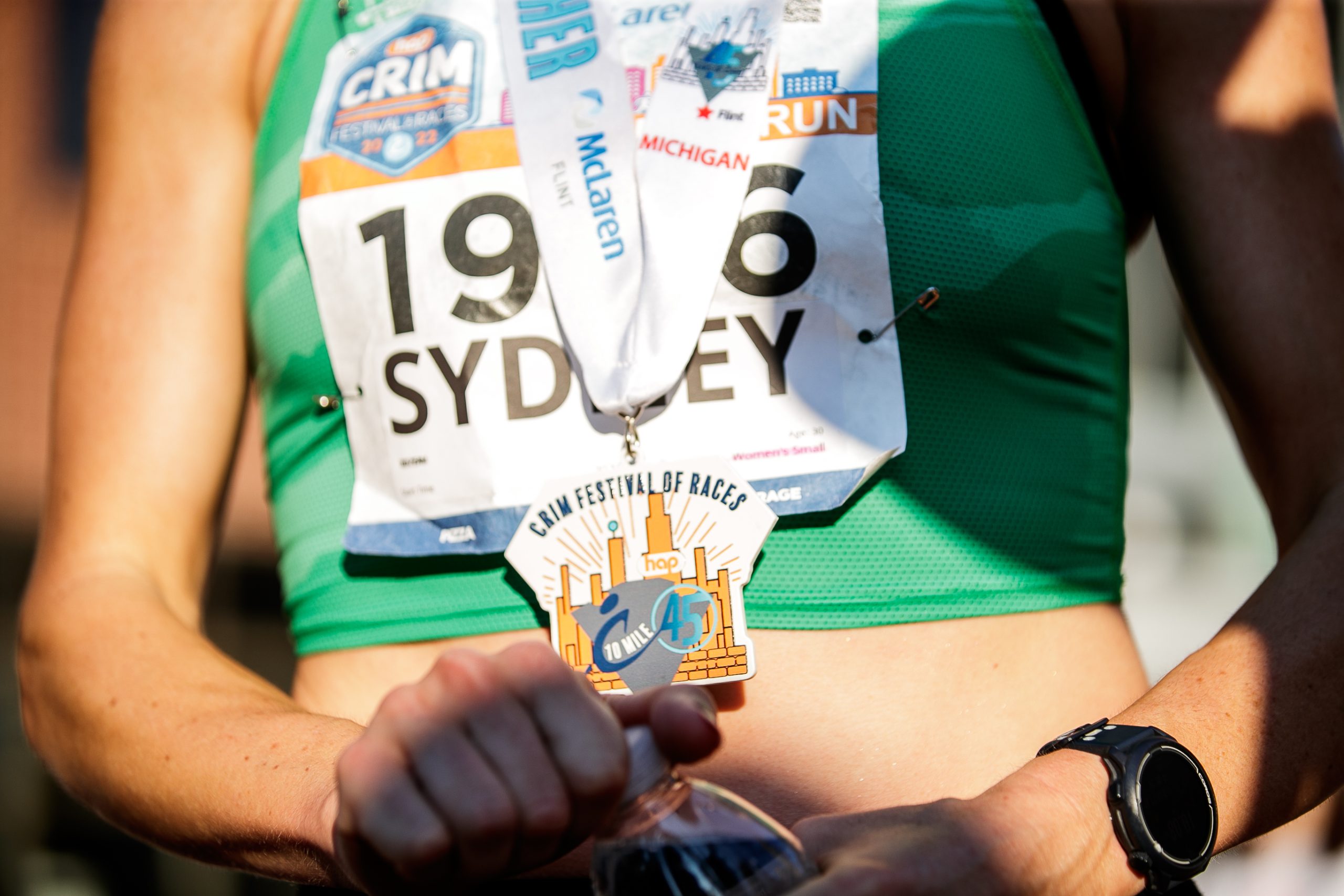 Sydney Devore’s medal for completing the 10 mile race shines in the morning light during the 45th annual Crim Festival of Races on Saturday, Aug. 27, 2022 in downtown Flint. (Jenifer Veloso | Flint Beat)