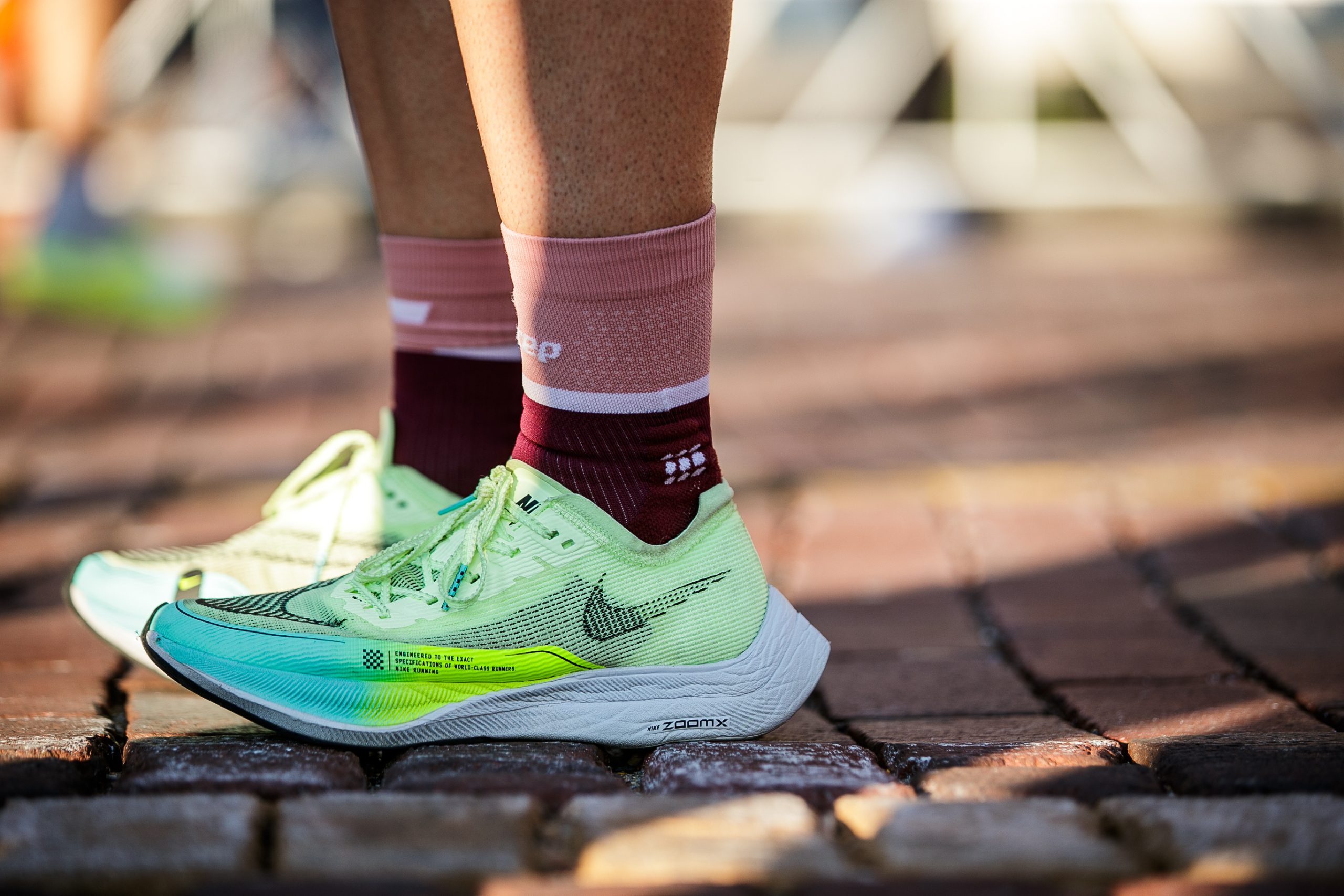 Sydney Devore’s tennis shoes shine in the sunlight after she is the first female to cross the 10 mile finish line during the 45th annual Crim Festival of Races on Saturday, Aug. 27, 2022 in downtown Flint. (Jenifer Veloso | Flint Beat)