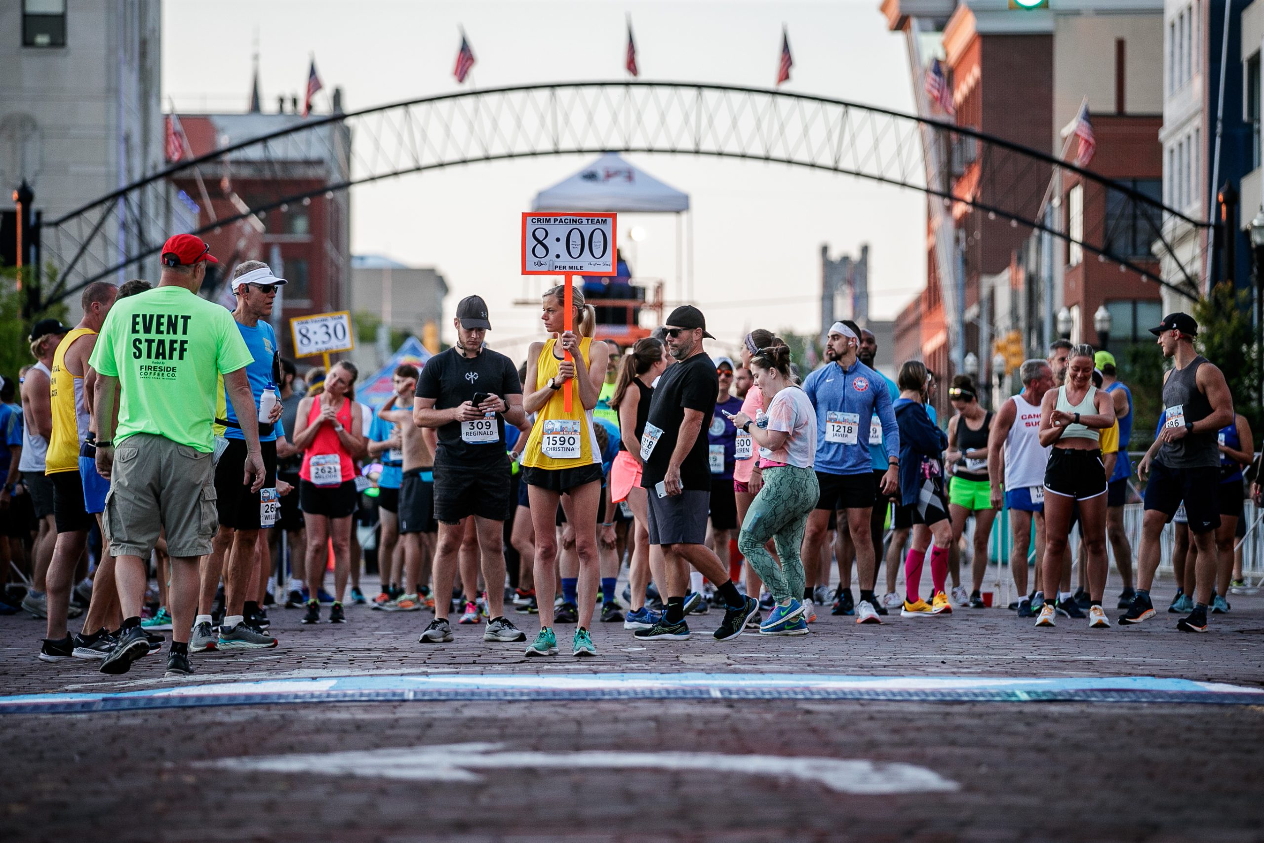 Crim runners line up to the starting line based on their pace time of 8:00 during the 45th annual Crim Festival of Races on Saturday, Aug. 27, 2022 in downtown Flint. (Jenifer Veloso | Flint Beat)