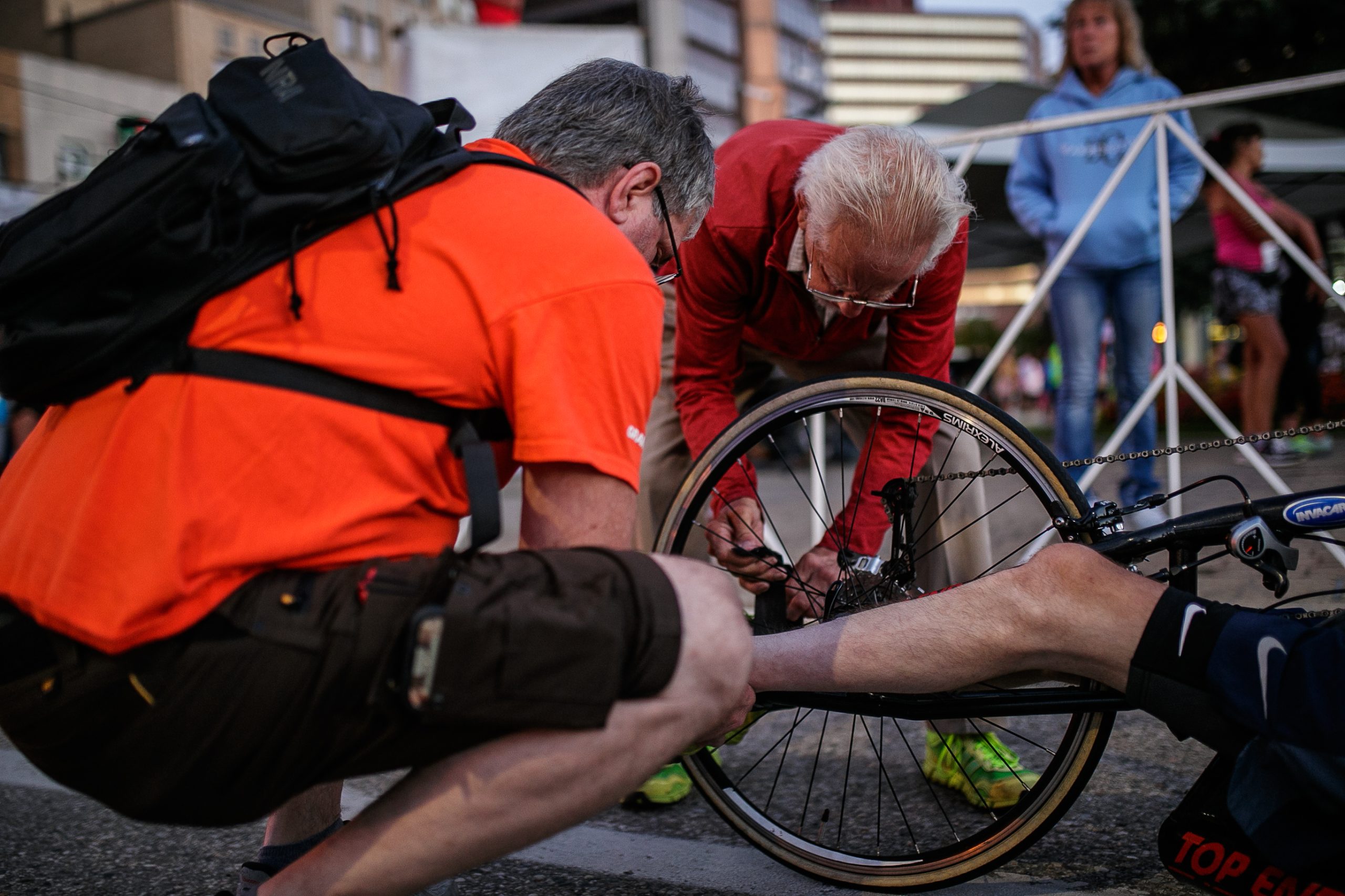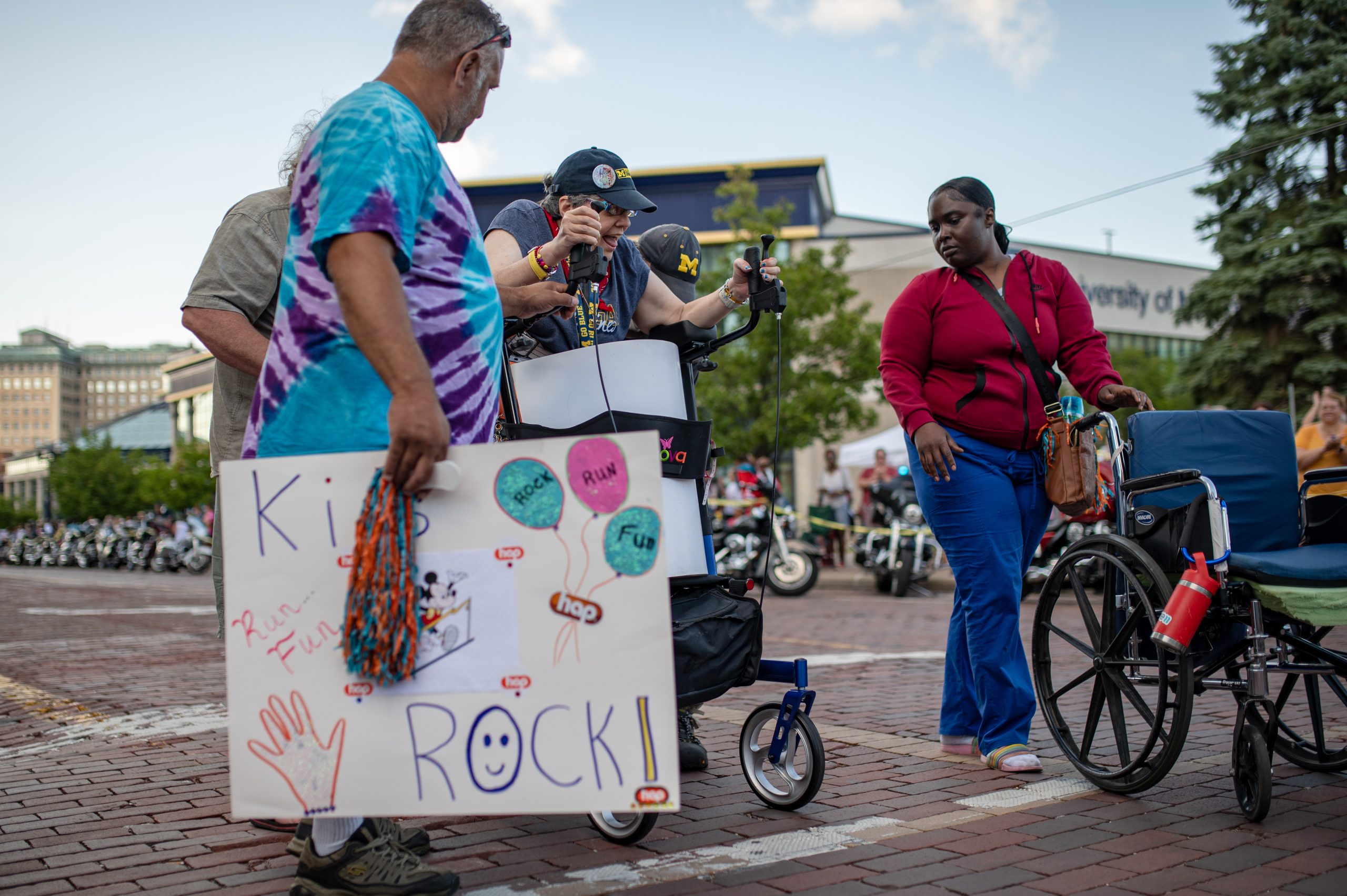 Bernie Mieslike and a friend assist Mieslike’s grandson get into his hand cycle during the 45th annual Crim Festival of Races on Saturday, Aug. 27, 2022 in downtown Flint. (Jenifer Veloso | Flint Beat)