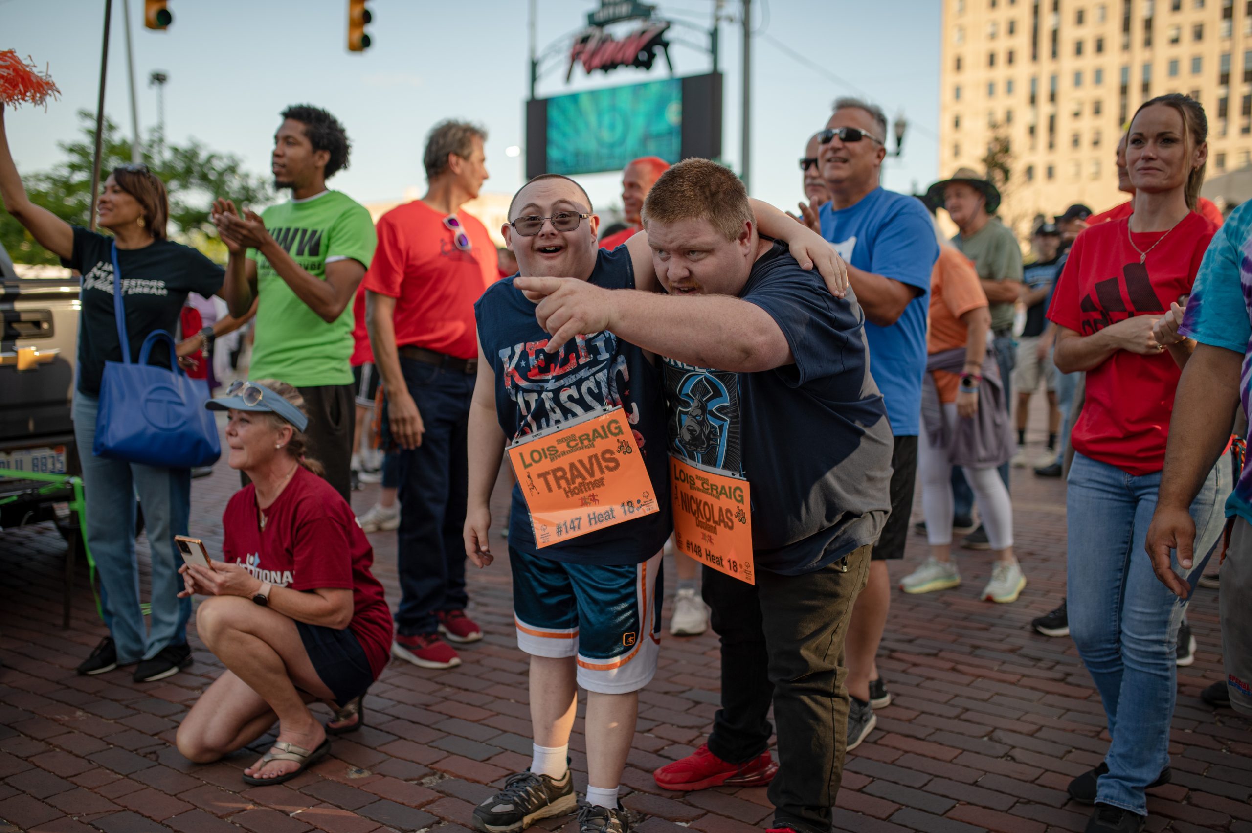 Travis Hoffner and Nickolas Dowland celebrate after finishing the Lois Craig Invitational race, the first race in the Crim Festival of Races, in Downtown Flint, Mich. on Friday, Aug. 26, 2022. (Michael Indriolo | Flint Beat)