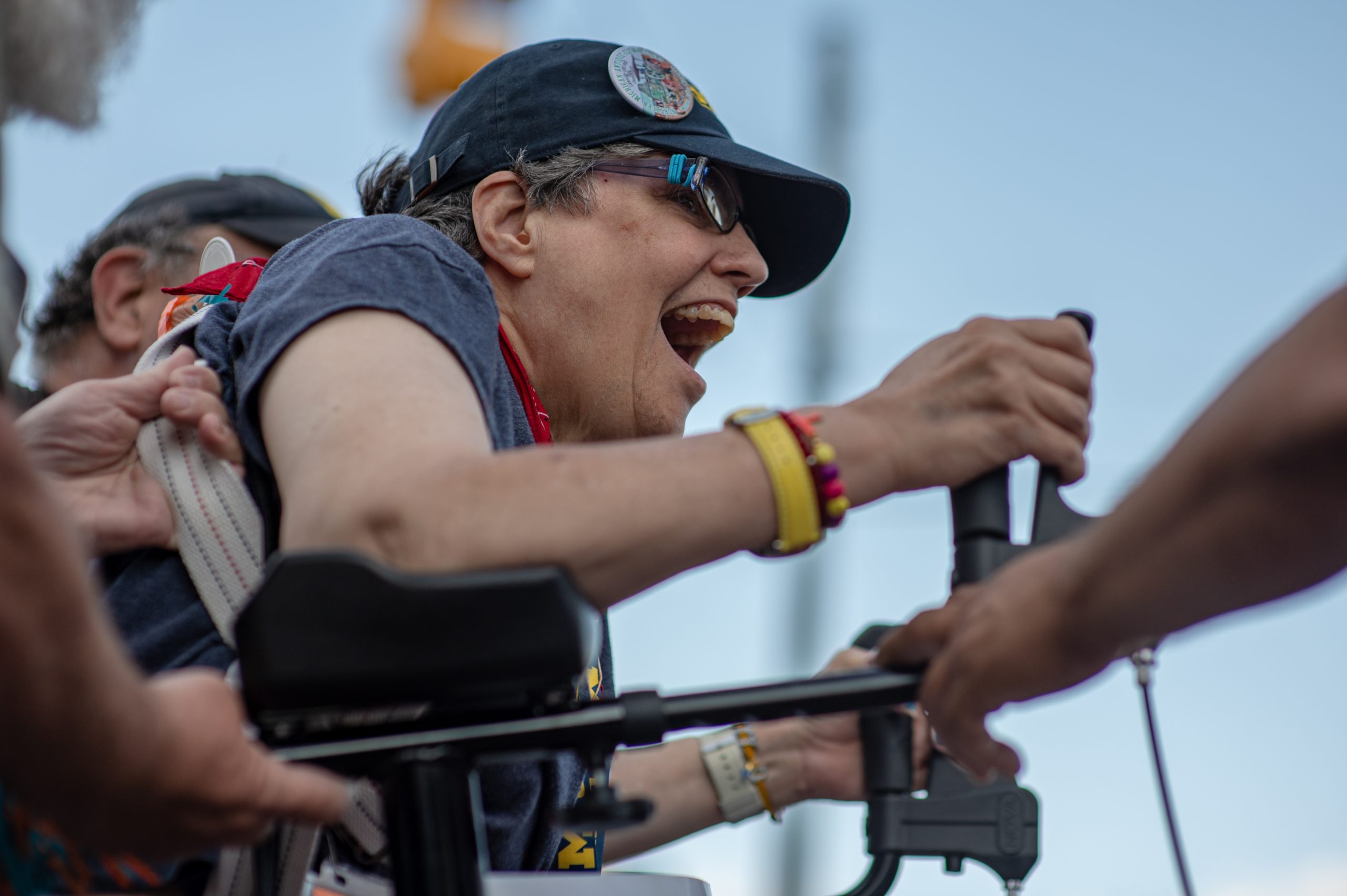 Douglas Edmonson smiles as he gets ready to race with his hand cycle during the 45th annual Crim Festival of Races on Saturday, Aug. 27, 2022 in downtown Flint. (Jenifer Veloso | Flint Beat)