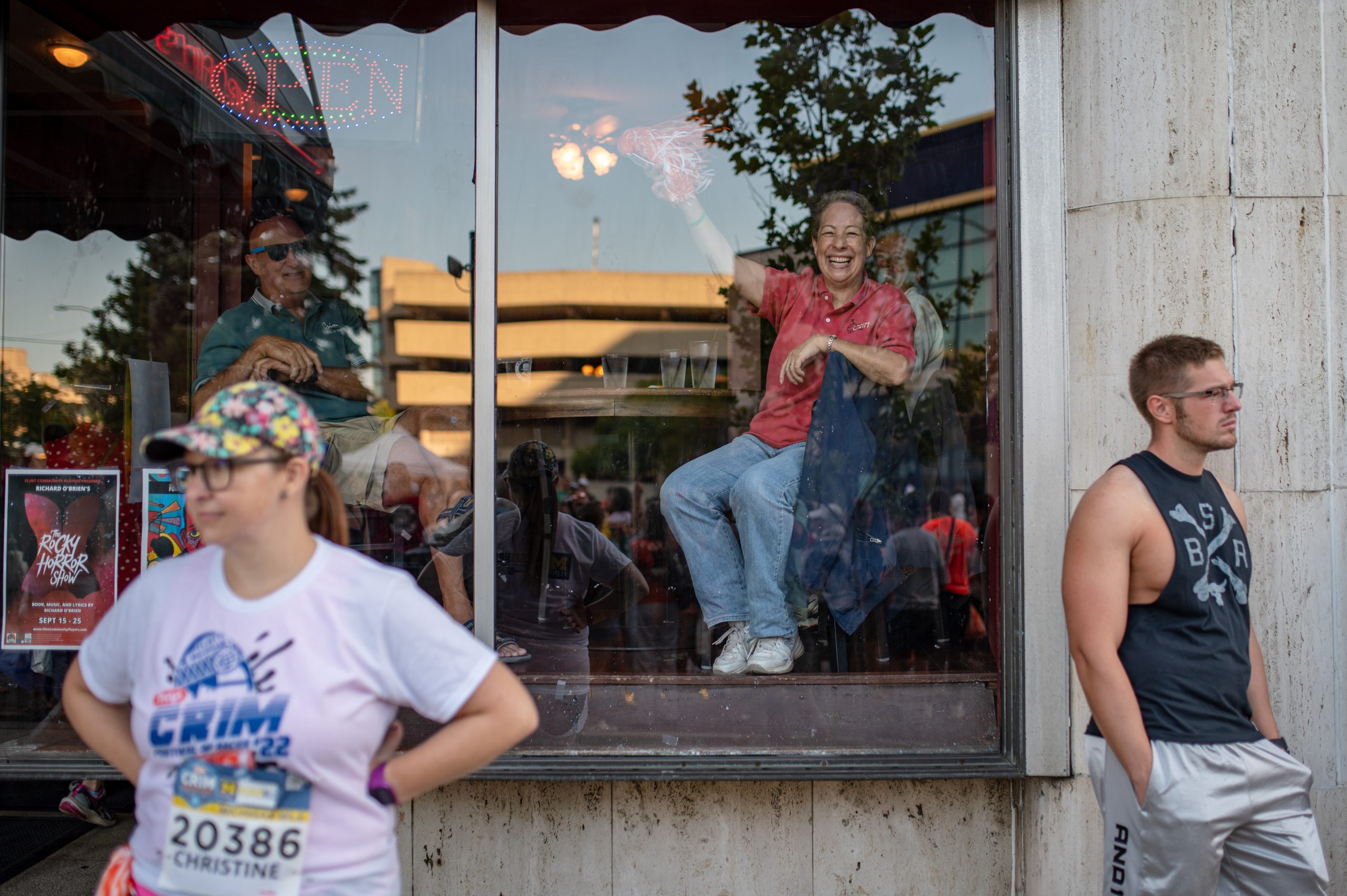 A spectator cheers racers on from inside Churchill’s Food & Spirits during the Lois Craig Invitational race, the first race in the Crim Festival of Races, in Downtown Flint, Mich. on Friday, Aug. 26, 2022. (Michael Indriolo | Flint Beat)