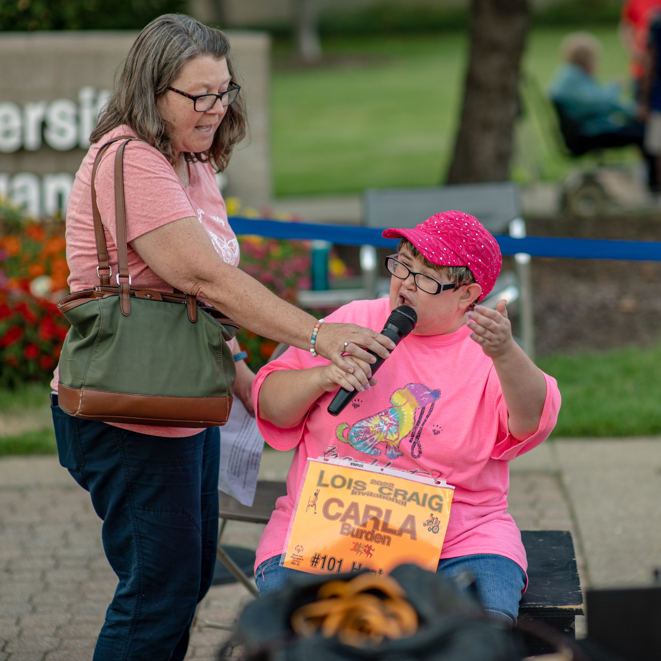 Carla Burden, who competed in the Lois Craig Invitational race, sings a song dedicated to her friends and fellow racers who have since passed away during the Crim Festival of Races in Downtown Flint, Mich. on Friday, Aug. 26, 2022. (Michael Indriolo | Flint Beat)
