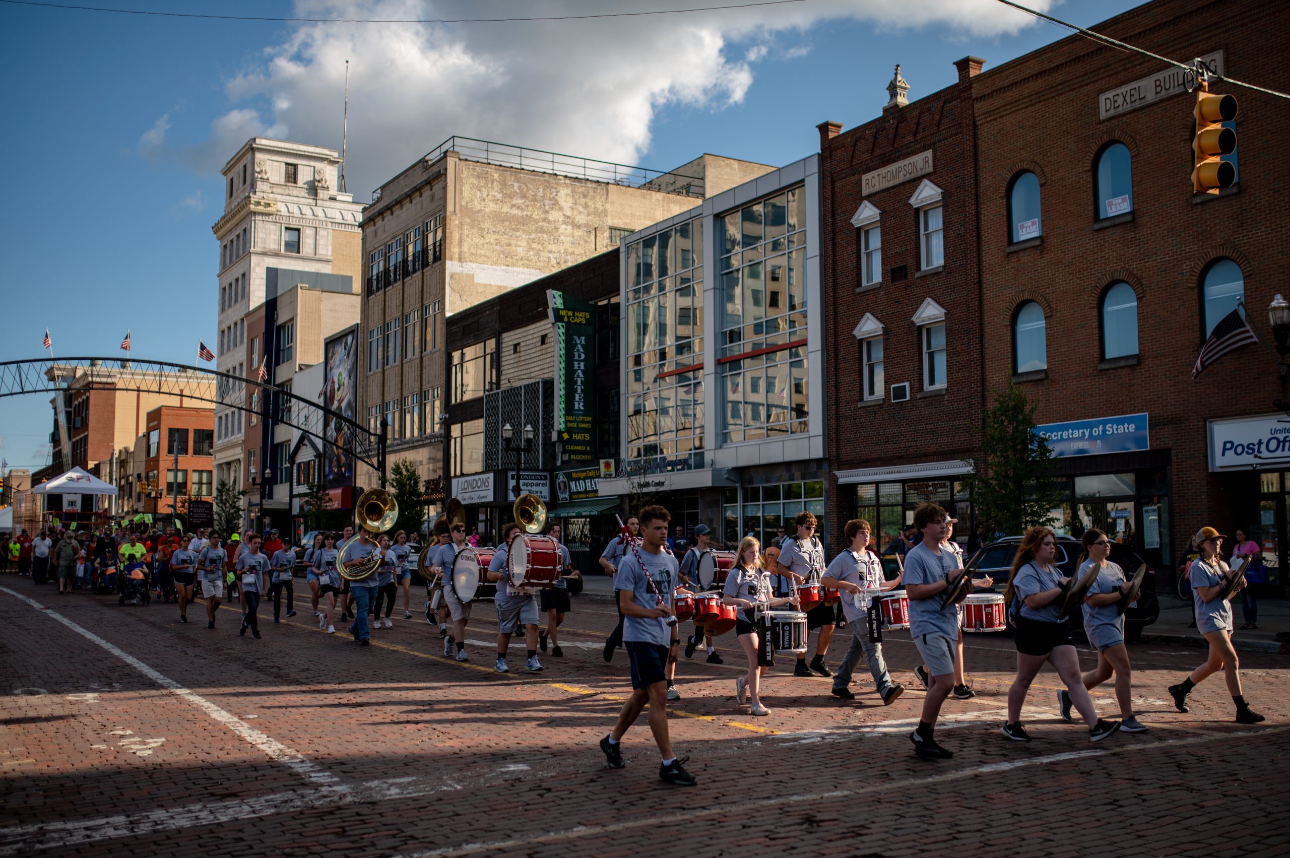 The Dragon Marching Band performs on Saginaw Street ahead of the Lois Craig Invitational race, the first race in the Crim Festival of Races, in Downtown Flint, Mich. on Friday, Aug. 26, 2022. (Michael Indriolo | Flint Beat)