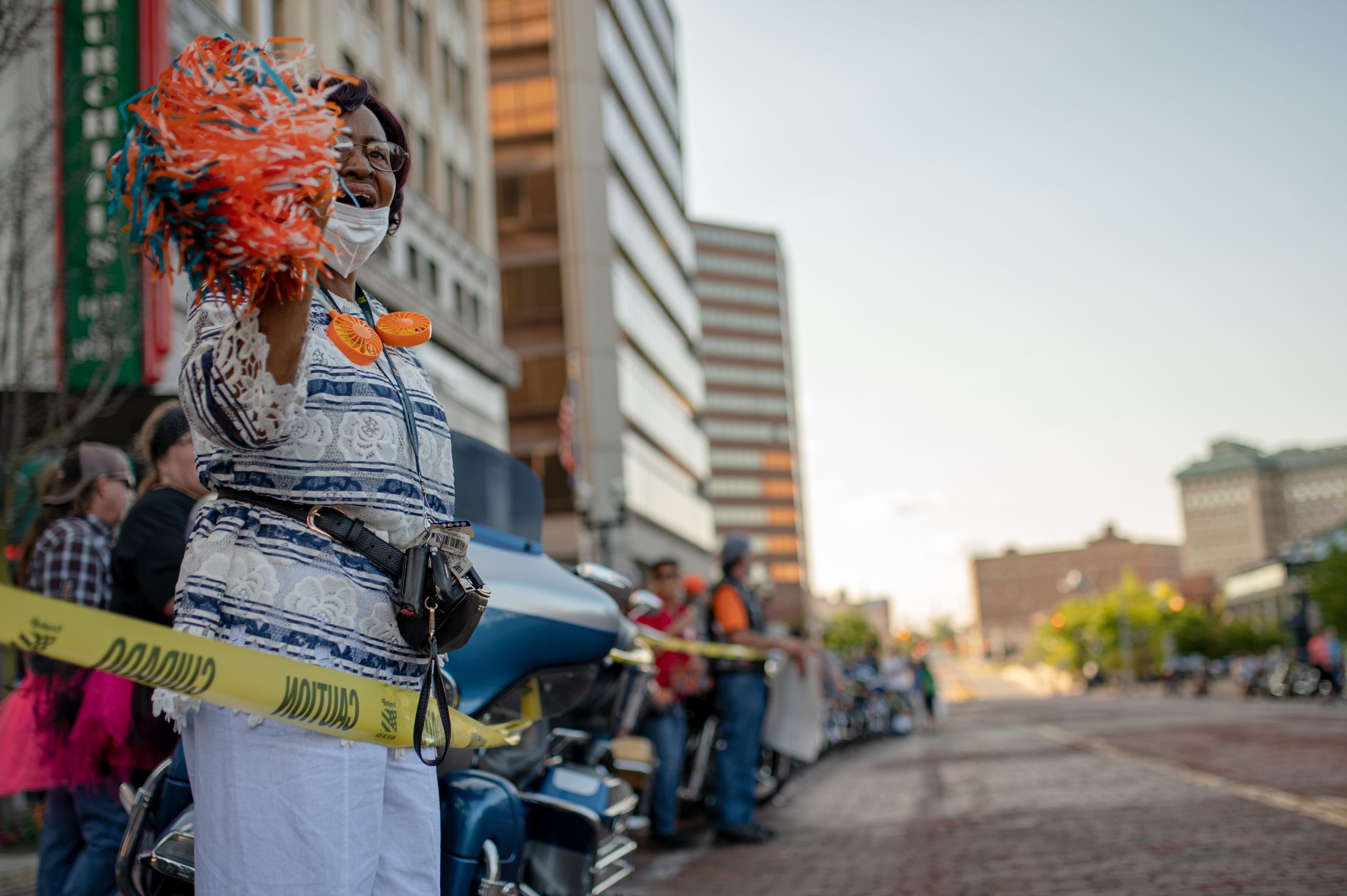 Mary Dillard, of the League of Women Voters, cheers on racers during the Lois Craig Invitational race, the first race in the Crim Festival of Races, in Downtown Flint, Mich. on Friday, Aug. 26, 2022. (Michael Indriolo | Flint Beat)