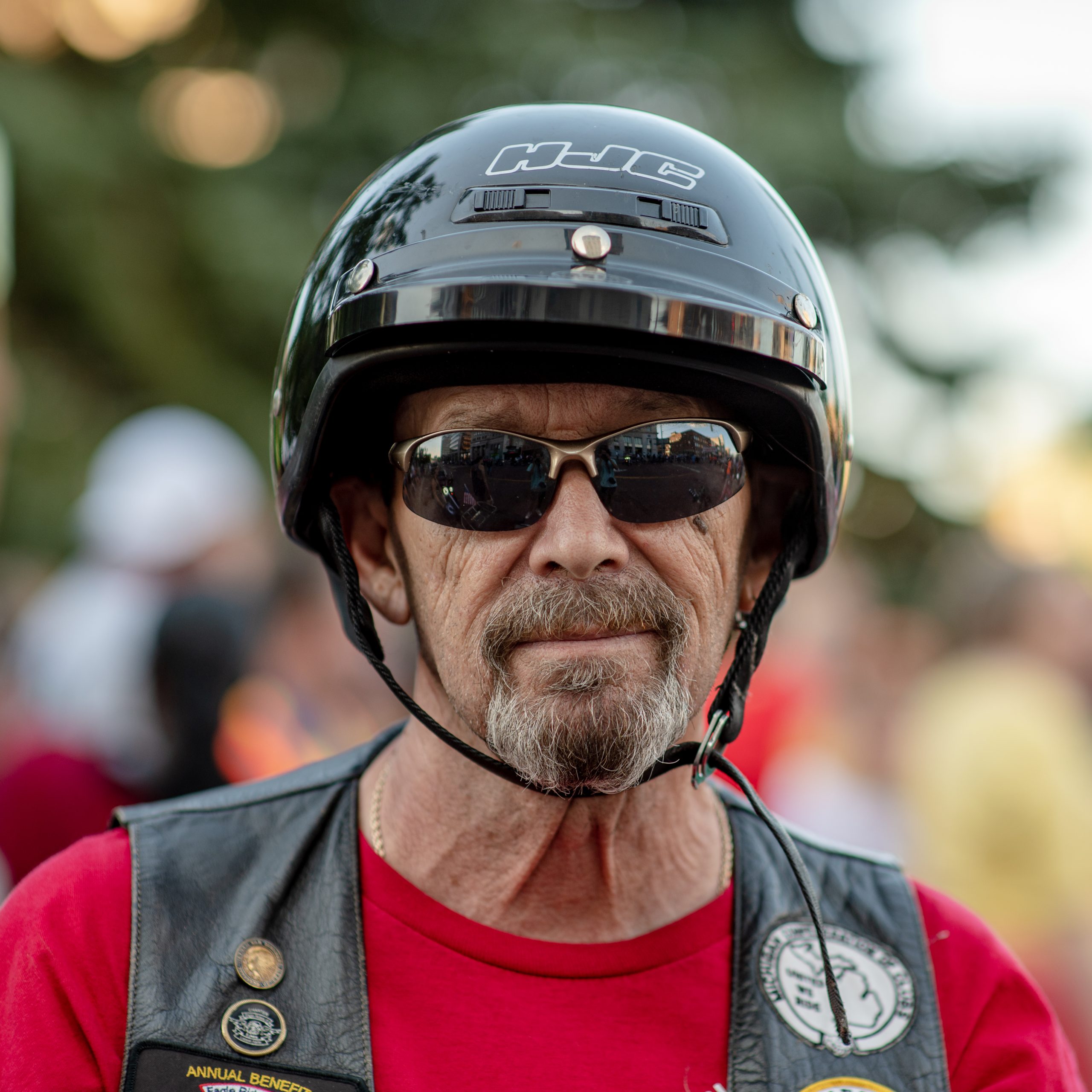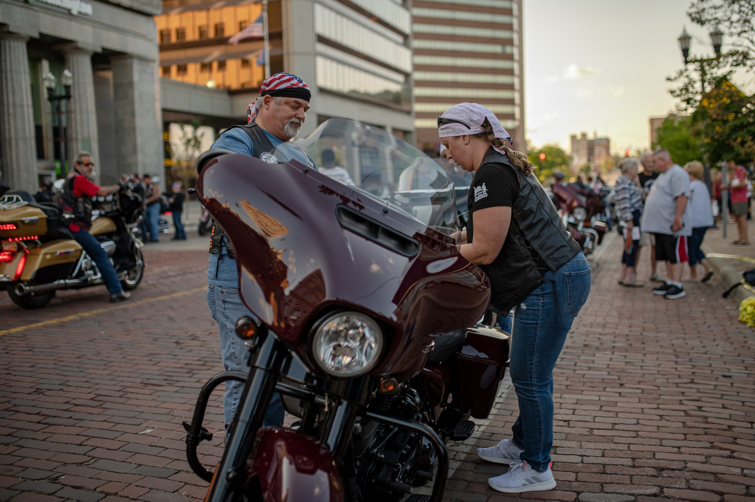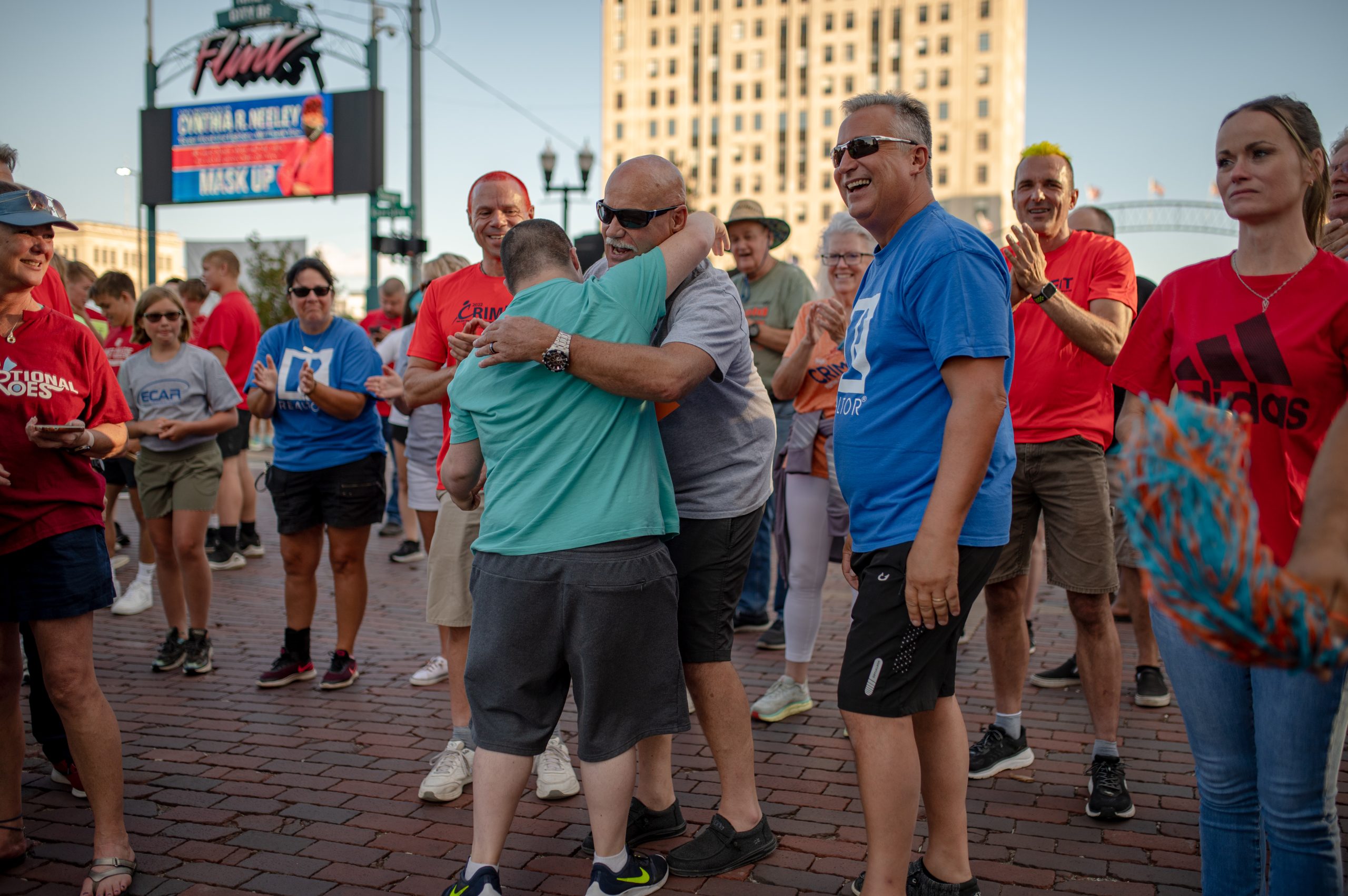 Dan, of the Lapeer Eagle Riders, poses for a photo during the Lois Craig Invitational race, the first race in the Crim Festival of Races, in Downtown Flint, Mich. on Friday, Aug. 26, 2022. The Lapeer Eagle Riders lined their motocycles along Saginaw Street during the race. (Michael Indriolo | Flint Beat)Jax Webber hugs Joe Snell as he crosses the finish line of the Lois Craig Invitational race, the first race in the Crim Festival of Races, in Downtown Flint, Mich. on Friday, Aug. 26, 2022. (Michael Indriolo | Flint Beat)