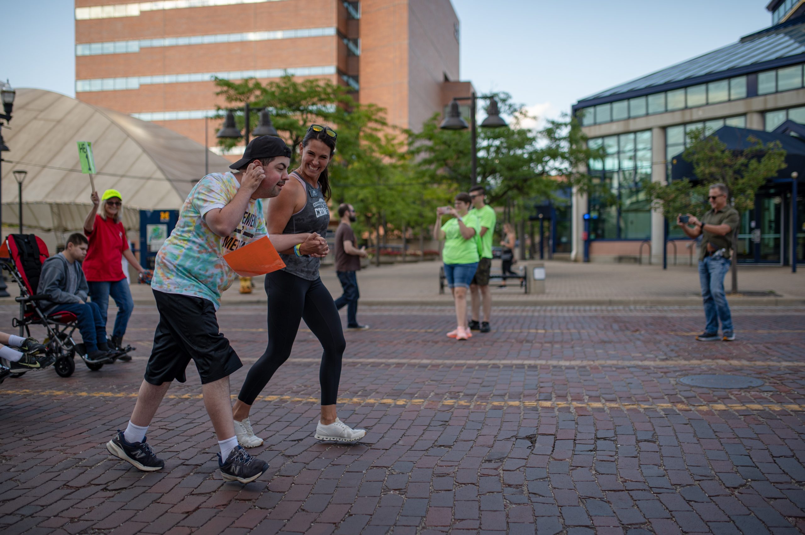 As Patty Davis approaches the finish line of the Lois Craig Invitational race, she stands up out of her wheelchair to cross it on foot during the Crim Festival of Races in Downtown Flint, Mich. on Friday, Aug. 26, 2022. (Michael Indriolo | Flint Beat)