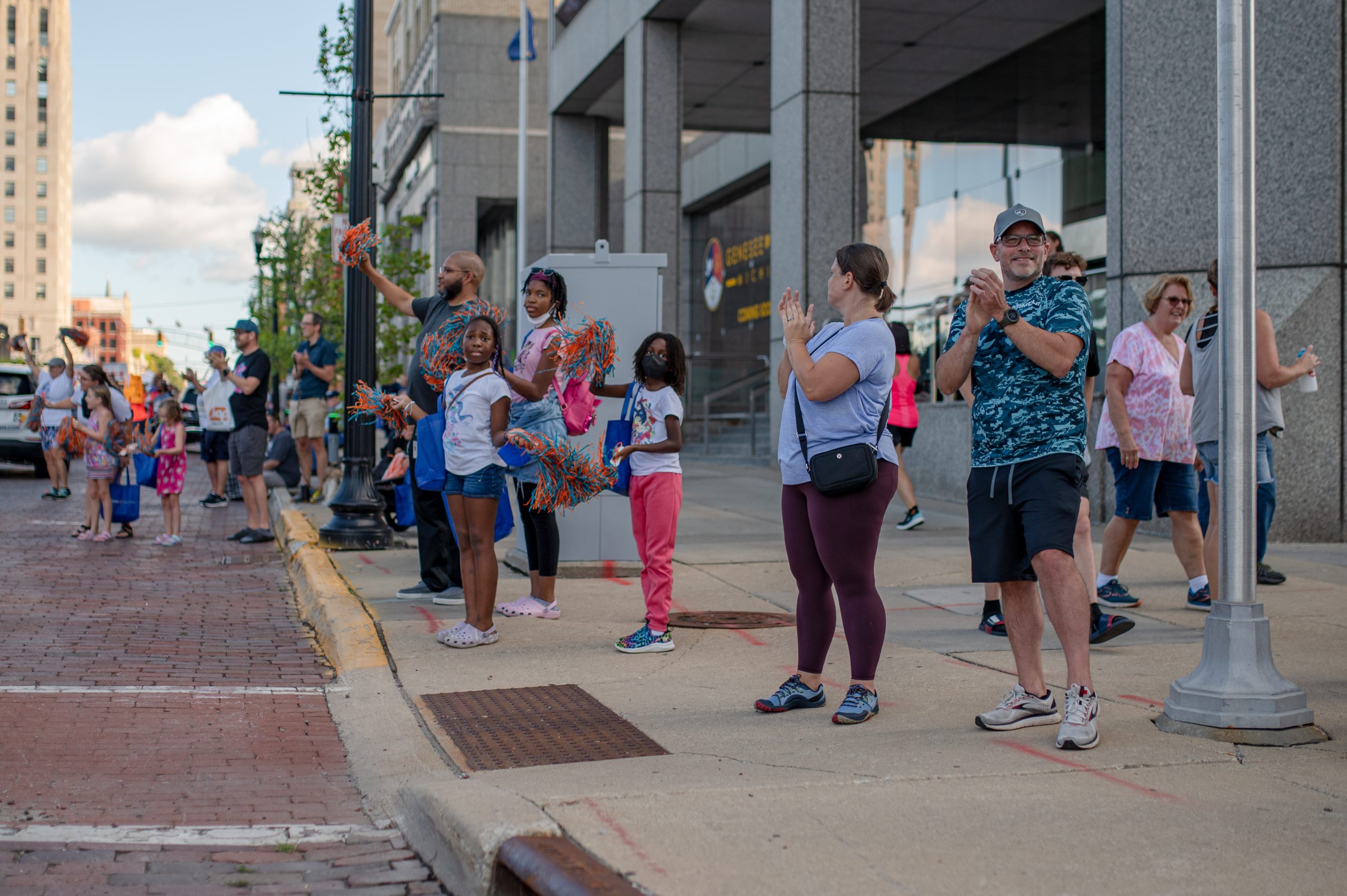 Specators cheer on racers during the Lois Craig Invitational race, the first race in the Crim Festival of Races, in Downtown Flint, Mich. on Friday, Aug. 26, 2022. (Michael Indriolo | Flint Beat)