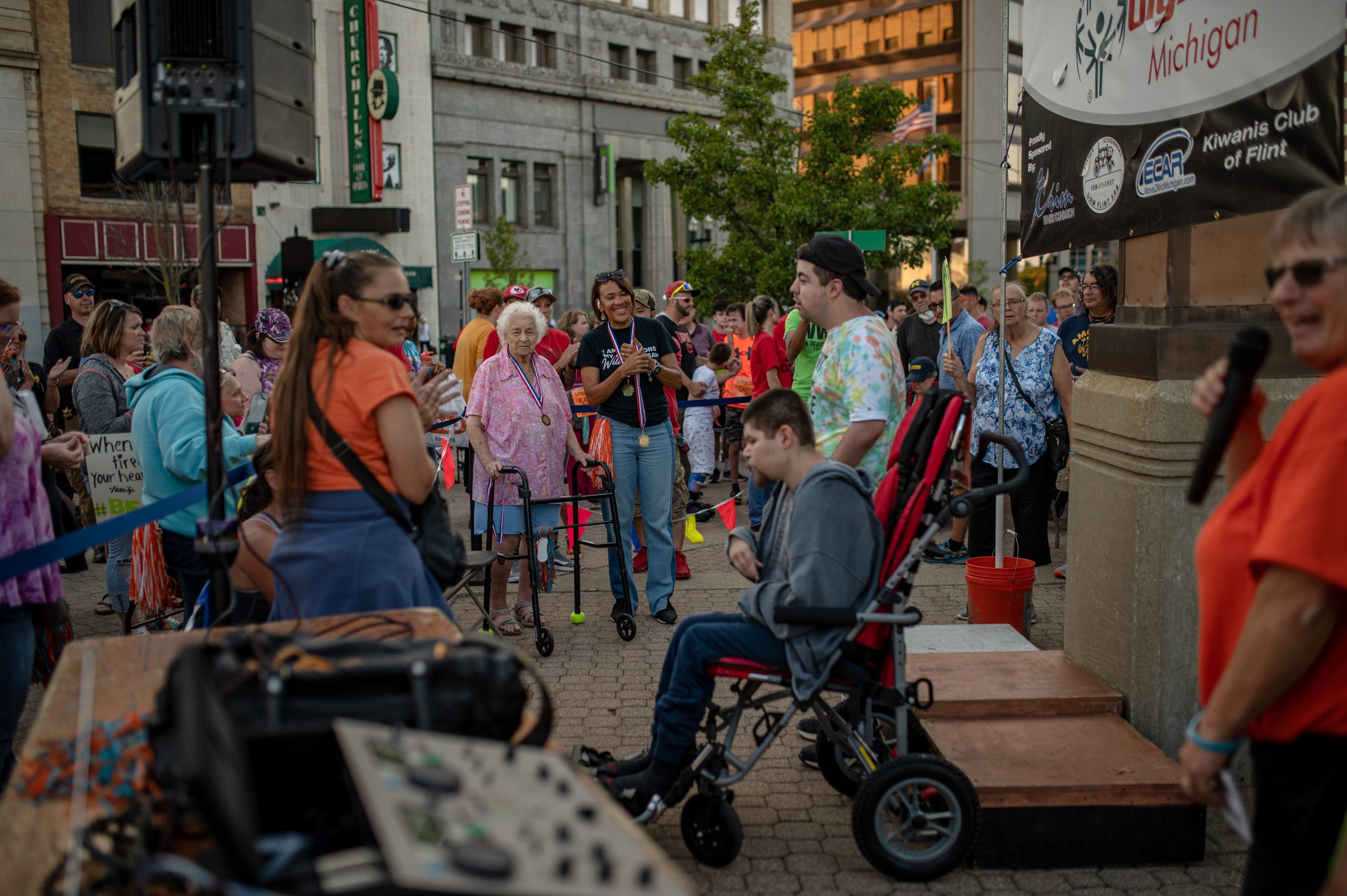 Mayoral Candidate Karen Weaver and Lois Craig, for whom the Lois Craig Invitiation is named, award medals to the race’s winners during the Crim Festival of Races in Downtown Flint, Mich. on Friday, Aug. 26, 2022. (Michael Indriolo | Flint Beat)Ernie Green and Kirsten Green, of the Lapeer Eagle Riders, get ready to ride off after the Lois Craig Invitational race, the first race in the Crim Festival of Races, in Downtown Flint, Mich. on Friday, Aug. 26, 2022. The Lapeer Eagle Riders lined their motocycles along Saginaw Street during the race. (Michael Indriolo | Flint Beat)Aaron Darby, left, and other racers compete in the Michigan Mile during the Crim Festival of Races in Downtown Flint, Mich. on Friday, Aug. 26, 2022. (Michael Indriolo | Flint Beat)Lennox Naswell and Jazz Farha compete in the Michigan Mile during the Crim Festival of Races in Downtown Flint, Mich. on Friday, Aug. 26, 2022. (Michael Indriolo | Flint Beat)Andrew Berg, Katherine Berg, Jack Berg, Brandon Morgan and Jack Morgan cross the finish line of the Michigan MIle during the Crim Festival of Races, in Downtown Flint, Mich. on Friday, Aug. 26, 2022. (Michael Indriolo | Flint Beat)