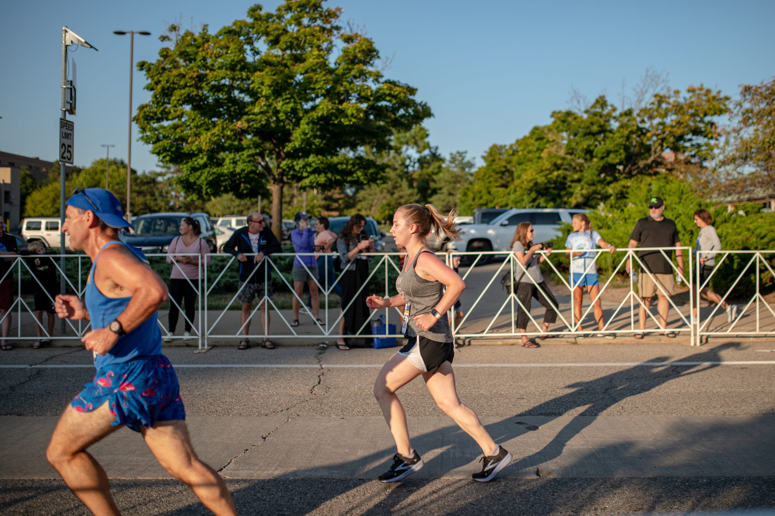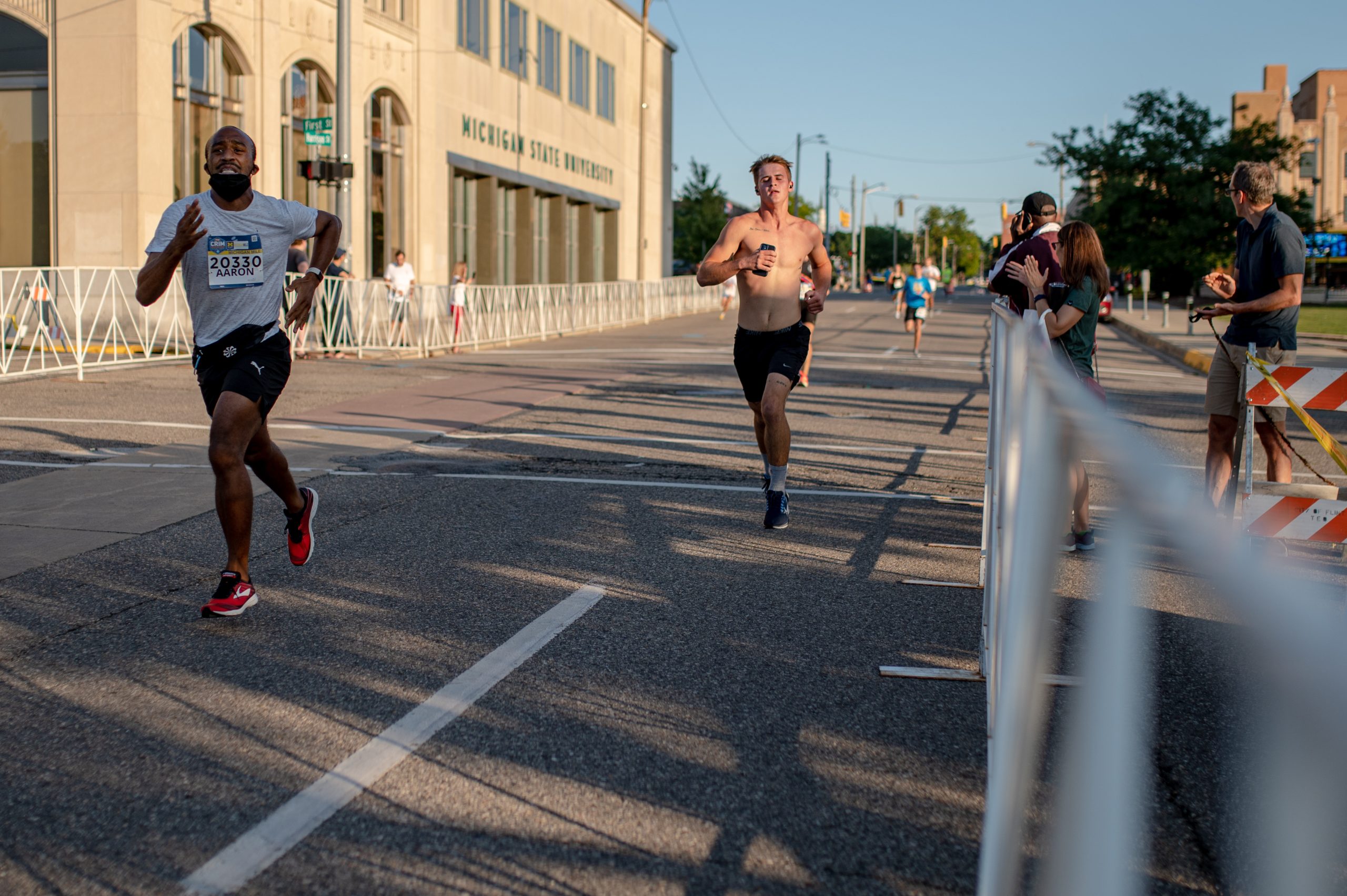 Racers compete in the Lois Craig Invitational race, the first race in the Crim Festival of Races, in Downtown Flint, Mich. on Friday, Aug. 26, 2022. (Michael Indriolo | Flint Beat)