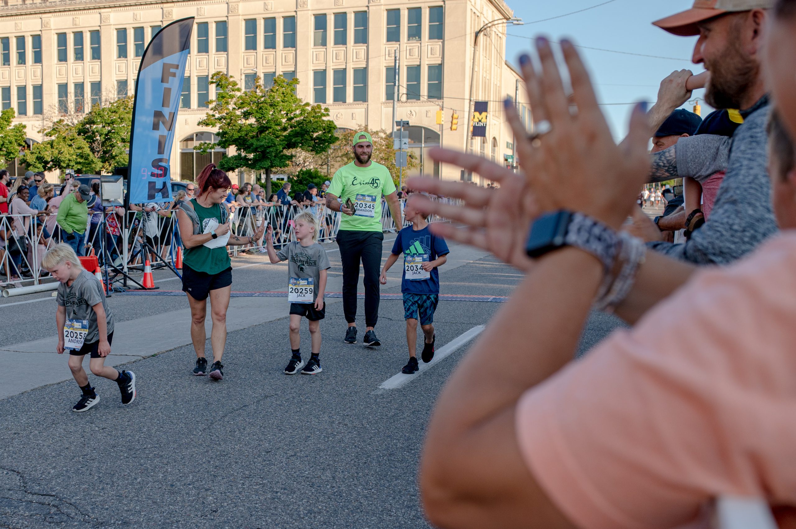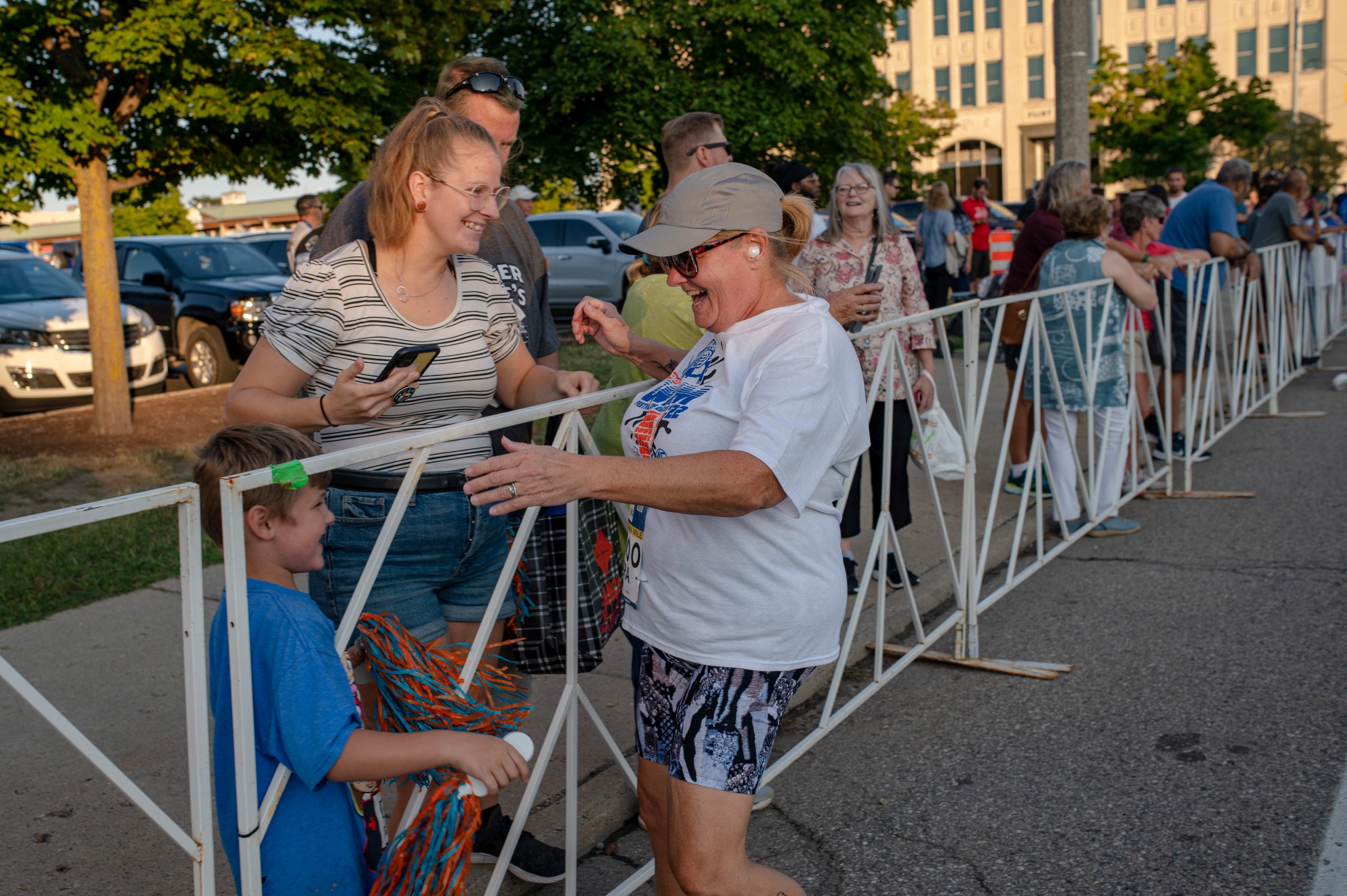 Tammy Kinloch greets her family after finishing the Michigan Mile, a race in the Crim Festival of Races, in Downtown Flint, Mich. on Friday, Aug. 26, 2022. (Michael Indriolo | Flint Beat)