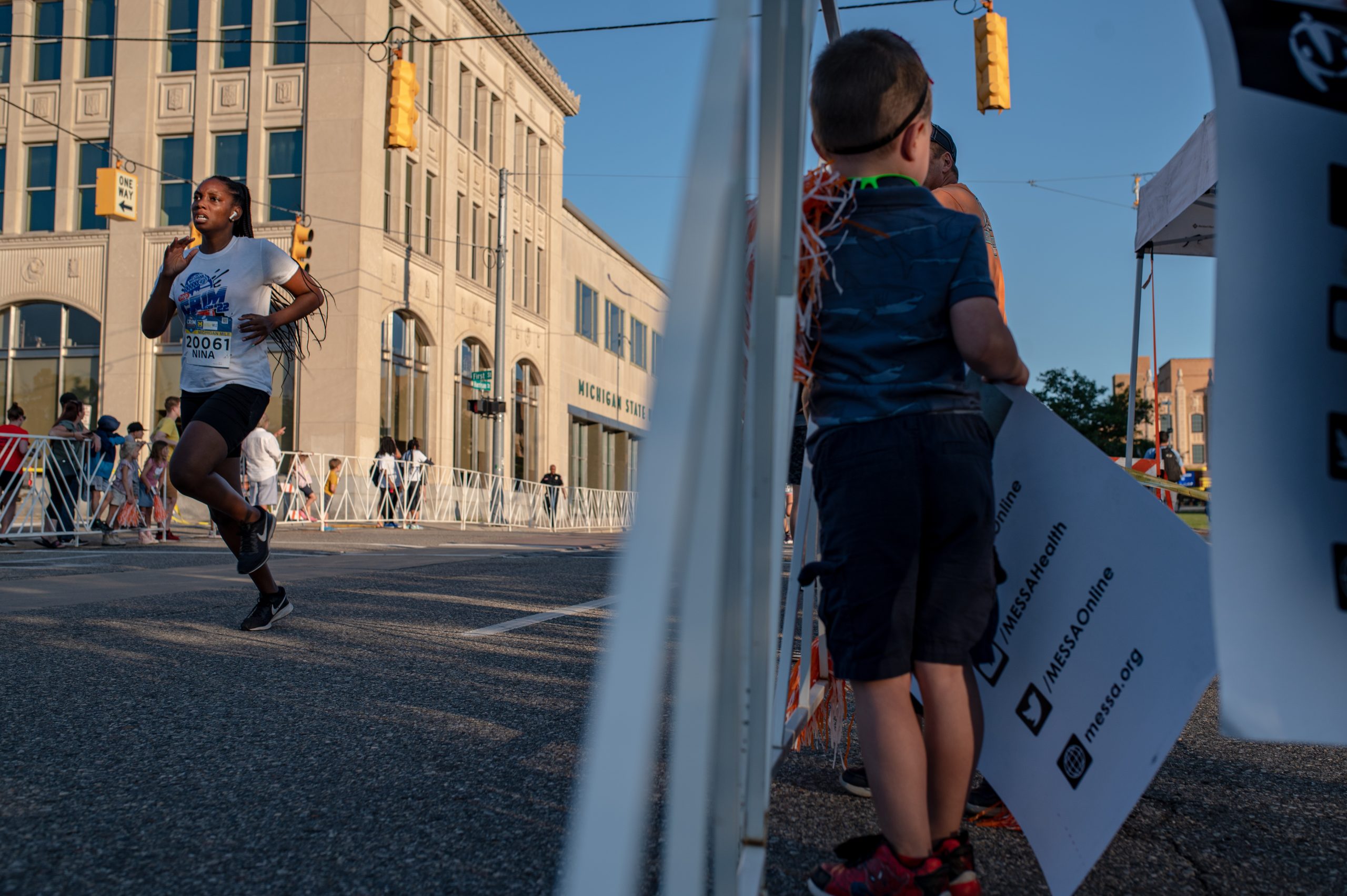 Nina James runs down the final straightaway as spectators cheer during the Michigan Mile, a race in the Crim Festival of Races, in Downtown Flint, Mich. on Friday, Aug. 26, 2022. (Michael Indriolo | Flint Beat)