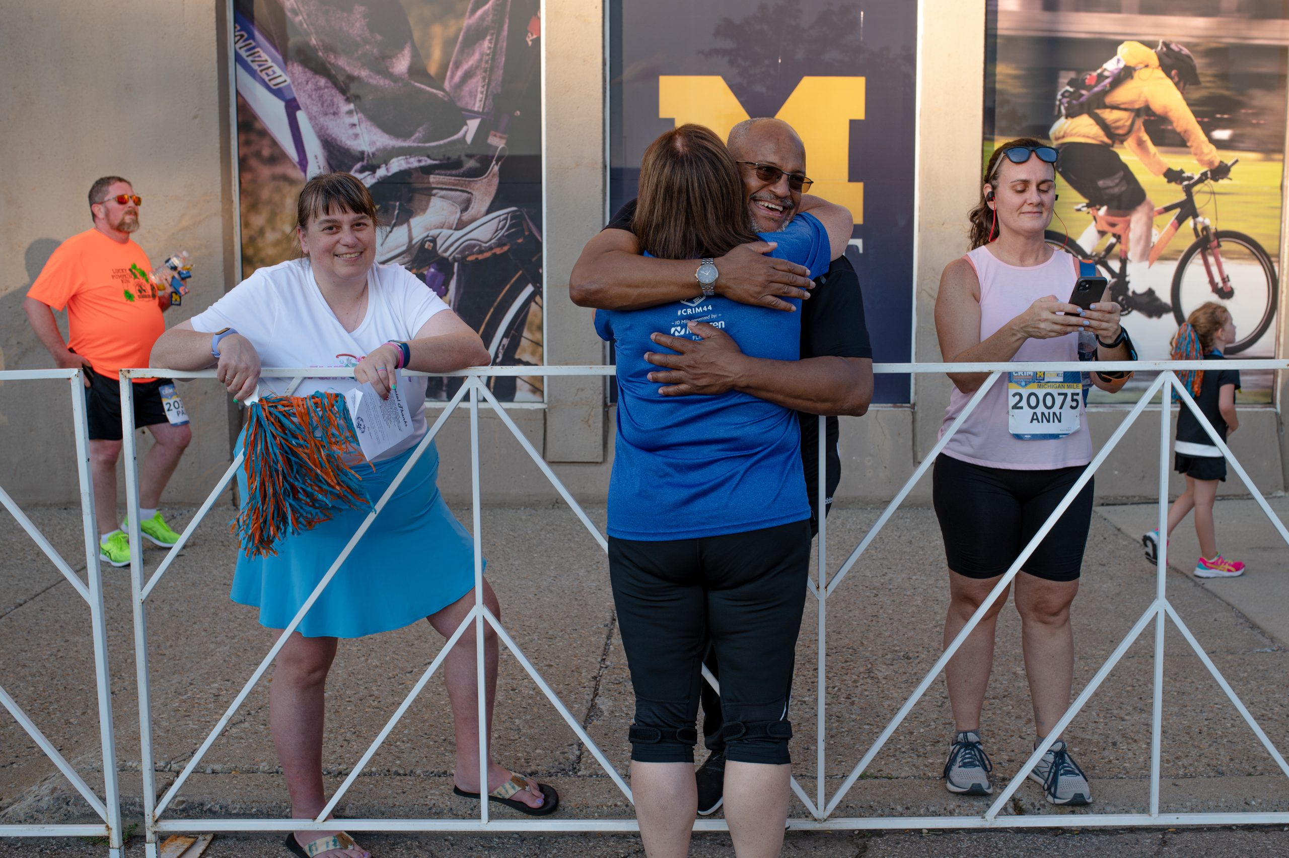 Runner Janette Sullivant hugs Cedric Kendall after finishing the Michigan Mile, a race in the Crim Festival of Races, in Downtown Flint, Mich. on Friday, Aug. 26, 2022. Kendall used to lead a running group Sullivant trained with, he said. (Michael Indriolo | Flint Beat)