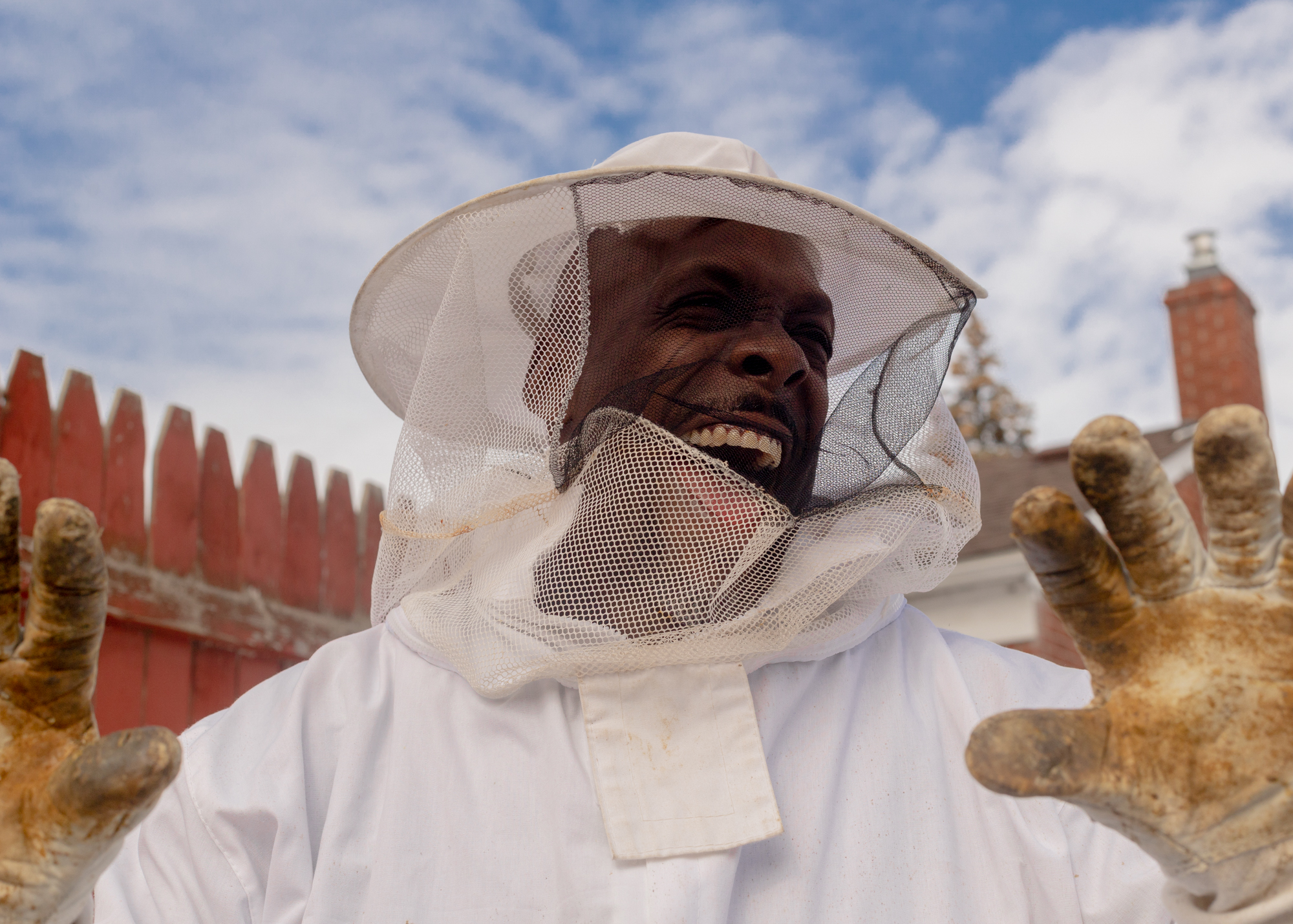 Jason Bey, Flint resident and My Bees Nest owner shows his gloves, coated in residue from beekeeping, on Feb. 28, 2022, Bey went out to the vacant lot next to his house where he keeps his apiary, to look at the remaining honey. (KT Kanazawich | Flint Beat)