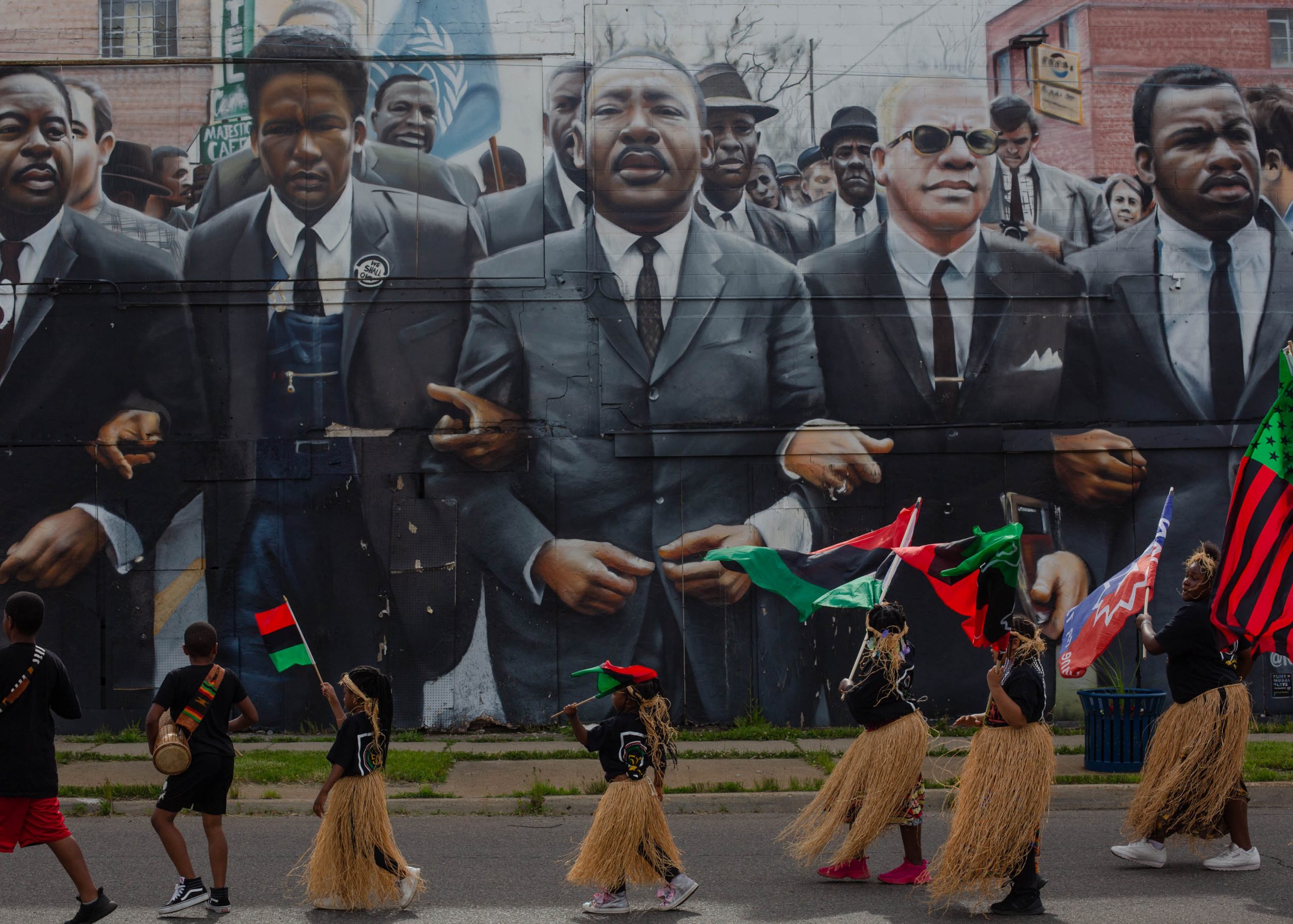 The Kuungana African Drum and Dance Company lead the Juneteenth motorcade from Max Brandon Park to downtown Flint, Mich. on June 19, 2022. (KT Kanazawich | Flint Beat)