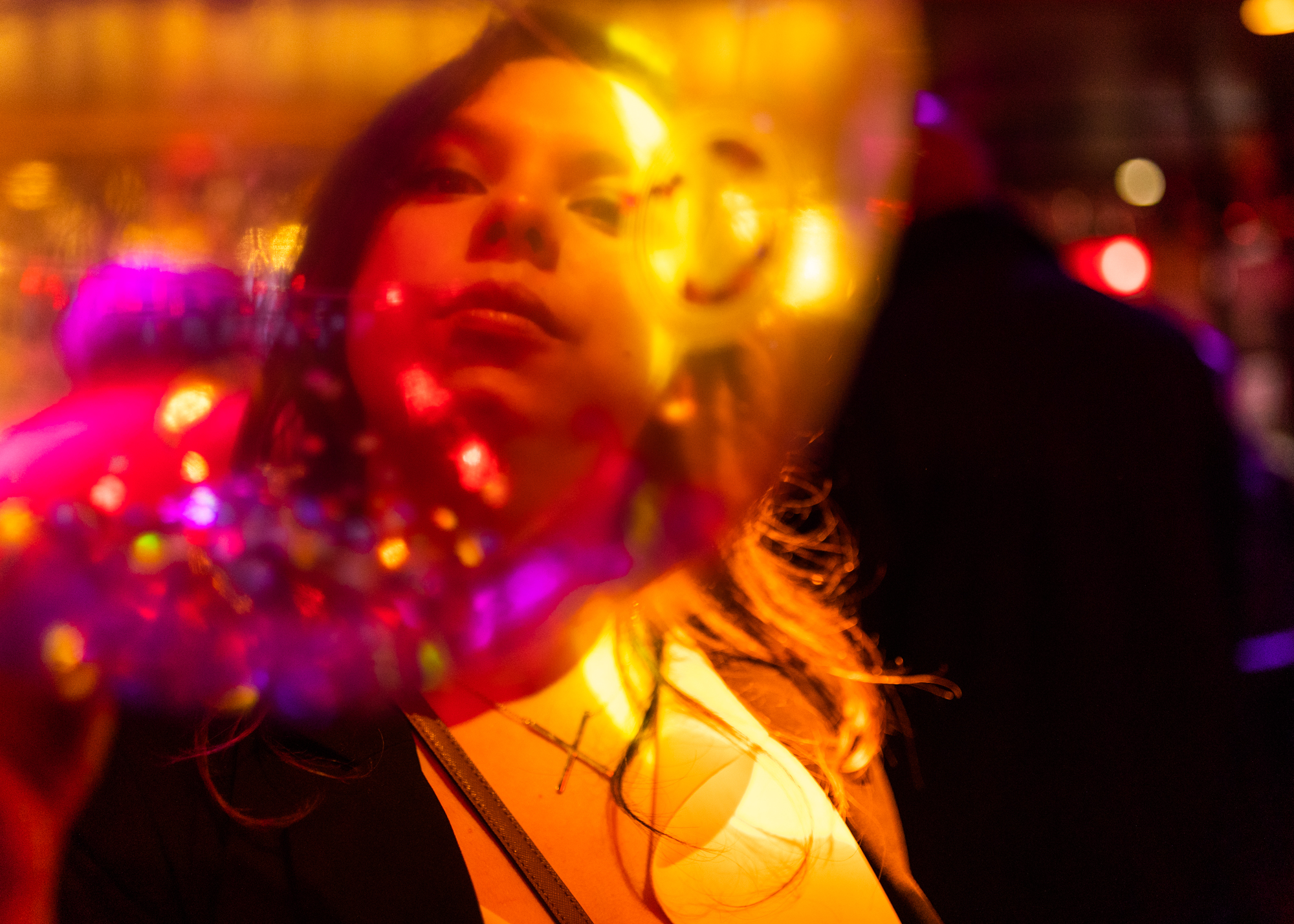 A beach ball passes in front of Flint resident Ximena Kohn’s face during Latin Night at The Loft in downtown Flint, Mich. on April 27, 2022. (KT Kanazawich | Flint Beat)