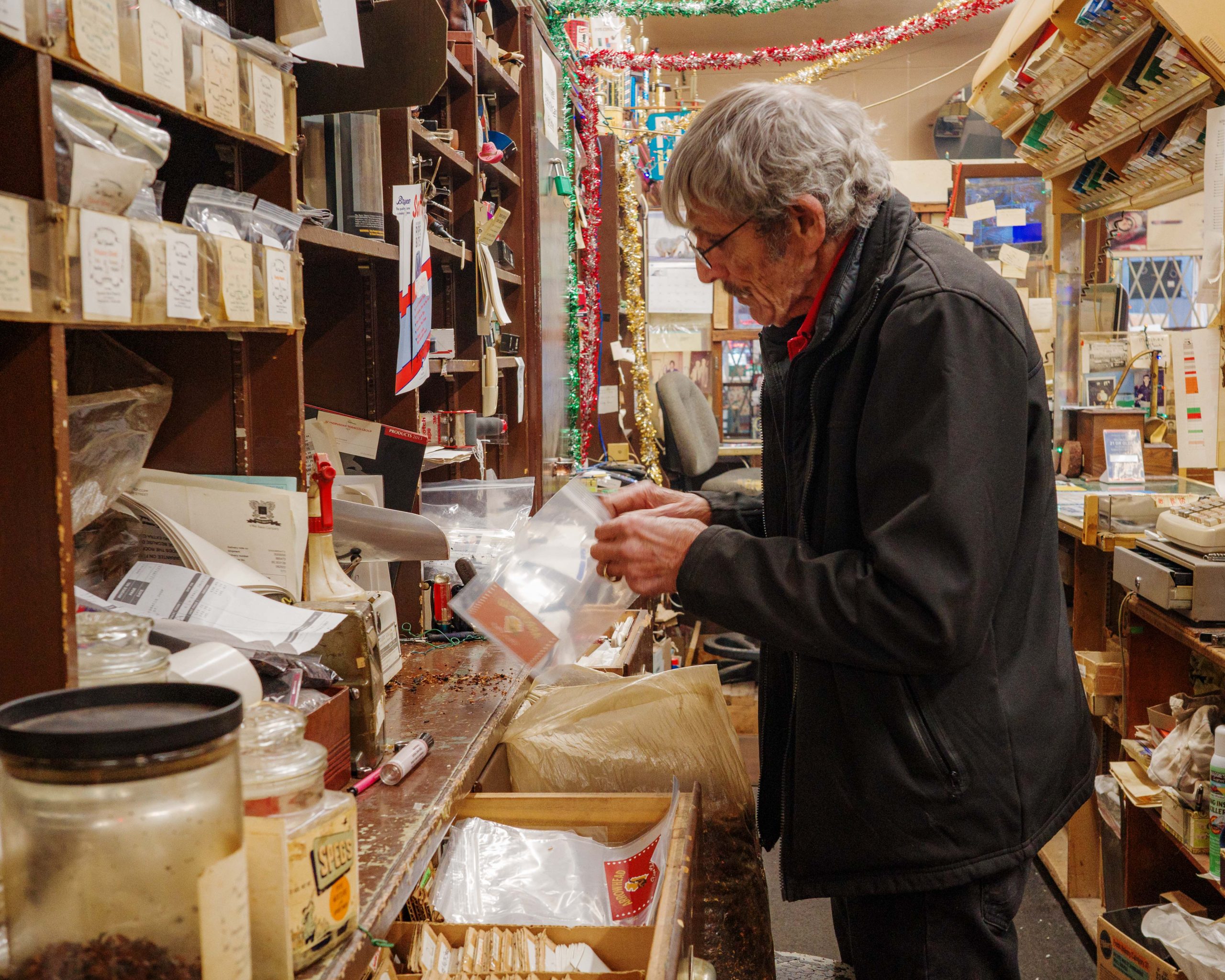 Dan Spaniola, owner of Paul’s Pipe Shop, packs up tobacco in his downtown Flint shop on Tuesday, Dec. 5, 2023. (Michael Indriolo | Flint Beat)