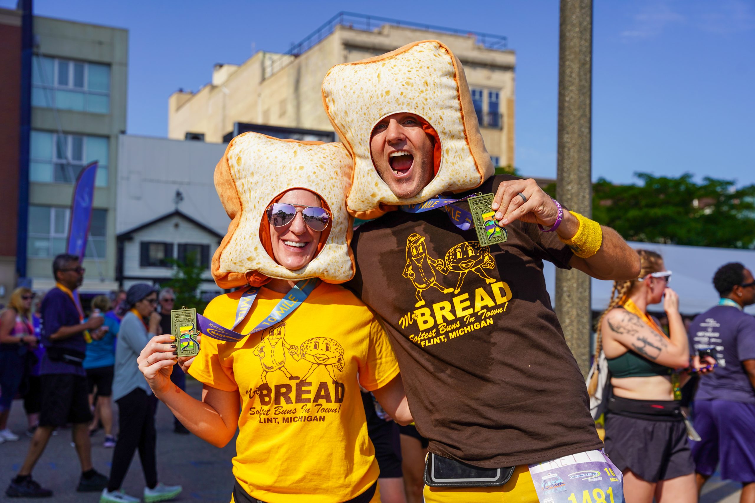 Racers pose with medals they won at the 47th annual HAP Crim Festival of Races in downtown Flint, Mich. on Saturday, Aug. 24, 2024. (Joshua Johnson | Flint Beat)