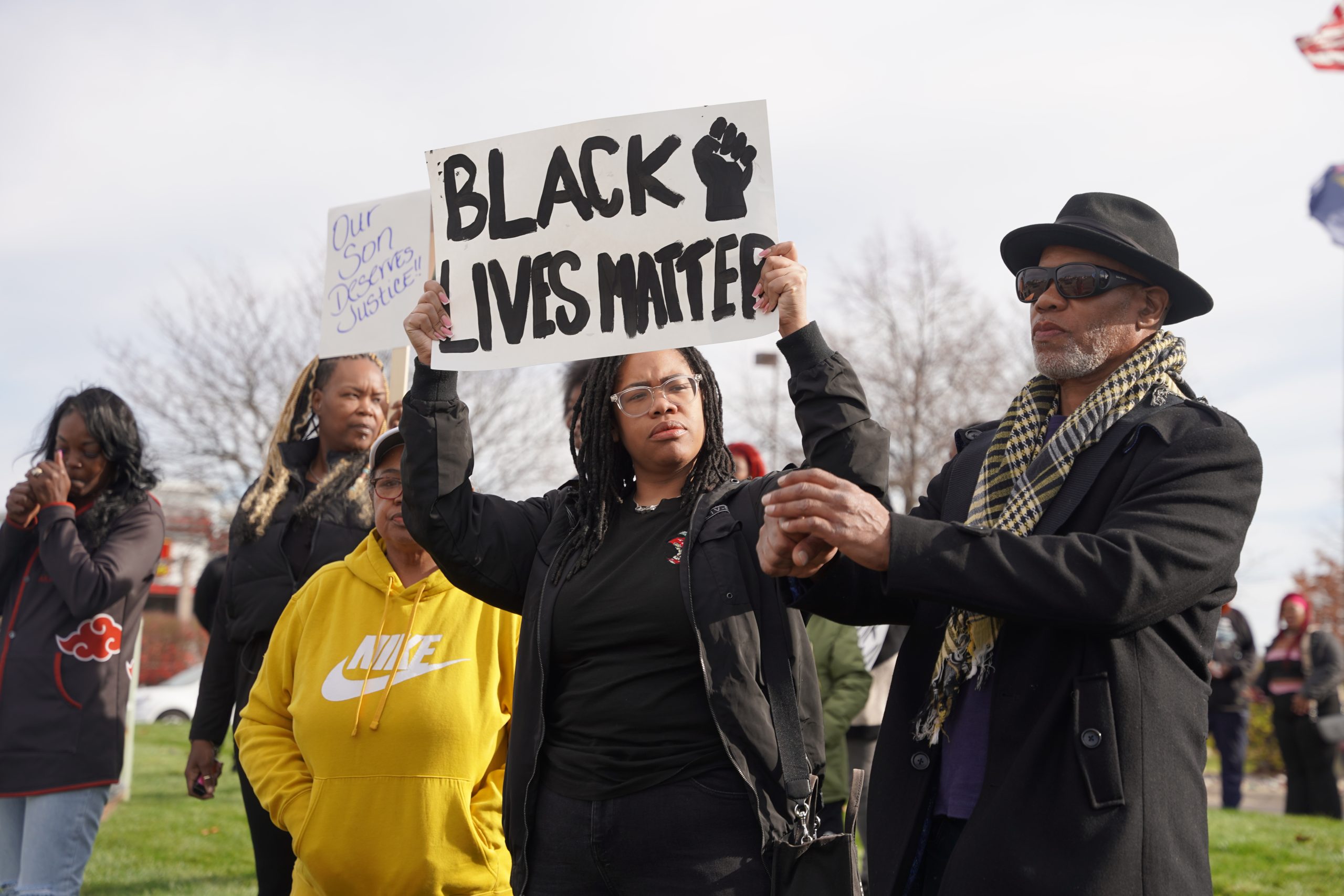 Protesters peacefully protesting for Rayvon Shahid, a 17-year-old Flint teen who was shot and killed by the Michigan State Police on Nov. 2, 2024, gathered at the Michigan State Police Post in Flint Township, Mich. asking for justice on Nov. 9. (Flint Beat | Joshua Johnson)